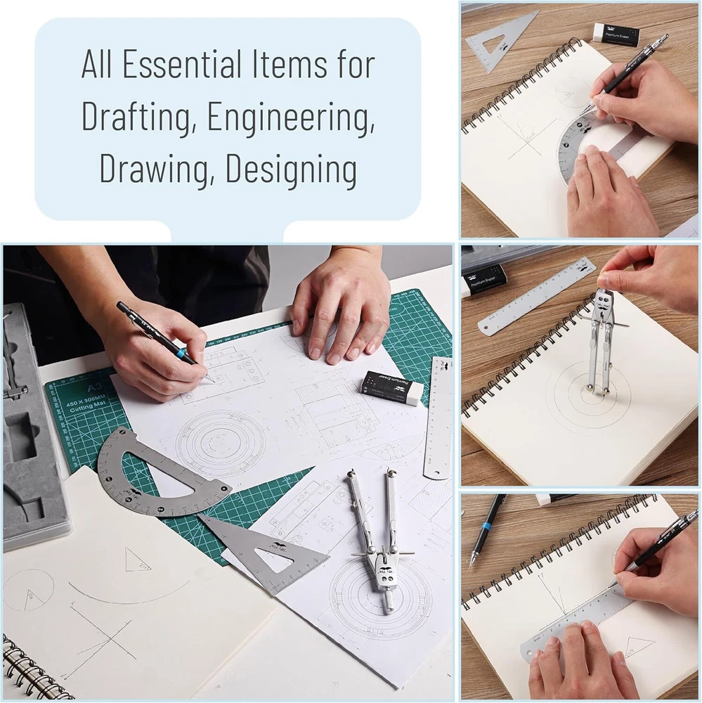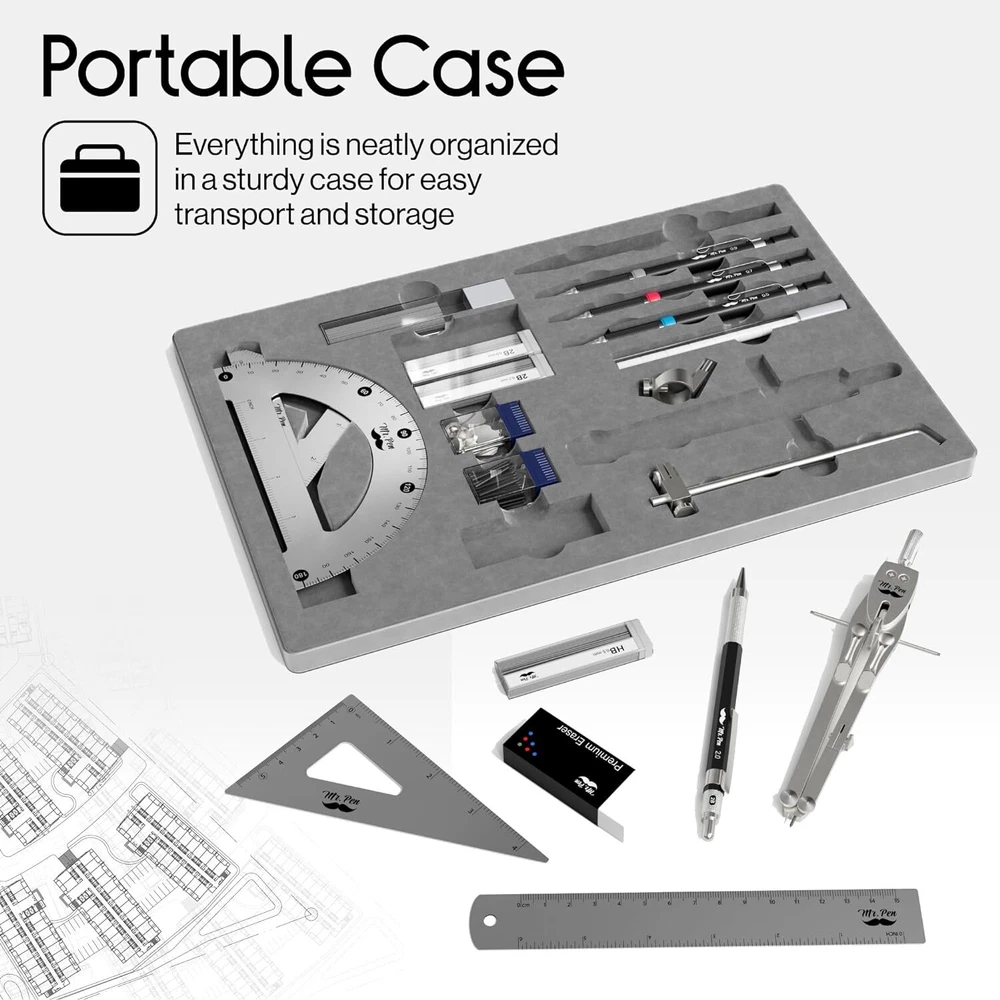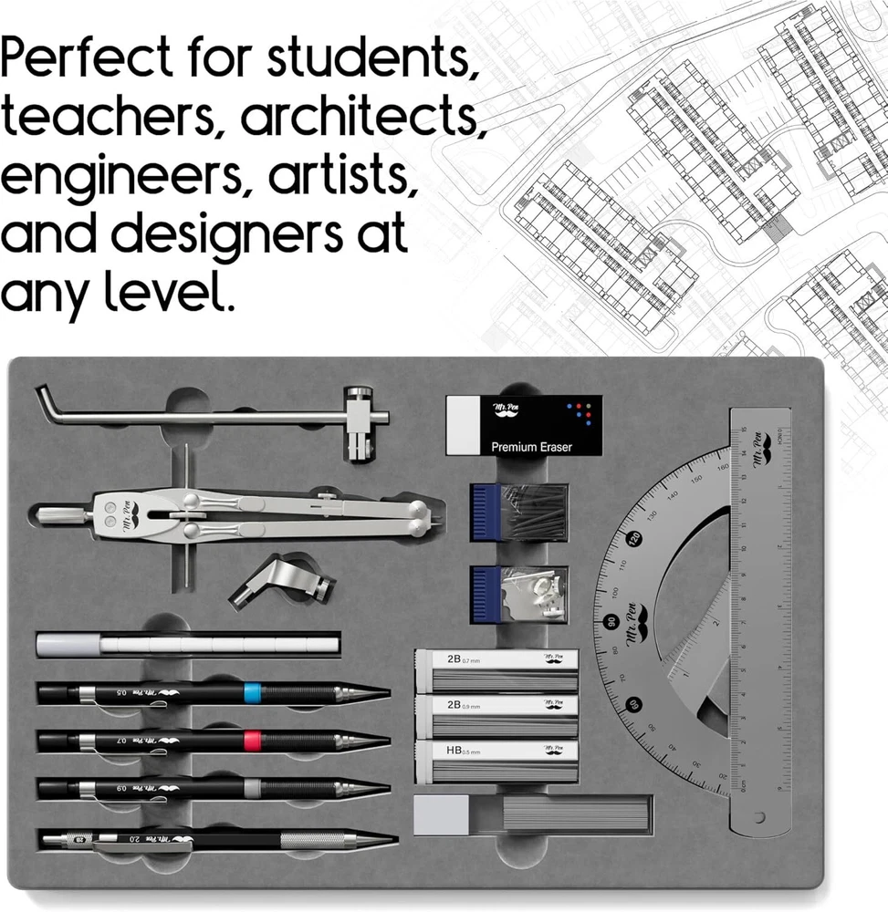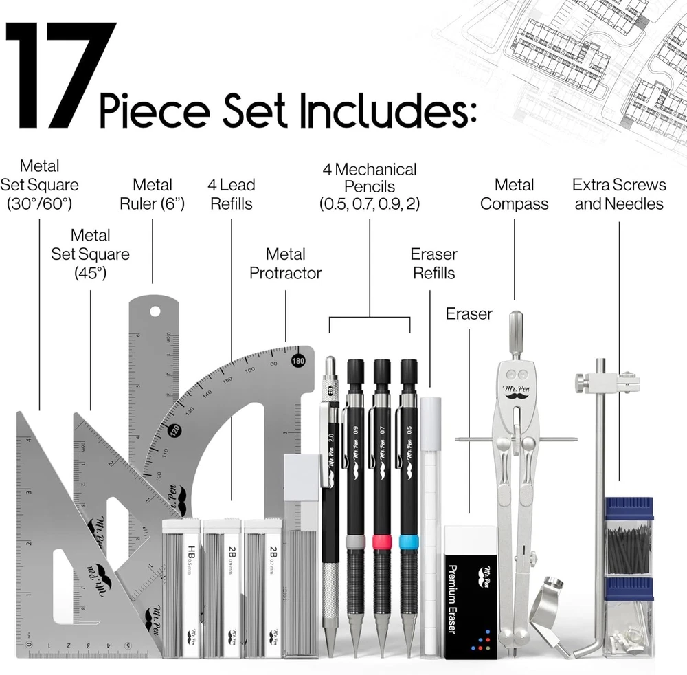 Mr. Pen- Professional Geometry Set, 17 pcs, Silver Geometry Kit for Artists, Metal Rulers and Compasses, Mechanical Pencil Set, Drafting Tools & Drafting kits, Metal Compass and Protractor Set Product Details Manufacturer: Mr. Pen Brand: Mr. Pen Item Weight: 1.3 pounds Package Dimensions: 13.74 x 9.06 x 0.87 inches Item model number: EEEG007M311 Material Type: Metal Point Type: Broad Line Size: 0_5mm, 0_7mm, 0_9mm, 2mm Manufacturer Part Number: EEEG007M311 Brand: Mr. Pen Writing Instrument Form: Mechanical Graphite Pencil Age Range (Description): Kid, Adult Material: Metal Point Type: Broad Mr. Pen mechanical pencil set includes 4 versatile sizes (0.5, 0.7, 0.9, and 2mm) to cater to a wide range of drawing and writing needs, providing precision and versatility for technical drawings, sketches, and general writing. Crafted with a robust construction, these mechanical pencils offer a balanced weight that ensures comfortable handling and reduced fatigue during long drawing sessions or extensive writing work. This set is not just about pencils; it also includes a metal compass with an extension leg, extra screws and needles, eraser refills, and four tubes of lead refills, making it a complete package for professionals and students alike. For detailed measurement and drawing, the set comes equipped with a metal protractor, a 6-inch metal ruler, and two set squares (45° and 30°/60°), enhancing the functionality for all levels of drafting and design projects. Everything is neatly organized in a sturdy case, ensuring that all tools are secure and easily transportable, making it an ideal choice for architects, engineers, artists, and anyone who desires a reliable and comprehensive drawing toolkit. Mr. Pen mechanical pencil set includes 4 versatile sizes (0.5, 0.7, 0.9, and 2mm) to cater to a wide range of drawing and writing needs, providing precision and versatility for technical drawings, sketches, and general writing.Crafted with a robust construction, these mechanical pencils offer a balanced weight that ensures comfortable handling and reduced fatigue during long drawing sessions or extensive writing set is not just about pencils; it also includes a metal compass with an extension leg, extra screws and needles, eraser refills, and four tubes of lead refills, making it a complete package for professionals and students detailed measurement and drawing, the set comes equipped with a metal protractor, a 6-inch metal ruler, and two set squares (45° and 30°/60°), enhancing the functionality for all levels of drafting and design projects.Everything is neatly organized in a sturdy case, ensuring that all tools are secure and easily transportable, making it an ideal choice for architects, engineers, artists, and anyone who desires a reliable and comprehensive drawing toolkit.