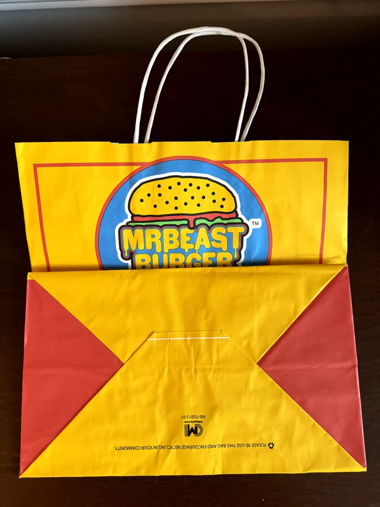 An original yellow MrBeast Burger bag, truly a great collectible from the biggest YouTube creator of all time. The bag is in great condition, no stains and only neat folding lines. Size: Width: 11 3/4inch / 30cm Height when flat: 11 3/4inch / 30cm Material: paper with white paper handles Received from a Mr Beast Burger order in MrBeast's hometown of Greenville, NC in January 2022.