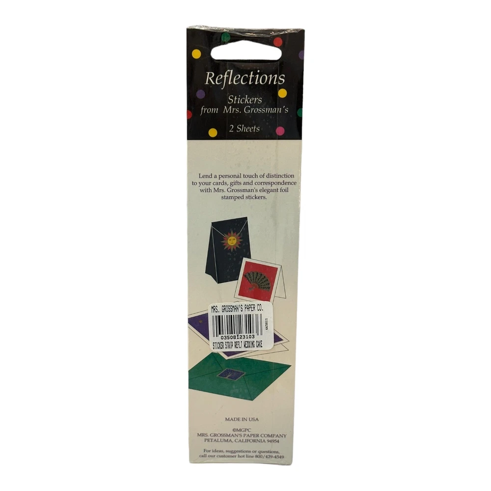 DESCRIPTION/CONDITION (1) Sealed pack of 2 Sheets of Mrs. Grossman's Reflections stickers Design is of four tier wedding cake decorated with pink flowers with greens and accented with silver foil which adds a layer dimension to the stickers Sticker strips measure approximately 2 1/4 inches wide x 6 1/2 inches long While the item is new in package there could be some wear to the packaging, including some cracks in the plastic, or original price labels which does not affect the stickers. Please review all photos carefully as they are part of the description and can best describe the condition. Thank you for stopping by and supporting my small business, we are so grateful for our customers and hope that you are satisfied with your purchase from the time you "click" BUY! Please review our policies below. COMMUNICATIONS Contact Me - I do my best to describe items as if they do not have photos and to photograph items as if they don't have a description. However, I am human and may miss and important detail or one that is important to you. Contact me, I do my best to answer questions promptly and accurately and provide you with additional photos if needed. Offers - Most of my items do allow for a best offer, I am always up for reasonable offers, multi order discounts, and do my best to offer you a deal so we are both happy, you are welcome to hit the make an offer button, or send me a message. Most reasonable offers are not refused. SHIPPING & HANDLING Mailing Address - We will ONLY ship to the address on file with eBay. Before making a purchase, please ensure that your address is correct. We may otherwise cancel the sale. Handling Time - Our handling time is set to ONE BUSINESS DAY. We ship packages Monday - Friday, with the exception of holidays. Combined Invoices - We will combine shipping if purchases can shipped safely combined. I can send you and invoice, but if you paid, I will send you a refund for the shipping overage. Insurance - All items are shipped with USPS Priority are insured up to the value. Calculated Shipping - Our shipping fees are calculated based on weight and dimensions. We ship primarily with USPS, but will do our best to find you the best price for shipping which means we may ship UPS Ground or FedEx Ground at times. Please reach out if you would like to expedite your shipping time so we can give you a quote and update the list. Quick turn requests may lead to a small handling fee as my storage is offsite. PAYMENT Payment - Pay ment is expected at the time of purchase unless an agreement is made prior. Non-Paying Bidders - Unpaid item cases are opened after four days of non-payment unless other arrangements are made. Non-paying bidders are blocked from future transactions. Cancelled Transactions - If you request to cancel the sale without a valid reason, you will be blocked from future transactions.