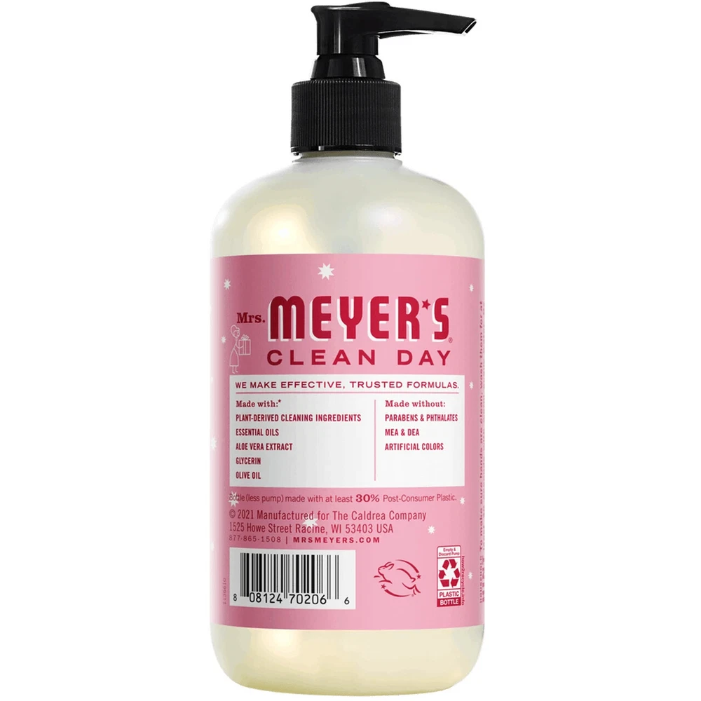 Details Ingredients Hardworking, nondrying soap for busy hands Hand Soap made with essential oils, aloe vera, olive oil and other thoughtfully chosen ingredients Mrs. Meyer's products are made with cruelty-free formulas and are Leaping Bunny certified Cool Peppermint, touched with a hint of vanilla, smells perfectly heartwarming