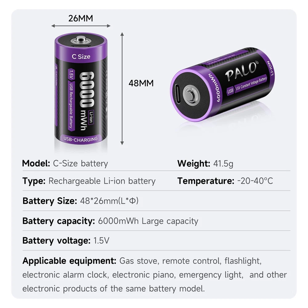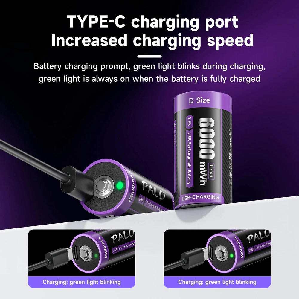 【High Quality C BATTERY】High Quality Rechargeable Lithium ion C Cell Batteries Have Long Lifetime,It Can Be Charged 1500 Times,1 pcs D Rechargeable Battery Equal 1500+pcs Disposables Alkaline D Battery. 【LED INDICATORS MANAGEMENT】When charging, the green LED will blinks and will then LED remains on once it is fully charged. 【MULTIPLE SAFE PROTECTION】Built-in Integrated safety circuit protects Battery from over discharge/overcharge,when the battery is fully charged,Effectively Prevent Overcharge, Overcurrent, Over-voltage, Overheat, and Short Circuit Conditions. 【ENERGY SAVING & ECO FRIENDLY】Mercury, cadmium and lead are not used in these C lithium small batteries, saving thousands of alkaline batteries and reducing a significant about of landfill waste. 【Compatibility】Power up any device that uses standard C batteries, including flashlights, transmitters, , radio receivers, boomboxes, toys and other electronics for long lasting, dependable operation.