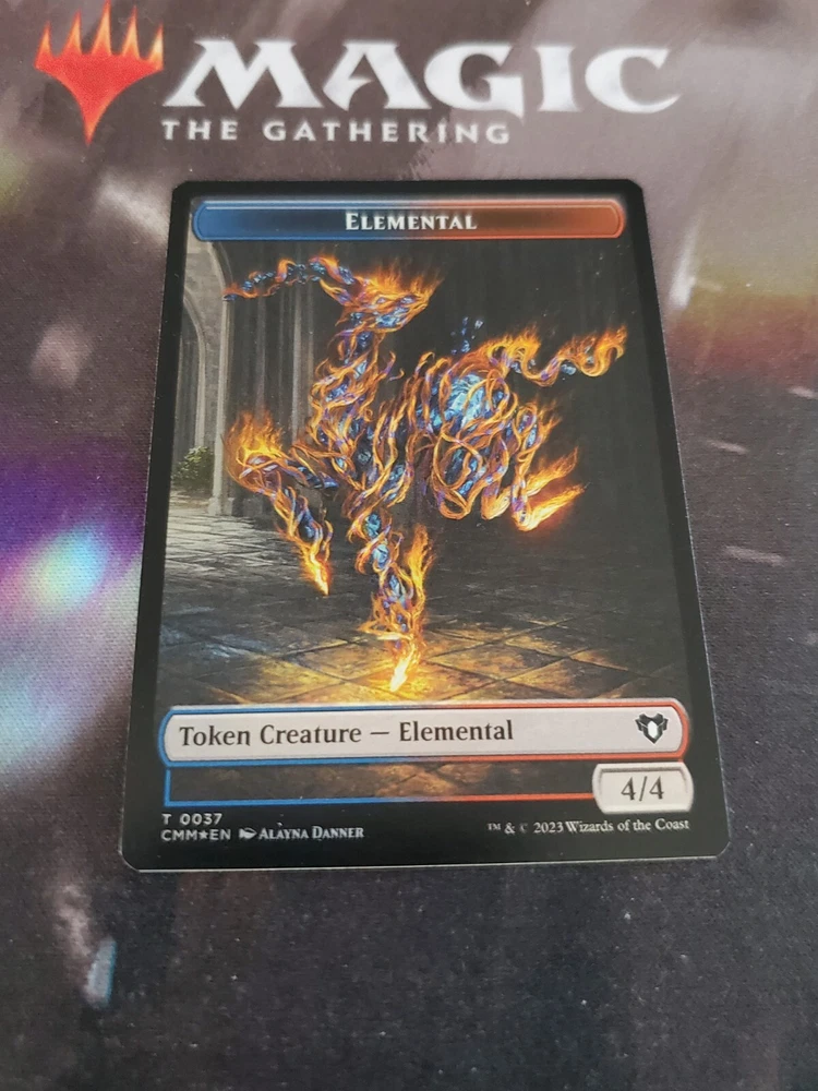 This double-sided token features an Elemental creature on one side and a Treasure artifact on the other. It is a rare and valuable addition to any Magic: The Gathering player's collection, particularly those who enjoy the Commander format. The card is in near mint condition or better, and has a stunning foil finish that makes it truly stand out. This Commander Masters token is ungraded, but its quality speaks for itself. Whether you're a collector or a player, this Treasure/Elemental token is a must-have item. Don't miss out on the chance to add it to your collection.