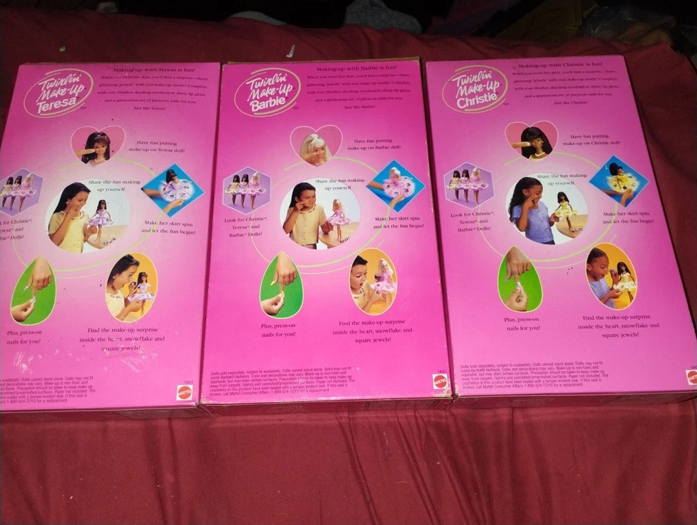 Introducing the 3 Mattel Twirlin' Make-up Barbie Doll from 1997, a collector's edition doll that comes with a gift set and original packaging. This 11 1/2 inch Barbie doll has blonde wavy hair, blue eyes, and a light complexion. The doll is an original Mattel product and was manufactured in China. This Barbie doll is perfect for all occasions and is ideal for teens, adults, and youth. The doll is part of the Athlete Barbie collection and has a vintage feel to it. The packaging is original and has never been opened. This hard plastic doll is perfect for collectors and Barbie enthusiasts alike.