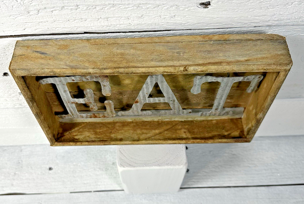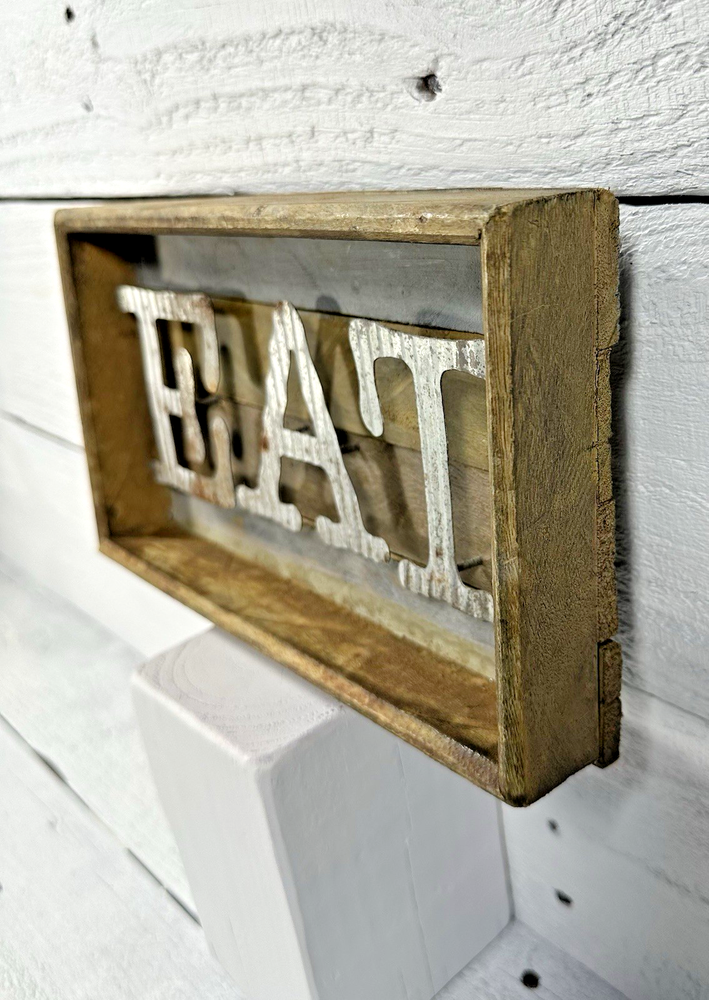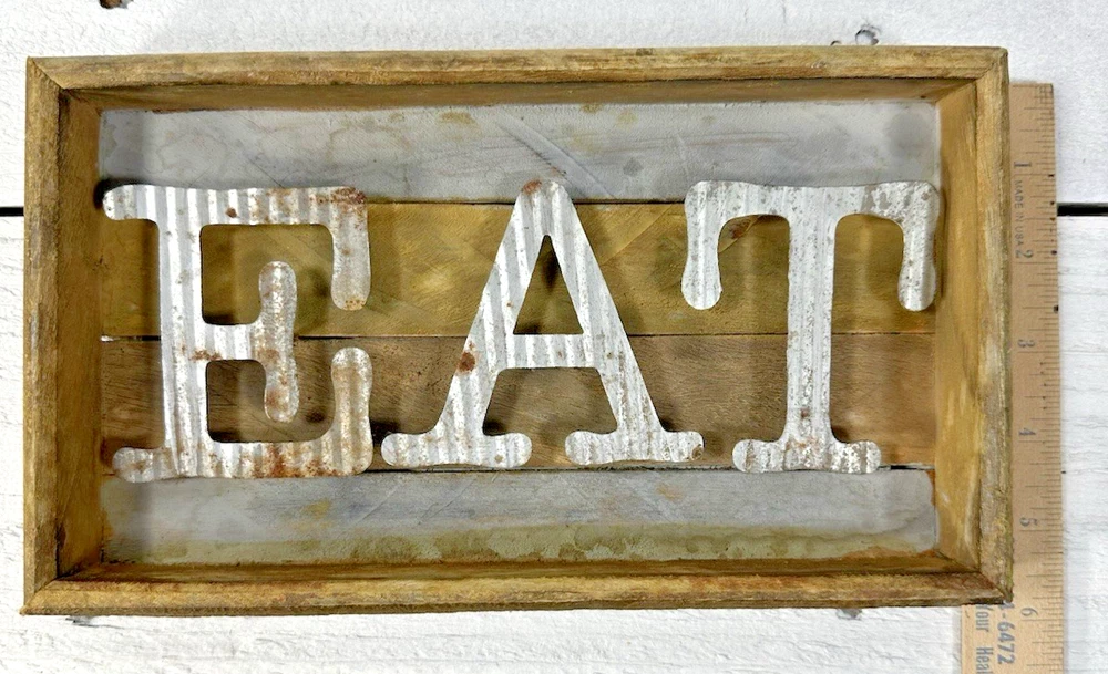 Measuring approximately 9-3/4" long x 5-1/2" tall x 1-1/2" front to back. Add a touch of rustic charm to your kitchen with this Mud Pie EAT sign. The wooden sign features a rectangular shape with a brown finish and silver-tone letters that spell out "EAT". This sign can be hung on the wall or placed on a shelf as a decorative piece. Perfect for a farmhouse or café & bistro themed kitchen, this sign is a great addition to your home decor. The sign is made of high-quality wood and metal materials and does not require any additional parts to function. Personalize your kitchen with this unique and stylish sign that is sure to impress your guests Please refer to all photos for adequate description of product. Smoke free home. Handling time - 2 business day, once payment clears item will be shipped