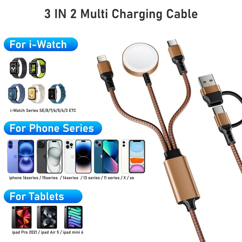 Multi 3 in 2 Charging Cable for Apple Watch Charger, Travel for iPhone Charger U Features: 【3 in 2 Travel Charger】This versatile charging solution offers 6 ways to power up your devices: USB C/A to Watch charger, USB C/A for Phone, and USB C/A to Type C Cable. It supports simultaneous charging of up to 3 devices with a USB C/A adapter (not included). Compatible with iWatch ultra/SE 1/2 series 9/8/7/6/5/4/3/2/1,the Compatible with iPhone14/13/12/Pro/Max/iPad,USB C compatible with iPhone 15/15 Pro/15 Plus/15 Pro Max,Samsung Galaxy S23/ S23+/ S23 Ultra/S22/ S21/ S20/ S20+ other android phones. 【Multi Charging Cord Fast Charging】The Type C to Phone cable supports fast charging up to 2.22A Max, delivering efficient power to your devices. Charge your Phone from 0% to 45% within 35 minutes, and your Watch up to 50% within 45 minutes. Recommended 20W USB-C Power Adapter (not included). 【Travel Friendly & Convenient Length】This 6-foot 3-in-2 charging cable features Velcro and a storage pouch for fast charging and convenient storage, making it perfect for use on the go. Whether you're traveling, at home or in the office, you can conveniently charge your devices anytime, anywhere. 【Professional materials & and durability】This charger is made of durable nylon braided wire and equipped with an aluminum shell for durability. Lab-tested to withstand 40,000 bends, it lasts longer than standard cables. The watch's charging head has been upgraded to be more stable, so the watch is less likely to fall off and interrupt charging. 【What You Get】3 in 2 Travel Charging *1 & Storage bag *1, Worry-free 24-month warranty and 24/7 customer service. Features: 【3 in 2 Travel Charger】This versatile charging solution offers 6 ways to power up your devices: USB C/A to Watch charger, USB C/A for Phone, and USB C/A to Type C Cable. It supports simultaneous charging of up to 3 devices with a USB C/A adapter (not included). Compatible with iWatch ultra/SE 1/2 series 9/8/7/6/5/4/3/2/1,the Compatible with iPhone14/13/12/Pro/Max/iPad,USB C compatible with iPhone 15/15 Pro/15 Plus/15 Pro Max,Samsung Galaxy S23/ S23+/ S23 Ultra/S22/ S21/ S20/ S20+ other android phones. 【Multi Charging Cord Fast Charging】The Type C to Phone cable supports fast charging up to 2.22A Max, delivering efficient power to your devices. Charge your Phone from 0% to 45% within 35 minutes, and your Watch up to 50% within 45 minutes. Recommended 20W USB-C Power Adapter (not included). 【Travel Friendly & Convenient Length】This 6-foot 3-in-2 charging cable features Velcro and a storage pouch for fast charging and convenient storage, making it perfect for use on the go. Whether you're traveling, at home or in the office, you can conveniently charge your devices anytime, anywhere. 【Professional materials & and durability】This charger is made of durable nylon braided wire and equipped with an aluminum shell for durability. Lab-tested to withstand 40,000 bends, it lasts longer than standard cables. The watch's charging head has been upgraded to be more stable, so the watch is less likely to fall off and interrupt charging. 【What You Get】3 in 2 Travel Charging *1 & Storage bag *1, Worry-free 24-month warranty and 24/7 customer service. eBay integration by