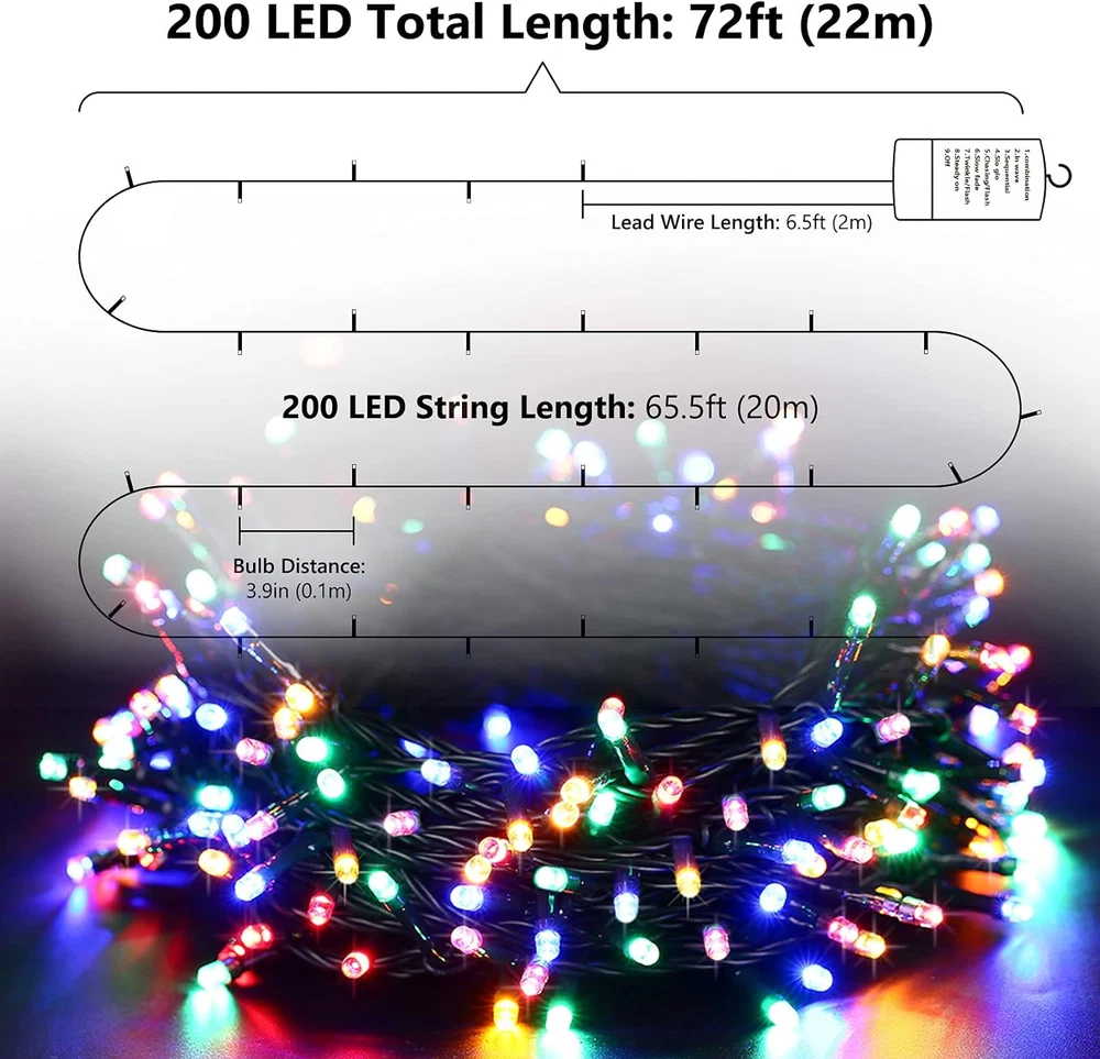 Store New Arrivals Add to Favorite View Feedback Contact Fast deliveries to the customer's home Quality customer service John Make the customers happy! Multi-Color Christmas Lights, 66 Ft 200 LED Battery Operated String Lights Waterproof 8 Modes & Auto Timer Mini Lights for Xmas Decorations, Home, Party, Holiday Decor Outdoor Indoor Description Multi-Color Christmas Lights : Powered by 4*AA battery(not included), press the button on the battery box to switch the xmas lights On/Off and choose 8 different modes to satisfy your diverse needs. Auto Timer & Memory Function: The timer keeps 6 hours "On" and 18 hours "Off" once activated. Free your hands and save energy. Build in Memory chip save your last modes setting and no need to reset mode every day. Waterproof & Easy to install: Outdoor string lights can withstand all kinds of weather, including heavy rain and snow. Hang the battery operated string lights anywhere you like, suitable for indoor and outdoor use. Specification: 200 LED string lights, total length 66ft, lead length 0.98 ft, lamp spacing 3.9in. 8 lighting modes:combination, in waves, sequential, slogs, chasing/flash, slow fade, twinkle/flash, and steady on. Wide Application: Perfect decorations for Christmas, Holiday, Wedding, Party and other celebration occasions, the battery operated string lights can be easily put or hang on trees, windows, doors, fences, etc. Product Description Christmas Lights 66 Ft 200 LED String Lights, 8 Modes, Timer Function for Xmas Decorations Super Bright string lights Ideal light for adding a fantastic and mysterious atmosphere to your backyard, patio, gazebo, lawn, or use as a festoon to celebrate Christmas, Thanksgiving day, party, wedding, graduation in style. Impress your bistro, cafe, or party guests with ambiance. Waterproof Multi-Color Christmas Lights The net string lights are waterproof and designed to withstand light rain or water spills, perfect for outdoor & indoor decoration, but not suitable for heavy rain or snow. Widely Application Multi-Color Christmas string lights Perfect Decoration for Christmas, party, wedding, home, window, shows, hotel, commercial building, shopping center, etc. Easy to Use Easy to Use and Memory Function Easy to use, install 4*AA batteries. Hang the lights anywhere you like, press the button turn it on and set your favorite mode. Timer will keeps 6 hours on /18 hours off each day. What You Get 1 x 200 Led String Lights 1 x Manual Timer & Memory Function&8 Lighting Modes Total Length:66ft (lead length 0.98ft,lamp spacing 0.33ft) LED Qty: 200 Power Supply: 4 * AA battery (NOT INCLUDED) Timer Included: Yes (Repeat 6 hours on and 18 hours off) Applicable area: Indoor & Outdoor Lighting Modes: 8 Modes Wire Color:Green Wire Light Source Type LED Style Traditional Number of Items 1 Power Source Battery Powered Number of Light Sources 200 Control Method Touch Switch Style Push button Theme Holidays Controller Type button Batteries Required? No Material Plastic Seasons winter Package Dimensions 12.05 x 6.69 x 3.27 inches Included Components Energy Efficient Indoor/Outdoor Usage Outdoor Light Color Multicolor Water Resistance Level Waterproof Item Weight 13.4 ounces Occasion Wedding, Christmas Special Features Easy to Install, Waterproof, Weather Resistant, Timer & Memory Special Feature Easy to Install, Waterproof, Weather Resistant, Timer & Memory Color Multicolor Voltage 6 Volts Plug Format Battery ABOUT US We offer the best prices around on high quality products. Our E-store includes media such as books, movies, music and games while offering electronics, toys, sporting apparel, clothing, tools, general home, garden items and more. SHIPPING We are always working hard to ensure your package arrives as soon as possible. Please understand that some factors like weather, high postal traffic, and the performance of shipping companies are outside of our control. We offer free shipping to the lower 48 states and ship within 2 business days of payment, usually sooner. We do not accept P.O. Boxes. Please provide a physical address. For shipping outside of the continental USA, we only use eBay's Global Shipping Program. The item is shipped to KY and then sent to the rest of the world. International customers are responsible for all duties and taxes. Continue to 'check out' to calculate costs for shipping the item to your country. Messages regarding eBay's Global Shipping Program MUST be directed at eBay EXCLUSIVELY. RETURNS We offer a 30-Day Return Policy on items in which you are not completely satisfied with. You have the option of a full-refund or an exchange of the item. No returns are available on items shipped outside of the USA PAYMENT We accept PayPal. CONTACT US This page content is yet to come Please ad us to your favorite seller and visit again later Thank You CUSTOMER SATISFACTION We try our very best to make sure every customer is completely satisfied. If there's a problem, message us! We're happy to help. WE ACCEPT