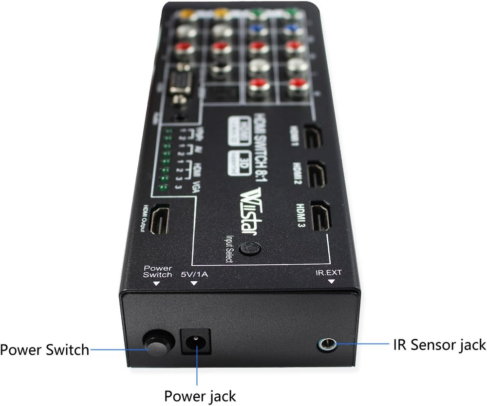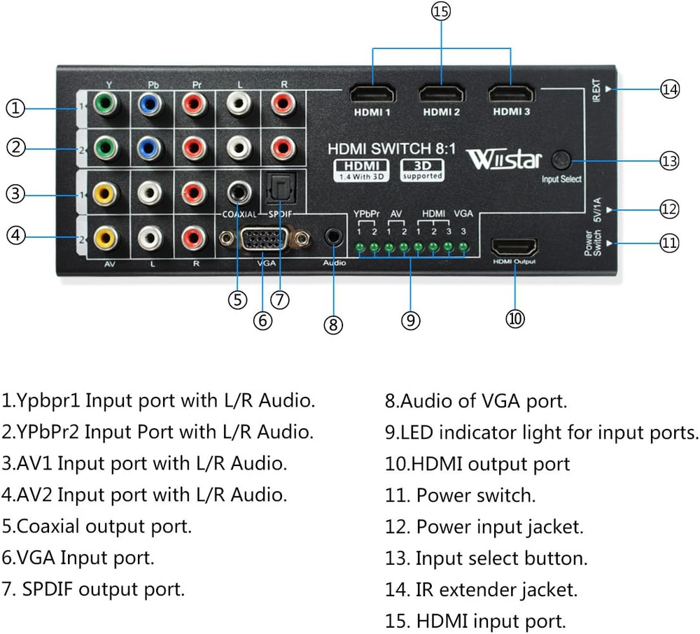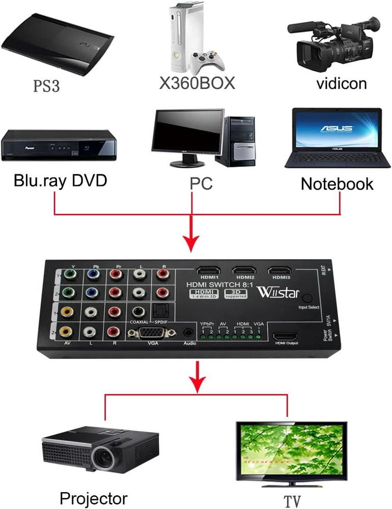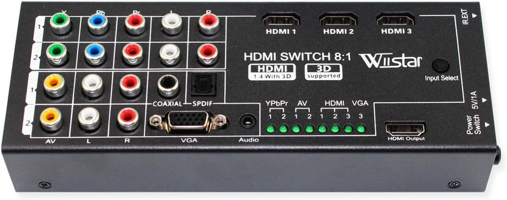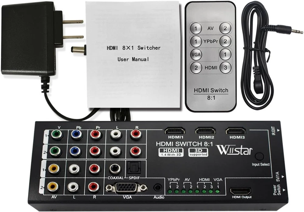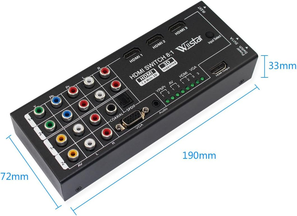 Multi-Functional HDMI Converter with 8 Inputs (VGA + AV + Ypbpr Component + HDMI) to 3 Output HDMI+COAXIAL+SPDIF EDID Manipulation Feature to Support 2CH Stereo, 5.1/6CH or 7.1/8CH Surround Sound for 1080P TV Inputs contains 2x YPbPR / Component Video, 2x AV, 1x VGA, and 3x HDMI The Optima for Digital Entertainment Center for Wii, Xbox, PS, DVD, Blu-ray, STB, etc HDMI v1.3, supports HDMI v1.4 3D Product description P roduct Description This device offers the ultimate solutions for digital entertainment center, HDTV retail or show sites, HDTV, STB, DVD and projector factory, conference presentation, school or corporate training environments. You can manage all your various audio and video sources together from analog AV to 3D HDMI with surround sound capability for your latest HDTV home theater setup. Features: Input ports: 3 x HDMI, 2 x Component/YPbPr/RGB, 2 x AV/Composite/RCA, 1x VGA Output ports: 1x HDMI, 1 x Spdif, 1x Coaxial Automatically upscale 480i and 576i to 480P and 576P on component and AV inputs HDMI v1.3, supports HDMI v1.4 3D Specifications: - 8 inputs to HDMI +COAXIAL+SPDIF output multi-function video / audio switch - Inputs contains 2x YPbPR / Component Video, 2x AV, 1x VGA, 3x HDMI - Allows display to view any 1 of the 8 sources - EDID Manipulation Feature to Support 2CH Stereo, 5.1/6CH or 7.1/8CH Surround Sound from HDMI inputs; for 1080P HDTV home theater setup - Supports output formats 480P, 576P, 720P, 1080i to 1080P with 3D - Delivers uncompressed digital video without signal loss - Dual switching modes: IR Remote or Manual Button on the Unit Notes Please change the audio setting to Stereo in your Apple TV in order to have sound output, only for Apple TV. Sometimes we would make a small adjust with the product appearance,so maybe the appearance of the product you receive not the same as the website shows compeletely, please don't worry.The product is the same as before. Package Contents: Multi-Functional HDMI Converter Switch 8 in 1 out *1 US Standard Power Adapter 100-240V *1 Remote Control *1 IR Sensor (enable you to hide the switch while still be able to control it with remote) *1 User Manual *1