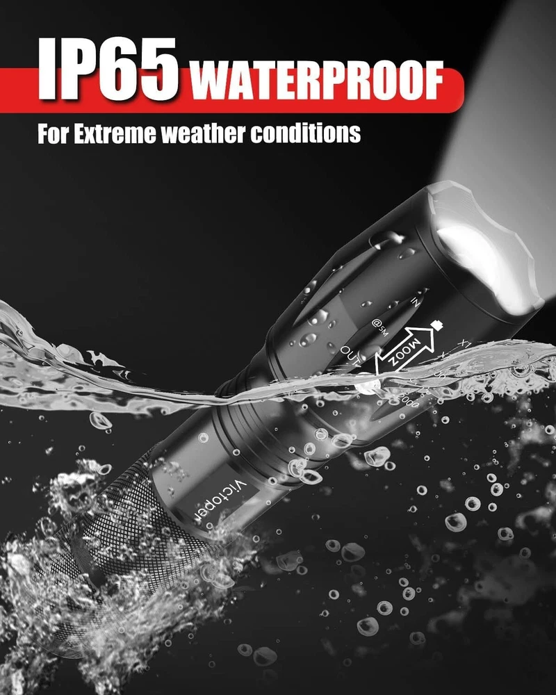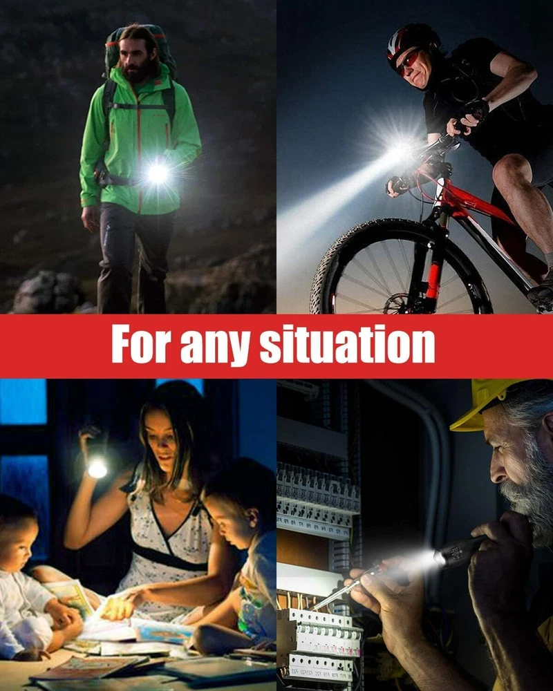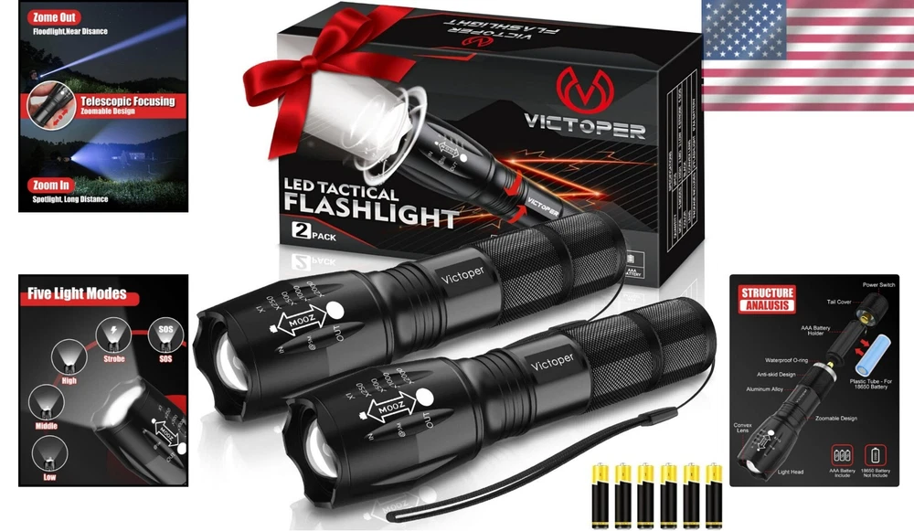 Lumens: 2000 lumens Brightness: 2000 Lumen Batteries: 6 Aaa Batteries Required. (included) Runtime: 50000 Hours Brand: Unbranded Personalize: No Item Package Quantity: 2 Included Components: Battery, Case Light Source Type: Led Shape: Pen Number of Batteries: 6 gtin13: Does not apply Battery Technology: AAA Features: Batteries Included, long range, adjustable light modes, high power, adjustable focus, impact resistant, waterproof, dustproof, wear-resistant Battery Cell Composition: Alkaline Water Resistance Level: Waterproof Shade Material: Aluminum Light Path Distance: 656 Feet Operating Range: 656 feet Item Height: LED Flashlight Lighting Technology: LED Power Source: Battery Type: Flashlight Voltage: 9 volts Finish Type: Powder Coated White Brightness: 2000 Lumens Specific Uses: Flashlight Light Direction: Adjustable Size: 2 Pack Operating Time: More Than 10 Hours Battery Description: Alkaline Mounting Type: Handheld Finish Types: Powder Coated Item Length: LED Flashlight Material: Aluminum, aircraft-grade alloy, type 3 hard-anodized coating, anti-abrasive coating UPC: Does not apply Number of Lights: 1-3 Shade Color: Black Product Dimensions: 1.4"d X 1.4"w X 5.12"h Color: Black Item Weight: 5 ounces