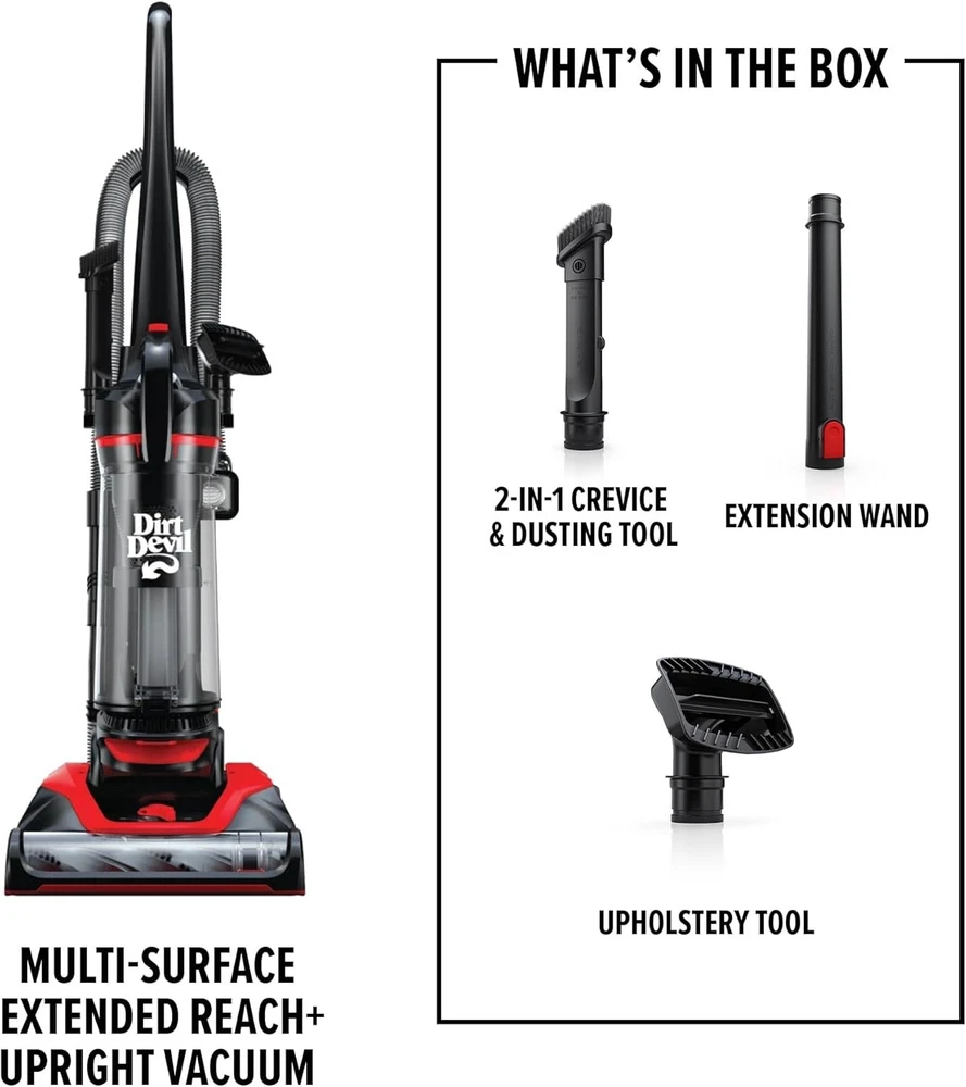 Multi-Surface Extended Reach+ Upright Bagless Vacuum Cleaner for Carpet and Hard Floor, Powerful, Lightweight, Corded Vacuum Cleaners for Home Use Description: EXTENDED REACH CLEANING: Designed to clean hard-to-reach areas and upholstery, The Dirt Devil Multi-Surface Extended Reach+ Upright Vacuum Cleaner lets you clean from floor to ceiling with ease. WHOLE HOME VACUUM CLEANERS: With PowerPass technology and 4 level floor height adjustment, these household vacuum cleaners clean low or high pile carpets and hard floors without scattering dust and dirt for a deep clean in fewer passes. QUICK AND EASY REACH: Our extended reach hose pairs perfectly with the versatile Click Lock tool kit, including the 15” extension wand, 11” 2-in-1 Crevice/Dusting Brush and Upholstery tool, to capture dust, debris and crumbs high and low. EASY-EMPTY DIRT CUP: This Dirt Devil vacuum cleaner features a one touch, easy-release, large dirt cup so you take fewer, quicker and easier trips to the trash. DIRT DEVIL CLEANS EVERYTHING: No one wants to spend their entire Saturday afternoon cleaning. With a variety of versatile, effective tools, Dirt Devil helps you get a better clean, faster.