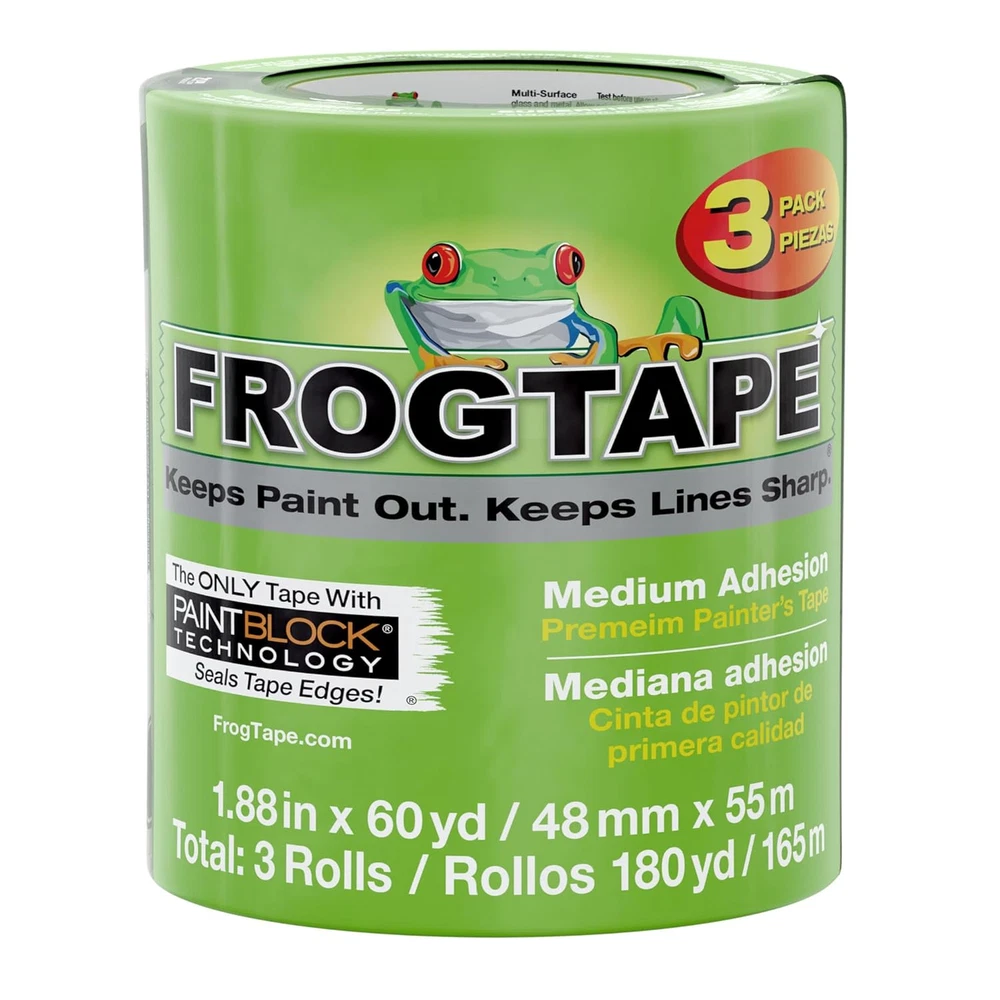 CONTAINS PAINTBLOCK TECHNOLOGY: Premium, multi-surface painter's tape with exclusive PaintBlock Technology to seal tape edges and block paint bleed for super sharp paint lines MEDIUM ADHESION: Ideal for a variety of surfaces such as cured painted walls, baseboards and trim, glass, carpet and metal CLEAN REMOVAL: Removes cleanly from indoor and outdoor surfaces for up to 21 days and is UV-resistant up to 7 days in direct outdoor sunlight NO WAIT TO PAINT: Solvent-free, high performance adhesive bonds quickly to the surface and allows for painting immediately after application FOR BEST RESULTS: Remove tape while paint is still wet for super sharp paint lines and professional-looking results TEST BEFORE USE: Test before use on all surfaces and when using solvent-based coatings; FrogTape was designed for use with latex paint MADE IN THE USA: FrogTape Brand painter's tape is made in America Get crisp, clean lines on your next painting project with FrogTape Multi-Surface Painter’s Tape. How does it work? It’s made with PaintBlock Technology, a super-absorbent polymer that reacts with the water in latex paint and instantly gels to form a micro-barrier that seals the edges of the tape to prevent paint bleed. The result is a crisp, professional paint line. Designed to work on a variety of surfaces, this premium grade masking tape delivers a performance you can be proud of.