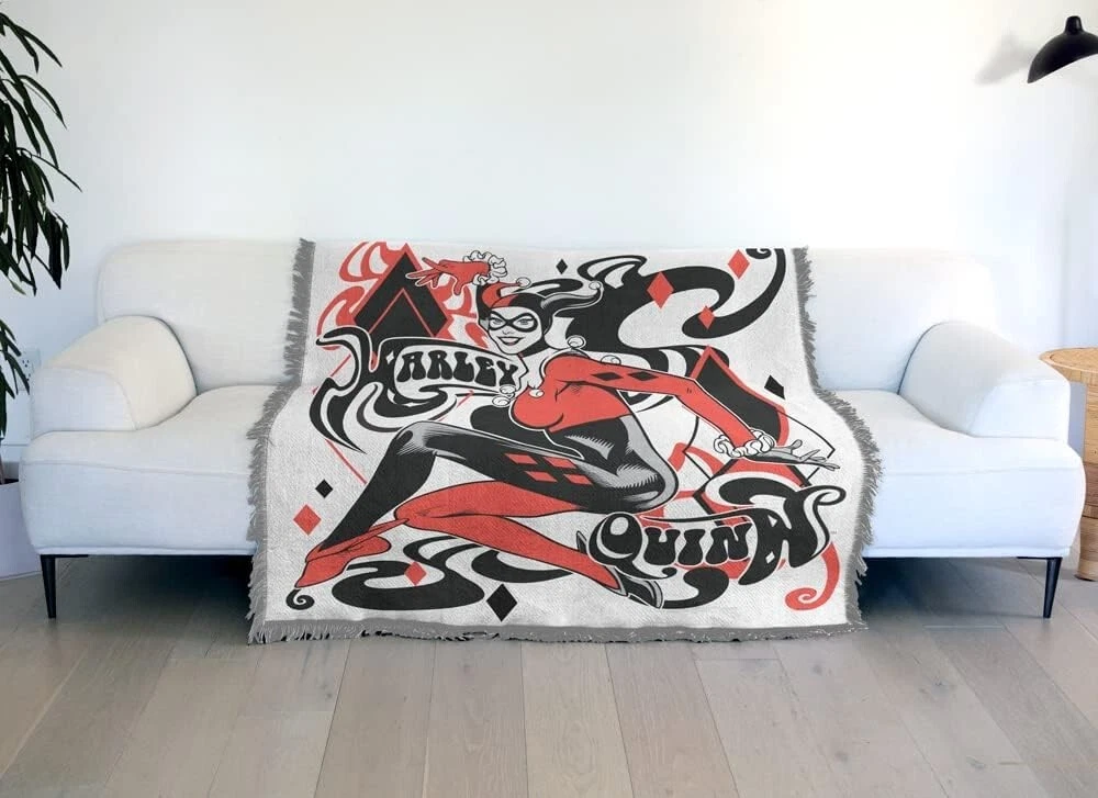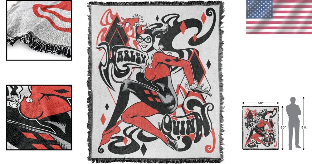 Room: Living Room, Bedroom, Office Department: Adults Water Resistance Level: Not Water Resistant UPC: Does not apply Closure Type: No Closure Style: Modern Product Dimensions: 60"l X 50"w Blanket Form: Throw Blanket Theme: Space Insulation: All Seasons GSM (Grams per Square Meter): Over 800 Item Length: Batman Blanket Item Width: Batman Blanket Number Of Items: 1 Care Instructions: Machine Wash, Tumble Dry Item Weight: 2.66 Pounds Age Range (description): Adult Seasons: All Product Care Instructions: Machine Wash Color: Harley and Diamonds Material: Cotton Blend, Cotton, Polyester gtin13: Does not apply Pattern: Print Special Feature: Stain Resistant Features: Shrink Resistant, Fade Resistant, Stain Resistant, Fringed Trim Sport: Camping Recommended Uses For Product: Napping, Travel, Working Size: 50" x 60" Shape: Rectangular Personalize: No Type: Throw Blanket Fabric Type: Cotton,polyester Thread Count: 201-400 Brand: Unbranded