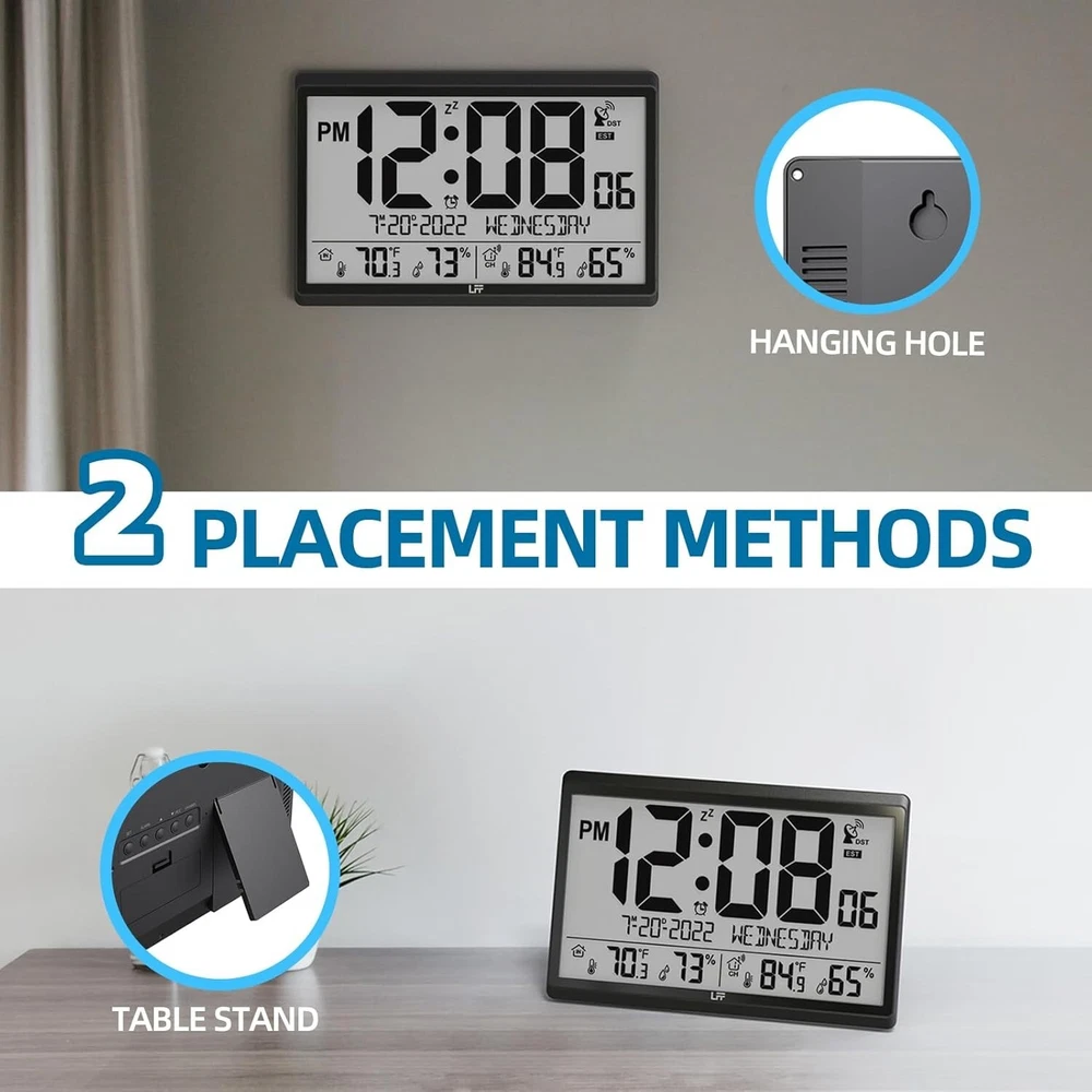 1. This clock is a game-changer! The huge display is so easy to read from across the room, and I love knowing the time is always perfectly accurate without me ever touching it. The indoor/outdoor temperature feature is incredibly handy for planning my day. It looks sleek and modern on my wall, and the setup was a total breeze. Absolutely love it!