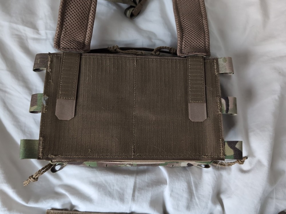 This has been setup and put together, but never tested or used in any environment. The inner retention panel is slightly used. That's it though, it's going to be used. This entire setup MSRPs for $355.00. The Modular Chest Rig-Kit Bag by FullTang Tactical is one of the most versatile pieces of gear you will ever find - truly blurring the lines between bushcraft and tactical. Whether you are hiking, hunting, fishing, or running tactical drills - this kit fully converts from a hiking day pack, to a stand-alone chest rig, to a placard for a plate carrier on the fly because of the built-in rear kangaroo pocket opening. It is made with the highest quality MIL-SPEC materials such as Squadron™ laminate, waterproof YKK AquaGuard® zippers, and water-repellent 500D CORDURA® for superior weather protection and durability. The upgraded shoulder H-harness is made of durable laminate with side routing slots and holes to run shock cord/comms cables. D-rings on the back allow connection to load-bearing belt systems or attachment of carabiners, fly fishing nets, etc.
