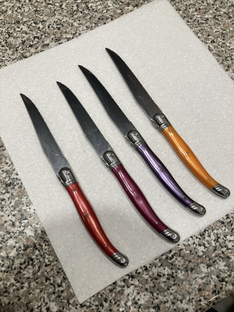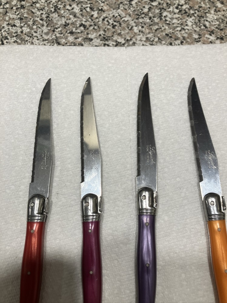 Color:MulticolorFeatures:Easy Clean, Light WeightPersonalize:NoCountry/Region of Manufacture:FranceMaterial:Stainless SteelCustom Bundle:Nogtin13:Does not applyNumber of Items in Set:4Set Includes:Knife SetBlade Length:4.5”Brand:LaguioleType:Steak KnifeBlade Edge:StraightFood Compatibility:MeatUPC:Does not apply