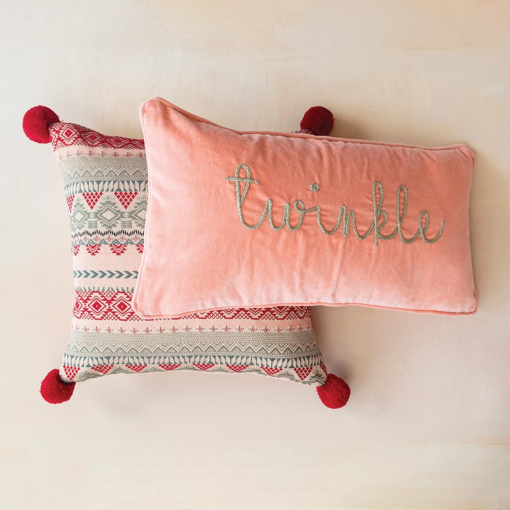This square pillow captures the essence of modern elegance with its woven acrylic jacquard front, showcasing a stunning pattern highlighted by metallic gold thread embroidery. The reverse side is just as delightful, with a pink cotton velvet that feels as good as it looks. Each corner is finished with a charming pom pom, adding a playful note to this sophisticated piece. Whether it's accenting the living room sofa or adding a splash of color to any bedroom, this pillow is sure to enchant. The luxurious texture and attention to detail make this pillow a versatile and stylish addition to any room in the home. Elevate the decor with this unique and eye-catching accent piece. A luxurious woven acrylic jacquard pillow, adorned with a mesmerizing pattern and shimmering metallic gold thread embroidery An opulent addition to any room, this pillow pairs beautifully with rich, solid-colored textiles and elegant deco A plush polyester fill gives this pillow a full, firm shape A blend of premium materials, featuring a cotton blend cover and a resilient polyester fill for lasting comfort 18” L x 18” W
