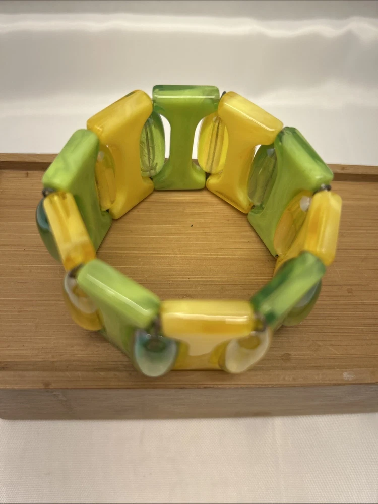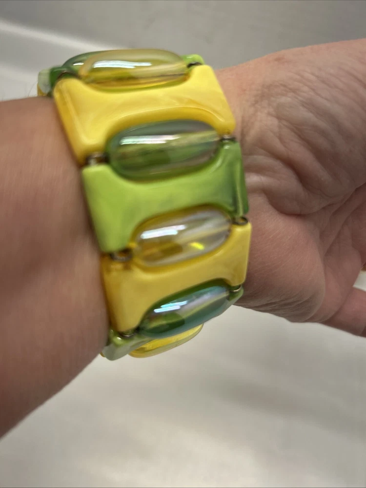 This multicolor yellow and green Lucite stretch bracelet exudes a very retro 80's vibe. The bracelet features a vibrant color combination with Translucent Beads and a stretch design for easy wear. Perfect for adding a pop of color to any outfit, this unbranded piece is a fun and trendy addition to any jewelry collection. Each piece of Bracelet is appx 1.5"