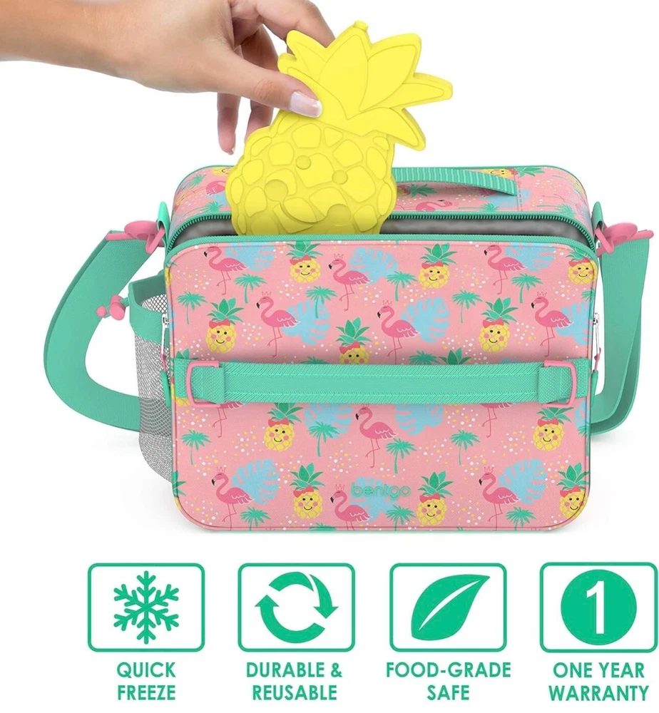 About this item Charming & Colorful: Add a touch of fun to lunchtime with this 4-piece set of ice packs in kid-friendly designs and bright hues Keeps Food & Drinks Cold: Freezes quickly and helps food and beverages stay cold up to 4 hours — ideal for school, work, picnics, game day, and more. Ultra-Slim Design: Measuring just about 0.5” thick, each slim ice pack fits perfectly into any lunch bag or cooler and leaves maximum room for food and beverages 100% Safe & Non-Toxic: Made with durable and reusable food-grade safe plastic that contains no BPA, PVC, phthalates, lead, or vinyl