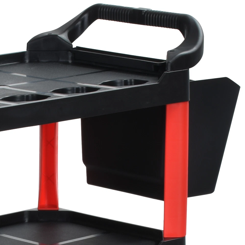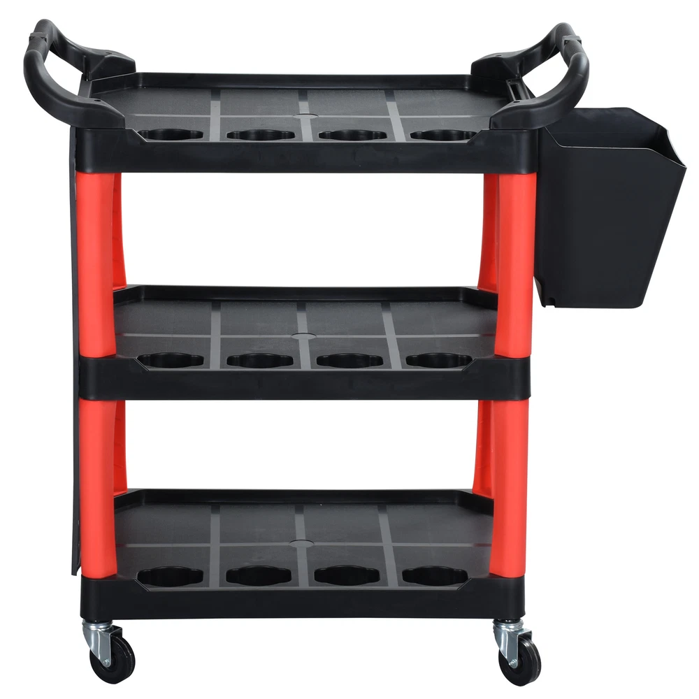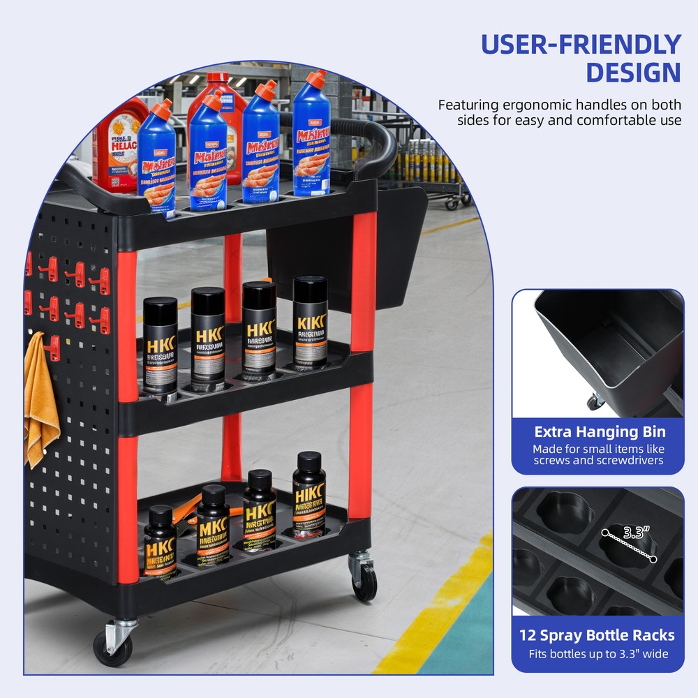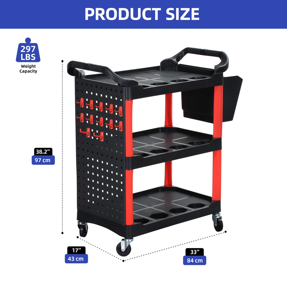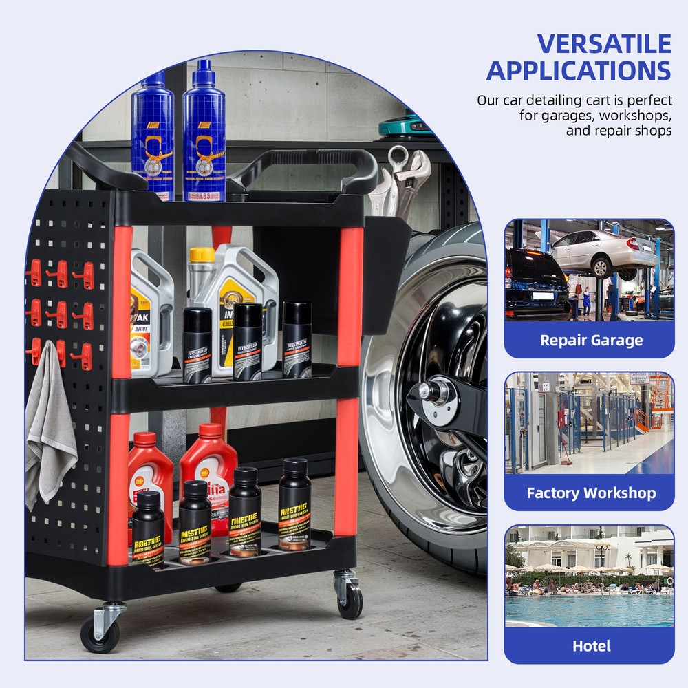 3 Layer Heavy Duty Rolling Metal Cart Service Mechanic Tool Utility Board Storage Product Description NOTE: Professional Installation would be Highly Recommended. Description: 1. Material: Metal, Steel, PP Plastic 2. Color: Black, Red 3. Special Design: Rolling Cart, Storage Shelves, Bottle Racks, Hanging Bin, Hooked, 4-Casters 4. Suitable for: Garage, Warehouse, Workshop, Hotel Features: 1. For Heavy-Duty Use: Crafted from a combination of high-quality metal, steel, and durable PP plastic, this auto detailing cart is built to withstand daily wear and tear. Its solid frame ensures strength and reliability, making it ideal for professional and personal use in garages, warehouses, workshops, and hotels. 2. Spacious & Multi-Functional Storage: Designed with multiple storage shelves, dedicated bottle racks, and a convenient hanging bin, this cart offers ample space to keep cleaning supplies, tools, and accessories neatly organized. The added hooks provide extra hanging options for increased accessibility. 3. Easy Mobility with Swivel Casters: Equipped with 4 high-quality swivel casters, this rolling cart moves effortlessly across different surfaces. Whether maneuvering through a garage, workshop, or hotel facility, its smooth-rolling wheels ensure excellent mobility while maintaining stability. 4. Optimized Size for Placement: Measuring nearly three feet in length, just under one and a half feet in width, and a little over three feet in height, this cart provides ample storage without taking up too much space. Its well-balanced dimensions make it easy to navigate in both compact and large workspaces. 5. Handle Substantial Weight: Engineered to support up to nearly 300 pounds of weight, this rolling cart is built to hold a variety of heavy tools, equipment, and materials. Whether storing power tools, hardware, or office supplies, its reinforced construction ensures maximum strength and stability for demanding tasks. Dimensions: 1. Product Dimensions: 33"L x 17"W x 38.2"H 2. Product Load Capacity: 297 lbs Package Included: 1. 1x Rolling Cart 2. 4x Swivel Casters 3. 1x Hanging Bin 4. 1x Hooked Pack Shipping 1. Normally the item will be dispatched within 1 business day if payment is cleared before 12pm PST. 2. Please verify the correct shipping address in your PayPal account before making the payment. We only dispatch the item to the address that is sent to us at the time of checkout. 3. We don't ship to Hawaii, Alaska, Puerto Rico, APO/FPO/PO Boxes. 4. We don't provide local pick-up service. 5. Normally we will use USPS, UPS, FedEx & LTL to dispatch items. Payment 1. We accept PayPal and credit card. 2. We will ship to the confirmed Paypal shipping address that is provided with the payment only. Return 1. 30 days Money Back Guarantee. 2. Please contact our customer service to receive a RMA form first if want to return the item. 3. All returned items MUST in new condition with the original package. Contact If has any problem, please contact us by sending an ebay message. Our customer service will resolve the problem as soon as possible. On Nov 8, 2024 at 00:31:14 PST, seller added the following information: On Feb 4, 2025 at 23:31:37 PST, seller added the following information: