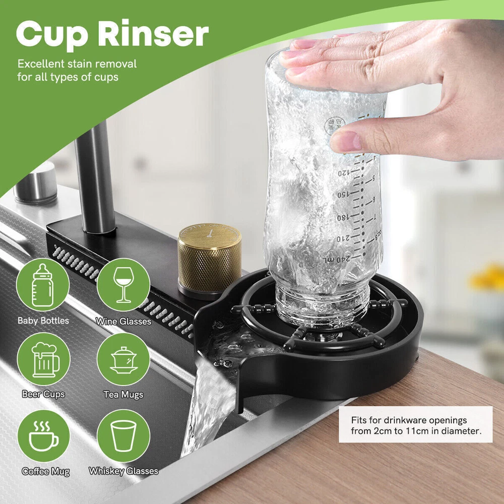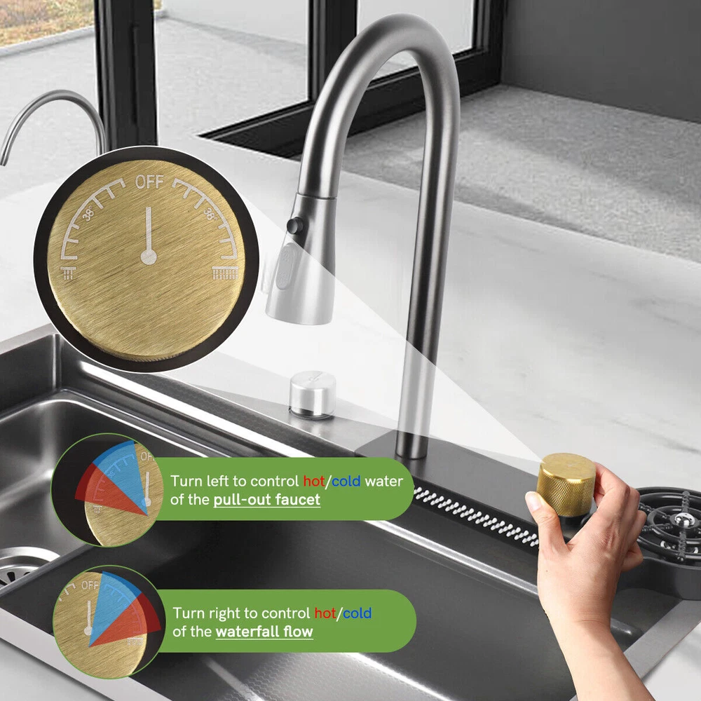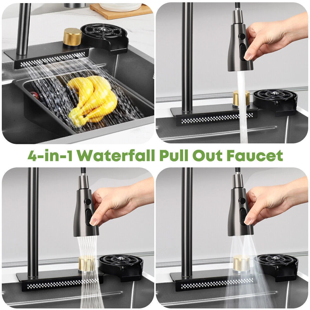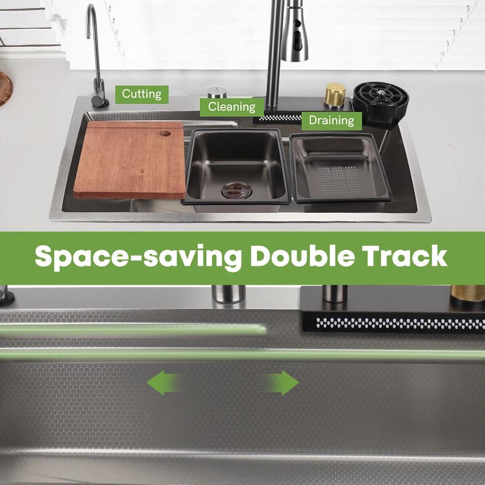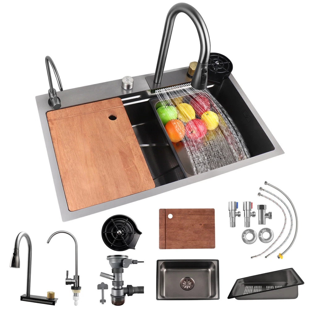 Our multifunctional cascade kitchen sinks come with a dual spout and a full range of accessories, perfect for homes, kitchens, and bars. The package includes: 1 × Nano Sink 1 × Extractable Waterfall Faucet 1 × Cup Rinser 1 × Flow Control Components 1 × Drinking Water Faucet 1 × Basin 1 × Triangular Drain Basket 1 × Cutting Board 2 × Square Faucet 3 × Water Supply Hoses Size of the kitchen sink: External: 75 x 46 x 21.5 cm / 29.5 x 18 x 8.4 inches Internal: 70 x 36 x 20 cm / 27.5 x 14.2 x 7.8 inches Diameter of the cup spout for cup rinsing: 11 cm / 4.3" max. Thickness of the sink plate: 3mm / 0.12" / 11 Gauge √ Advanced nanometric coating - easy to clean nettoyer √ Premium stainless steel - Durable √ Multiple accessories - Wide application √ Double rail - Suitable & convenient Cascade Outlet The cascade design makes it easy to clean fruits and vegetables. The uniform water flow prevents splashing and is perfect for rinsing large surfaces. Cup Rinser Practical cup rinser for quick cleaning of glasses and effective time savings, for cups up to 11 cm/4.3" in diameter. Extractable Faucet The extractable faucet allows for flexible extension of the faucet and convenient use. Drinking Water Faucet The waterfall sink is equipped with a drinking water faucet that can be connected to your home's potable water pipeline for convenient use. Embossed Nano Honeycomb Coating Easy to clean and maintain, resistant to wear and scratches. Flow Control Drain control button for easy draining without getting your hands wet. The flow control button cannot be used with the kitchen sink plug. About this item 【Nano Interior Coating & Noiseless Anti-Condensation Exterior Coating】---The kitchen sink comes with a nano interior coating that ensures rust resistance, durability, and long-term performance. It is easy to clean and maintain. The exterior soundproof coating prevents condensation and ice formation on the bottom of the cascade sink in winter. 【Glass Rinser & Drain Control】---Our single-bowl cascade kitchen sink comes with a glass rinser that can rinse cups with openings up to 11 cm/4.3 inches in diameter. Simply invert the cup and press to spray high-pressure water directly at the bottom, ensuring a thorough cleaning. The drain regulator allows for hands-free draining and reduces mess. Avoid contact with wet surfaces for greater cleanliness and safety. 【High-Quality Stainless Steel & Cascade Flow】---Made of premium stainless steel, our Waterfall kitchen sink offers exceptional durability and hardness. The cascade design is convenient for washing vegetables and fruits. The smooth flow of water cascading from multiple points ensures that every part of your food is thoroughly cleaned, removing any dirt or debris present. 【High-Quality Stainless Steel & Cascade Flow】---Crafted from premium stainless steel material, our kitchen sink offers exceptional durability and hardness. The cascade design makes it convenient for washing vegetables and fruits. The smooth cascade flow of water from multiple points ensures thorough cleaning of every part of the product, eliminating any dirt or residue present. 【3-in-1 Pressure Pull-Out Faucet & Friendly Reminders】---Our pull-out faucet provides 3 water flow modes: stream mode, spray mode, and dual-blade mode. Please note that our sink faucet only has 2 input hoses to connect to cold and hot water, suitable for most households. It is not compatible with special under-counter water heaters, which require a low-pressure or pressureless faucet with 2 input hoses and 1 output hose. Satisfied Customer Service: 1 year warranty! 30days return and refund! Message seller for whatever you encountered we will reply in 12 hours! Shipping Policy: 1. Sent by UPS or other standard courier service, depending on its size and weight. 2. Arrive around 2-8 working days after dispatched. 3. Some remote area cannot accept PO box address for such oversized products. Provide a correct physical address if possible. 4. Can send to all areas in US, but for some remote area, may need to pay extra postage fee. 5. Contact seller if you failed to order. About Us: Join our global team dedicated to sourcing top-quality products directly from factories, ensuring the best prices for our customers on a wide range of home and lifestyle products, outdoor essentials, and more. By eliminating middlemen, we maintain a direct factory-to-customer approach, allowing us to offer unbeatable prices in the market without compromising on quality. Your satisfaction is our priority! Experience the convenience of fast shipping throughout Australia, and rest assured that we are committed to delivering a 100% satisfying online shopping experience. Place your order with confidence and discover the savings and quality we bring to your doorstep!