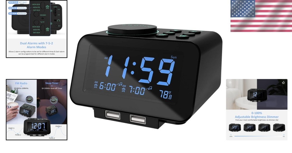 Multifunctional Alarm Clock Radio with Thermometer, USB Ports & Battery Backup ‹ › ‹ › ‹ › ‹ › ‹ › ‹ › ‹ › ‹ › ‹ › Multifunctional Alarm Clock Radio with Thermometer A perfect blend of functionality and elegance, this alarm clock radio not only keeps time but elevates your bedroom's aesthetic while enhancing your daily routine. Key Features: FULL DIMMABLE DISPLAY: The 3.4-inch compact LCD boasts a brightness dial, adjustable from 0 to 100%. From serene cast-no-glow at midnight to reading-friendly brightness during the day, it adapts to your environment seamlessly. CUSTOMIZABLE ALARM: Dual alarms cater to diverse schedules with four modes – weekday, weekend, or all 7 days. Choose from 5 built-in tones or opt for your favorite radio station, gradually increasing in volume for a gentle wake-up. MORE THAN JUST AN ALARM: Enjoy your favourite FM radio stations, capable of saving up to 40 presets. Sleep timer functionality (10-150 minutes) allows you to drift off accompanied by your preferred melodies, without disturbing others with the 3.5mm headphone jack. QUICK AND EASY TO SETUP: Featuring a uniquely designed large rotary button for effortless time and alarm settings, clearly labeled buttons ensure intuitive use right out of the box. BATTERY BACKUP: AC-powered with a battery backup option (3 AAA batteries, not included) guarantees clock settings and alarms are maintained during power outages. Benefits: Promotes better sleep cycles without the distractions of a smartphone. Elegant design enhances your bedroom decor. Customizable settings fit any lifestyle or preference. Enjoy quality FM radio entertainment while you unwind. Perfect for individuals who value simplicity and functionality in their nightstand essentials. Why Choose Our Multifunctional Alarm Clock Radio? Move beyond traditional smart alarms and embrace a healthier sleep environment. Users have reported feeling revitalized after transitioning to our sleek UE-168 model, designed after extensive research and customer feedback. Its elegant simplicity allows it to blend beautifully with any decor while providing versatile functionalities that promote better sleep and punctuality. Elevate your nighttime routine and enrich your mornings with this multifunctional alarm clock radio. Order yours today! Shipping Free & Fast Shipping - We offer free shipping to most of the USA with a normal delivery time of 3-7 days. However, due to the current situation, additional delivery time (up to 3 weeks) may be required for some items. Alternative Carriers - We may use alternative carriers (e.g. USPS, FedEx, UPS, etc.) to ensure your package arrives safely and on time. Due to the use of multiple carriers, we are unable to provide a tracking number automatically. Handling Time - Orders are processed and shipped within 1-2 business days of receiving cleared payment. Shipping Restrictions - Shipping to Alaska, Hawaii, Puerto Rico, Guam, and other US territories may incur shipping charges or delivery restrictions. Please contact us before ordering, or your order can be refunded/cancelled. State Restrictions - There may be restrictions based on your state of purchase. For example, certain items may not be shipped to California due to state regulations. Contact for Tracking Updates - If you require tracking updates or have any concerns about the delivery of your order, please feel free to contact us, and we will be happy to assist you. Return 30-Day Hassle-Free Returns - We want you to be completely satisfied with your purchase. If you are not, you can return the item within 30 days of receiving it for a full refund or exchange. Easy Return Process - To start a return, simply contact us and we will provide you with a prepaid return shipping label and detailed instructions. Restocking Fee - There are no restocking fees for returns. However, the buyer is responsible for return shipping costs if the return is not due to a seller's error. Refund Processing Time - Refunds will be processed within 5 business days of receiving the returned item in its condition. Payment We accept all major credit cards, PayPal, and Apple Pay for your convenience. Your payment information is secure and encrypted to ensure a safe and seamless transaction. Please complete your payment within 3 days of purchase to avoid any delays in shipping. Feedback Your feedback is extremely important to us. We strive to provide the best products and customer service possible. If you are satisfied with your purchase, please take a moment to leave us a positive review. If you have any concerns or issues with your order, please contact us before leaving negative feedback. We are committed to resolving any problems and ensuring your satisfaction. Contact Us If you have any questions or concerns, please feel free to out to our customer support team. You can contact us through the eBay messaging system. We are available Monday to Friday, 9:00 am to 5:00 pm EST, and we will do our best to respond to your inquiry within 24 hours. Buy it now and enjoy a pleasant shopping experience! Item Length: Digital Alarm Clock Radio Product Line: Digital Alarm Clock Radio Unit Quantity: 207 grams Features: Battery Backup,Dual Alarm,Dimmable Display,Customizable Alarm,FM Radio,Sleep Timer,Snooze Function,2 USB Charging Ports,Digital Thermometer,Volume Control,Rotary Dial for Easy Setup,Headphone Jack Room: Bathroom,Bedroom,Dining Room,Garage,Hallway,Home Office/Study,Kitchen,Living Room,Porch,Sunroom,Utility/Laundry Room Material: Plastic Type: Clock Radio Display Type: Digital Color: Black Power Source: Electrical Movement: Automatic Style: Traditional Shape: Rectangular Protection Plan: No Coverage Item Height: 2.56 Inches Item Weight: 1 lb