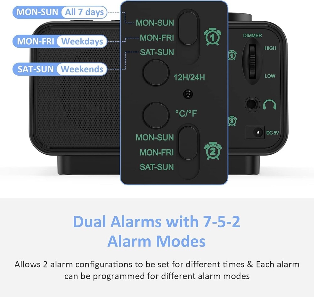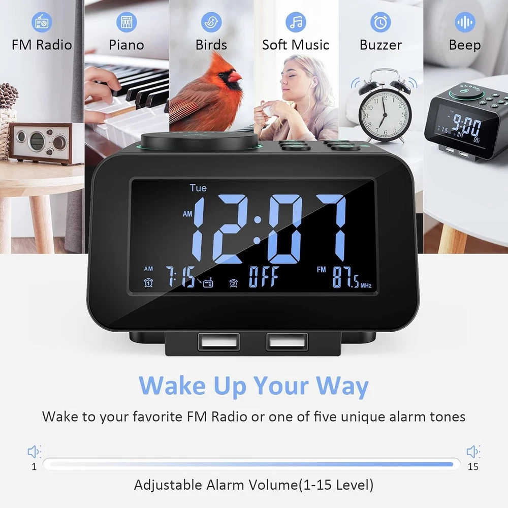 Multifunctional Alarm Clock Radio with Thermometer, USB Ports & Battery Backup