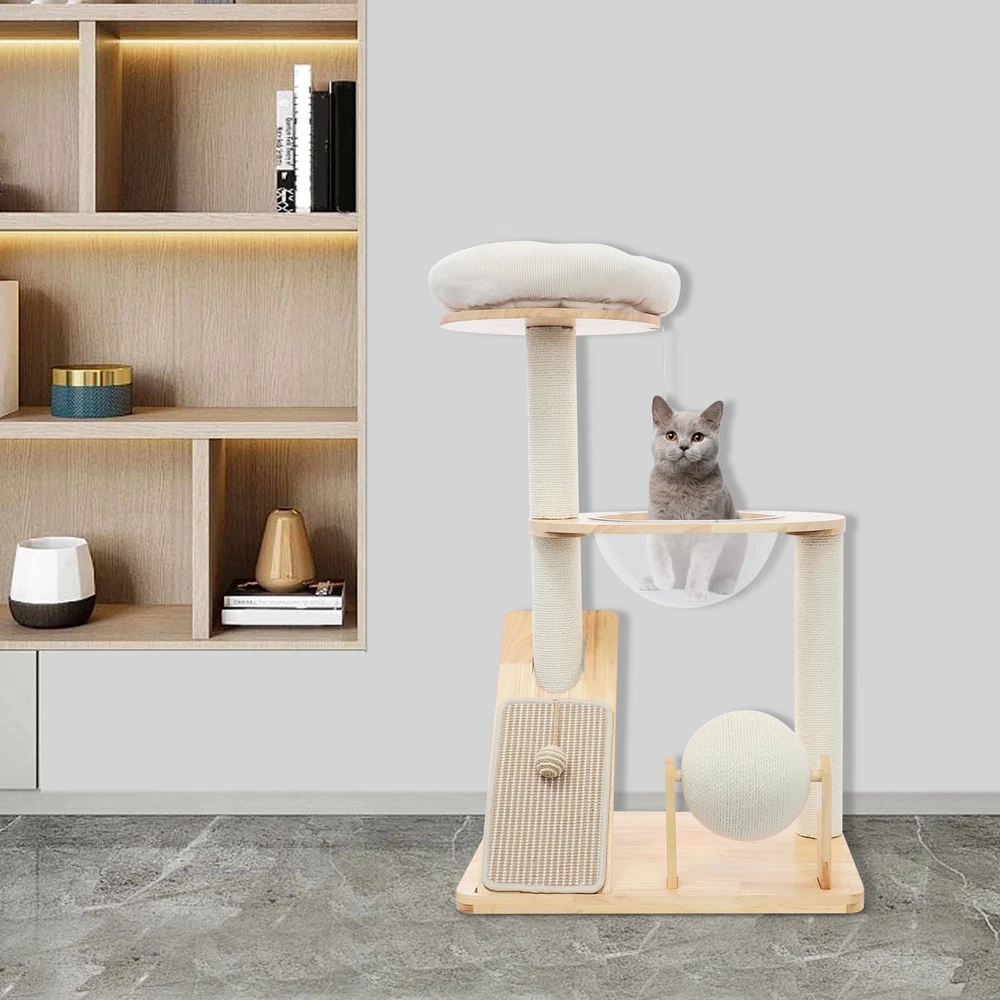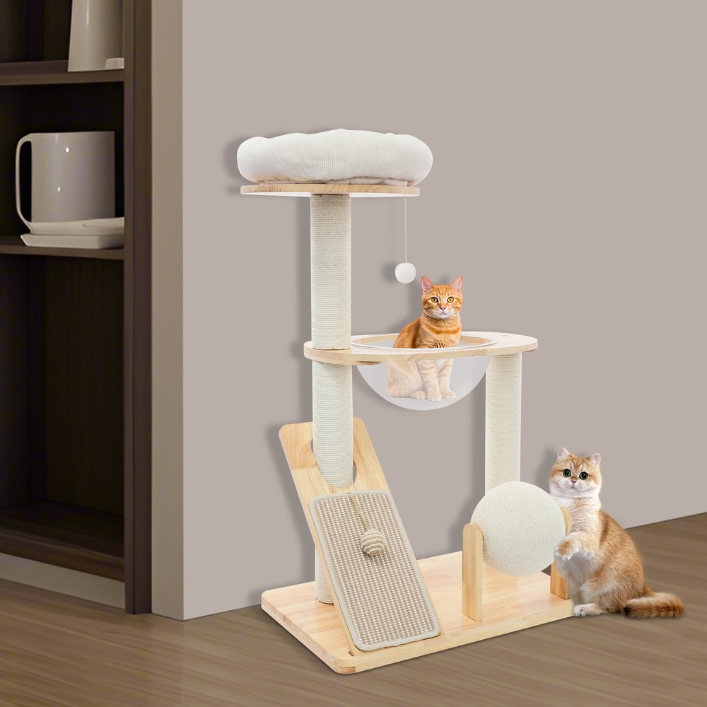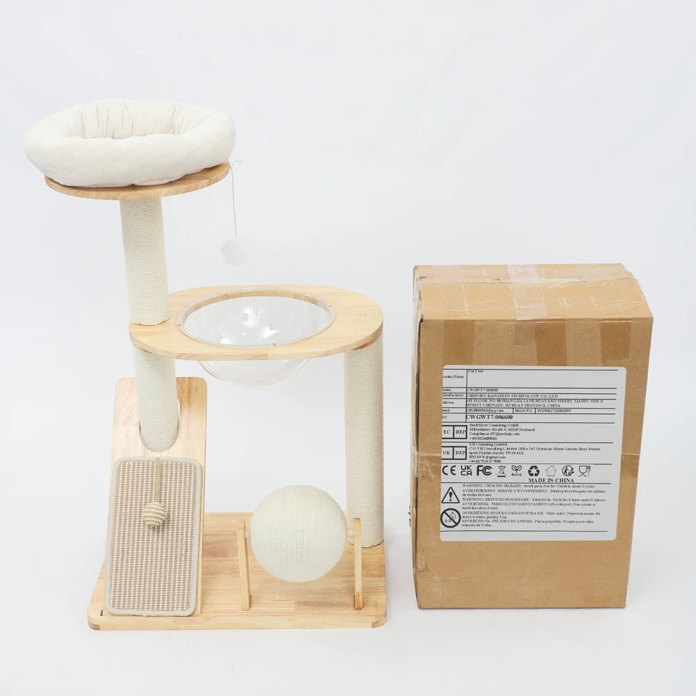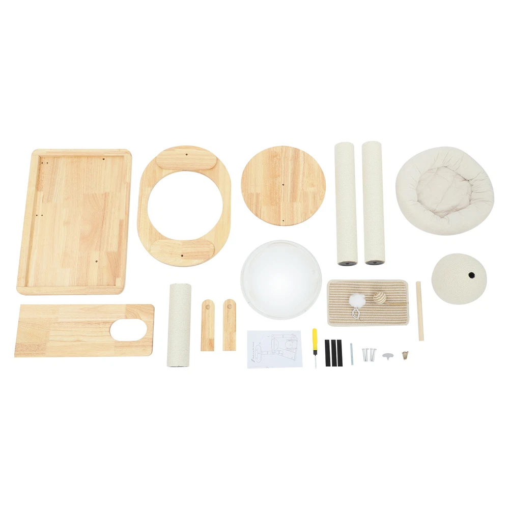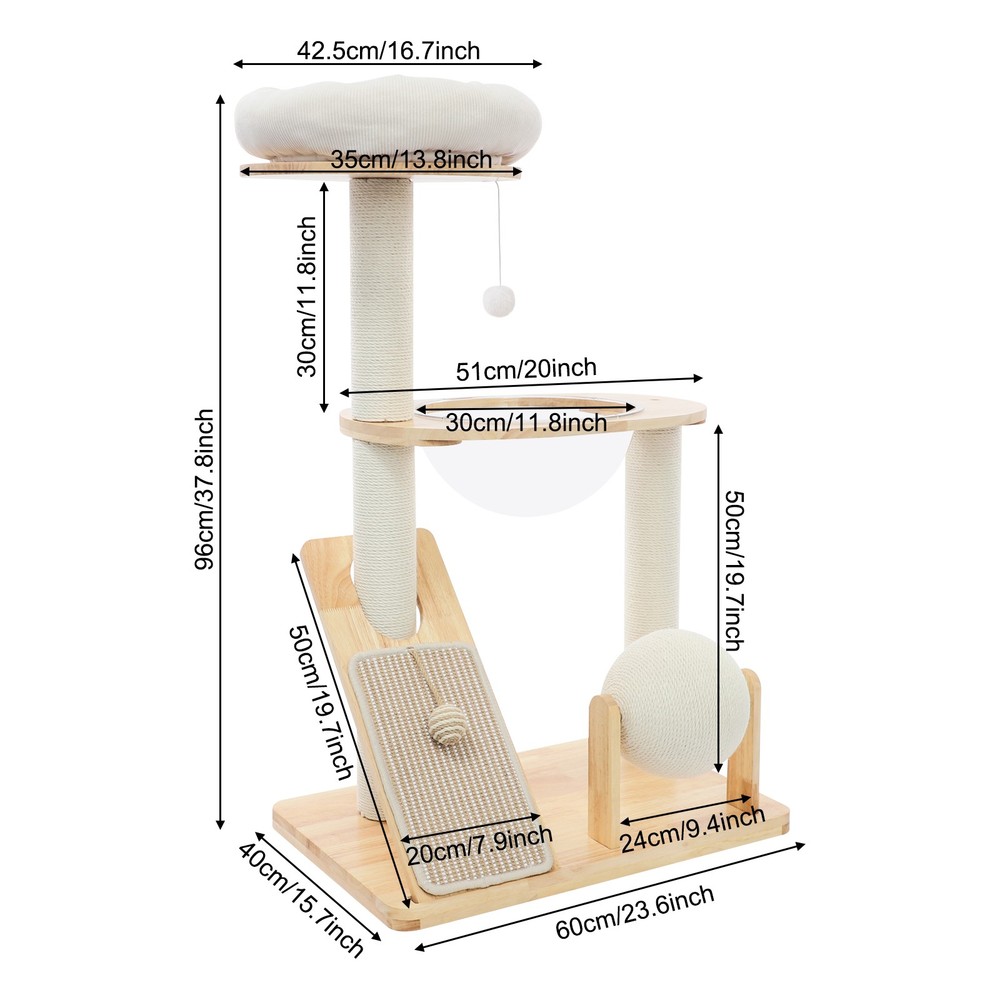 Specification Material: Rubber Wood, Sisal Hemp, Cotton Color: Wood Color, Beige White Process: Water-repellent Style: Modern Assembly Required: Yes Installation Type: Freestanding Max. Load Capacity: 10kg/22.05 lbs Scratching Pad Width: 20cm/7.9in Rolling Ball Support Distance: 24cm/9.4in Space Capsule Opening Size: 30cm/11.8in Cat Bed Support Diameter: 35cm/13.8in Cat Bed Size(D*H): 42.5*9cm/16.7*3.5in Tier Height: 30cm/11.8in, 50cm/19.7in Product Size: 60*40*96cm/23.6*15.7*37.8in Package Size: 63*44*28cm/24.8*17.32*11.02in Gross Weight: 9.75kg/21.5 lbs Net Weight: 8.61kg/18.98 lbs Package Included 1* Cat Tree 1* English Diagram Other Accessories for Assembly Multifunctional Cat Tree, Wooden Cat Tree, Modern Cat Tree Tower for Indoor Cats Description Our cat tree comes with a comfortable cat bed, space capsule, and scratching pad, providing a comfortable entertainment and resting space for your beloved pets. Its unique design not only meets the natural climbing needs of cats but also effectively protects furniture from scratching. This is an ideal choice for both lively and active cats, as well as cats who need a quiet corner. 【创意表达】 Looking for the ideal cat playground? Our cat tree is packed with a cozy cat bed, a space capsule, and a scratch-tastic pad! It's the ideal spot for your furry friends to play, rest, and let their natural climbing instincts run wild. Plus, it'll keep your furniture safe from those pesky scratches. Whether you've got a bouncy, energetic cat or a more mellow cat who just wants a quiet nook, this cat tree is an excellent choice! Key Features Premium Materials: Made of rubber wood, sisal hemp, and cotton materials with a water-repellent process, this product is hard-wearing, scratch-guarded, and not easy to deform, ensuring a long service life. 【创意表达】 Excellent Build : This product is crafted from rubber wood, sisal hemp, and cotton, treated with a water-repellent finish. Designed to withstand the test of time, it is hard-wearing, scratch-guarded, and shape -retaining , ensuring a long-lasting and elegant addition to your home. Good Load-bearing Capacity: The sturdy materials, reasonable structure, and stable base allow this product to support a weight of 22.05 lbs, ensuring stability and reliability during use. 【创意表达】 Strong & Reliable: Made from excellent rubber wood with a stable design, this product can easily support up to 22.05 lbs! Your feline friends will enjoy a sturdy and safe spot to play and relax. Cat's Paradise: This product comes with a cat bed, a space capsule, a rolling ball for scratching and playing, and a cat scratching pad. It not only provides a comfortable resting place for cats but also a paradise for them to sharpen their paws and play. 【创意表达】 Cat Heaven: This premium package includes a cozy cat bed, an enchanting space capsule, a rolling ball for scratching and play, and a scratching pad. Designed to provide comfort and entertainment, this product is the ideal solution for keeping your furry friend happy and active. Give your cat the joy of a playground where they can rest, sharpen their claws, and explore to their heart's content! Thoughtful Design: The cat scratching pad adopts a slope design with a reasonable inclination, which allows cats to grind their paws smoothly without damaging their spine. The sisal hemp is hard-wearing and will not shed debris, reducing your cleaning pressure. 【创意表达】 Elevate Cat's Comfort & Home's Cleanliness: Our uniquely designed cat scratching pad features a thoughtfully crafted sloped design, ensuring your feline friend can enjoy a smooth and comfortable paw-grinding experience without straining their spine. The scratchable areas are made from sisal hemp, which is hard-wearing and minimizes debris, making it easier for you to keep your home clean and tidy. Easy to Assemble: The simple structure, sufficient accessories, and pre-drilled holes can make your assembly simple, and you can enjoy the installation fun. 【创意表达】 Simple to Put Together: With its simple design, inclusive accessories, and pre-drilled holes, you'll have this set up quickly—having an enjoyable assembly with less effort! Details Stable Base: The 23.6 * 15.7in large base increases the force area between the product and the ground, making the product more stable. 【创意表达】 Firm Base: With a generous 23.6" x 15.7" base, our product maximizes the contact area with the ground, ensuring great stability and peace of mind. Round Corners: It adopts an arc design, which can effectively care for your cat's skin compared with the traditional square corners. 【创意表达】 Arcuate Corners: Designed with smooth, curved corners, this product offers a gentler touch on your cat's skin, providing a more comfortable and soothing experience compared to the harsh, traditional square corners. Application This product is suitable for living rooms, bedrooms, pet stores, etc. It is suitable for cats to engage in activities such as climbing, scratching, sleeping, and exercising. Specification Material: Rubber Wood, Sisal Hemp, Cotton Color: Wood Color, Beige White Process: Water-repellent Style: Modern Assembly Required: Yes Installation Type: Freestanding Max. Load Capacity: 10kg/22.05 lbs Scratching Pad Width: 20cm/7.9in Rolling Ball Support Distance: 24cm/9.4in Space Capsule Opening Size: 30cm/11.8in Cat Bed Support Diameter: 35cm/13.8in Cat Bed Size(D*H): 42.5*9cm/16.7*3.5in Tier Height: 30cm/11.8in, 50cm/19.7in Product Size: 60*40*96cm/23.6*15.7*37.8in Package Size: 63*44*28cm/24.8*17.32*11.02in Gross Weight: 9.75kg/21.5 lbs Net Weight: 8.61kg/18.98 lbs Package Included 1* Cat Tree 1* English Diagram Other Accessories for Assembly Notes Please check the product's style and size carefully before ordering. Please be informed that plush toy balls are equipped randomly. Please use the product within its weight capacity to avoid damage. Please allow the slight color difference