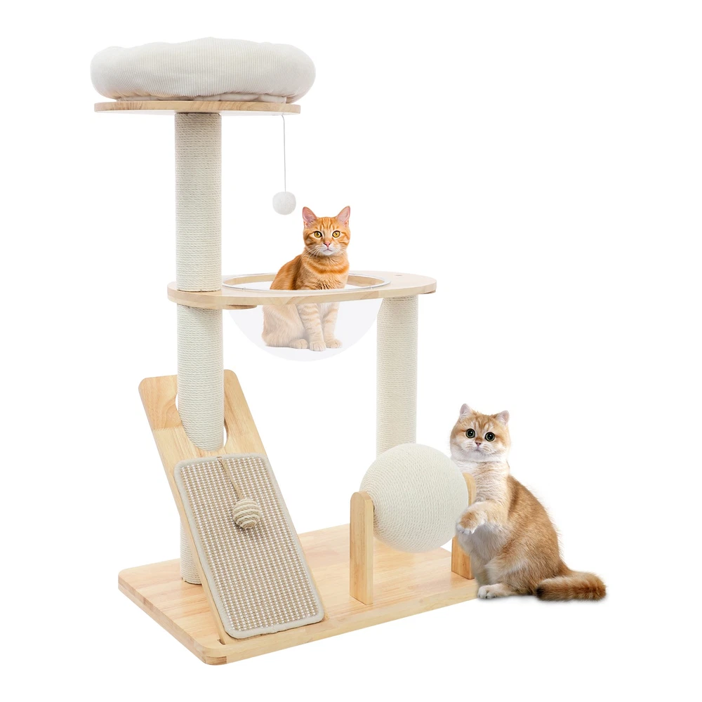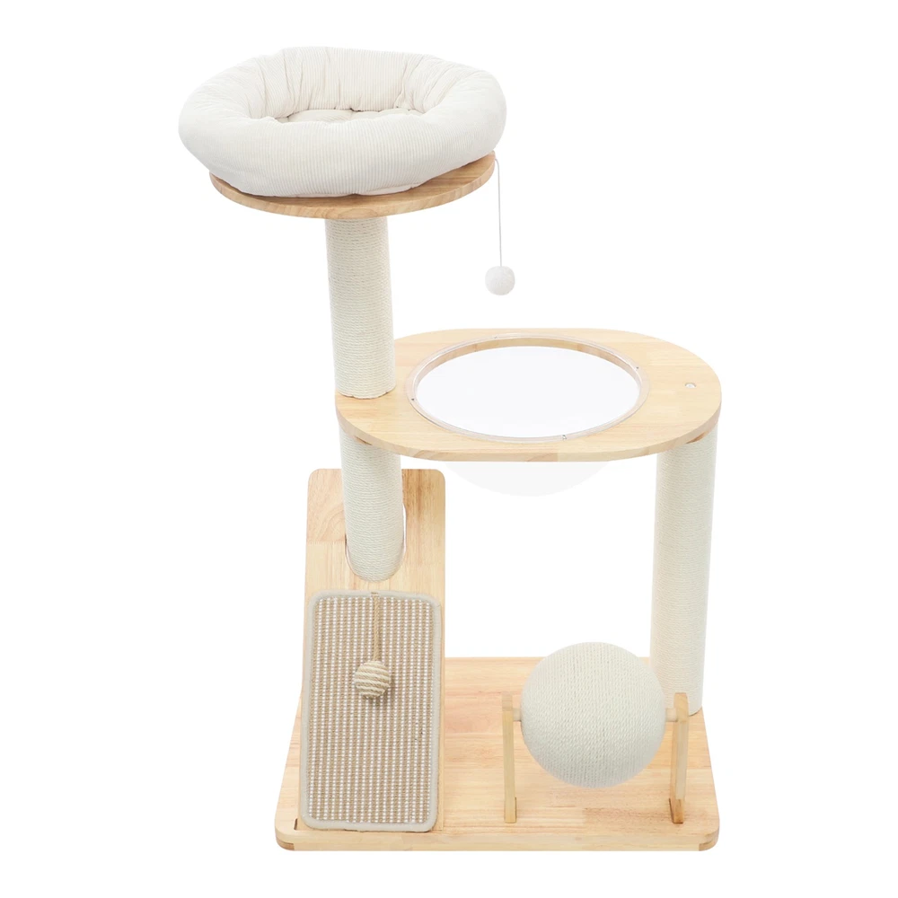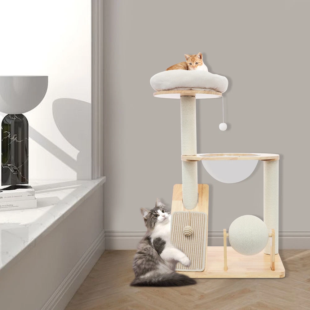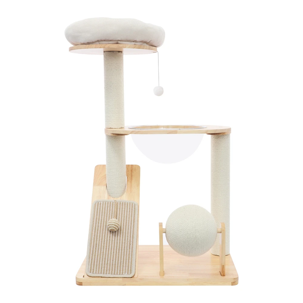 Specification Material: Rubber Wood, Sisal Hemp, Cotton Color: Wood Color, Beige White Process: Water-repellent Style: Modern Assembly Required: Yes Installation Type: Freestanding Max. Load Capacity: 10kg/22.05 lbs Scratching Pad Width: 20cm/7.9in Rolling Ball Support Distance: 24cm/9.4in Space Capsule Opening Size: 30cm/11.8in Cat Bed Support Diameter: 35cm/13.8in Cat Bed Size(D*H): 42.5*9cm/16.7*3.5in Tier Height: 30cm/11.8in, 50cm/19.7in Product Size: 60*40*96cm/23.6*15.7*37.8in Package Size: 63*44*28cm/24.8*17.32*11.02in Gross Weight: 9.75kg/21.5 lbs Net Weight: 8.61kg/18.98 lbs Package Included 1* Cat Tree 1* English Diagram Other Accessories for Assembly Multifunctional Cat Tree, Wooden Cat Tree, Modern Cat Tree Tower for Indoor Cats Description Our cat tree comes with a comfortable cat bed, space capsule, and scratching pad, providing a comfortable entertainment and resting space for your beloved pets. Its unique design not only meets the natural climbing needs of cats but also effectively protects furniture from scratching. This is an ideal choice for both lively and active cats, as well as cats who need a quiet corner. 【创意表达】 Looking for the ideal cat playground? Our cat tree is packed with a cozy cat bed, a space capsule, and a scratch-tastic pad! It's the ideal spot for your furry friends to play, rest, and let their natural climbing instincts run wild. Plus, it'll keep your furniture safe from those pesky scratches. Whether you've got a bouncy, energetic cat or a more mellow cat who just wants a quiet nook, this cat tree is an excellent choice! Key Features Premium Materials: Made of rubber wood, sisal hemp, and cotton materials with a water-repellent process, this product is hard-wearing, scratch-guarded, and not easy to deform, ensuring a long service life. 【创意表达】 Excellent Build : This product is crafted from rubber wood, sisal hemp, and cotton, treated with a water-repellent finish. Designed to withstand the test of time, it is hard-wearing, scratch-guarded, and shape -retaining , ensuring a long-lasting and elegant addition to your home. Good Load-bearing Capacity: The sturdy materials, reasonable structure, and stable base allow this product to support a weight of 22.05 lbs, ensuring stability and reliability during use. 【创意表达】 Strong & Reliable: Made from excellent rubber wood with a stable design, this product can easily support up to 22.05 lbs! Your feline friends will enjoy a sturdy and safe spot to play and relax. Cat's Paradise: This product comes with a cat bed, a space capsule, a rolling ball for scratching and playing, and a cat scratching pad. It not only provides a comfortable resting place for cats but also a paradise for them to sharpen their paws and play. 【创意表达】 Cat Heaven: This premium package includes a cozy cat bed, an enchanting space capsule, a rolling ball for scratching and play, and a scratching pad. Designed to provide comfort and entertainment, this product is the ideal solution for keeping your furry friend happy and active. Give your cat the joy of a playground where they can rest, sharpen their claws, and explore to their heart's content! Thoughtful Design: The cat scratching pad adopts a slope design with a reasonable inclination, which allows cats to grind their paws smoothly without damaging their spine. The sisal hemp is hard-wearing and will not shed debris, reducing your cleaning pressure. 【创意表达】 Elevate Cat's Comfort & Home's Cleanliness: Our uniquely designed cat scratching pad features a thoughtfully crafted sloped design, ensuring your feline friend can enjoy a smooth and comfortable paw-grinding experience without straining their spine. The scratchable areas are made from sisal hemp, which is hard-wearing and minimizes debris, making it easier for you to keep your home clean and tidy. Easy to Assemble: The simple structure, sufficient accessories, and pre-drilled holes can make your assembly simple, and you can enjoy the installation fun. 【创意表达】 Simple to Put Together: With its simple design, inclusive accessories, and pre-drilled holes, you'll have this set up quickly—having an enjoyable assembly with less effort! Details Stable Base: The 23.6 * 15.7in large base increases the force area between the product and the ground, making the product more stable. 【创意表达】 Firm Base: With a generous 23.6" x 15.7" base, our product maximizes the contact area with the ground, ensuring great stability and peace of mind. Round Corners: It adopts an arc design, which can effectively care for your cat's skin compared with the traditional square corners. 【创意表达】 Arcuate Corners: Designed with smooth, curved corners, this product offers a gentler touch on your cat's skin, providing a more comfortable and soothing experience compared to the harsh, traditional square corners. Application This product is suitable for living rooms, bedrooms, pet stores, etc. It is suitable for cats to engage in activities such as climbing, scratching, sleeping, and exercising. Specification Material: Rubber Wood, Sisal Hemp, Cotton Color: Wood Color, Beige White Process: Water-repellent Style: Modern Assembly Required: Yes Installation Type: Freestanding Max. Load Capacity: 10kg/22.05 lbs Scratching Pad Width: 20cm/7.9in Rolling Ball Support Distance: 24cm/9.4in Space Capsule Opening Size: 30cm/11.8in Cat Bed Support Diameter: 35cm/13.8in Cat Bed Size(D*H): 42.5*9cm/16.7*3.5in Tier Height: 30cm/11.8in, 50cm/19.7in Product Size: 60*40*96cm/23.6*15.7*37.8in Package Size: 63*44*28cm/24.8*17.32*11.02in Gross Weight: 9.75kg/21.5 lbs Net Weight: 8.61kg/18.98 lbs Package Included 1* Cat Tree 1* English Diagram Other Accessories for Assembly Notes Please check the product's style and size carefully before ordering. Please be informed that plush toy balls are equipped randomly. Please use the product within its weight capacity to avoid damage. Please allow the slight color difference