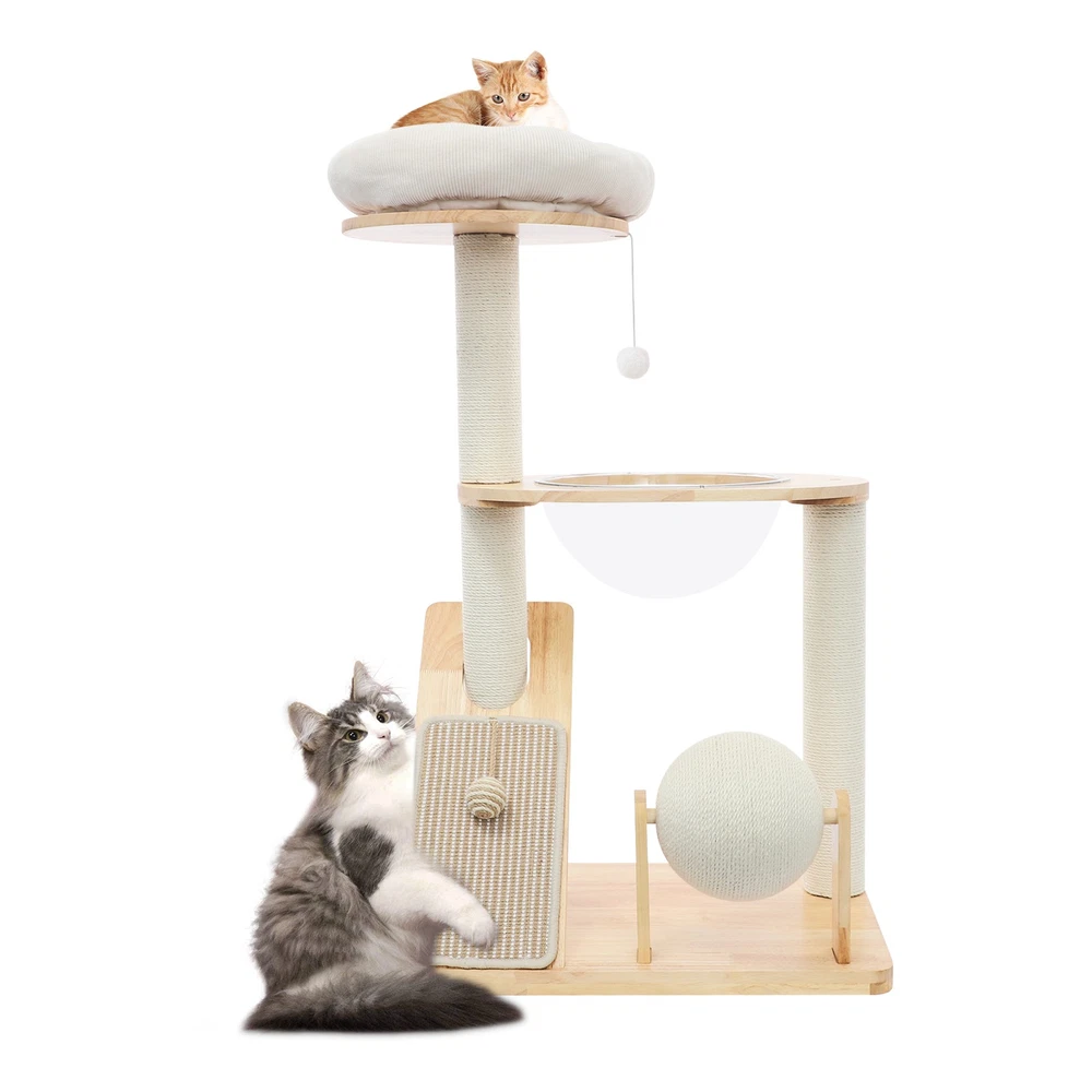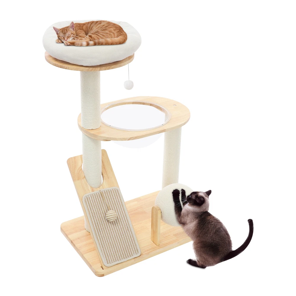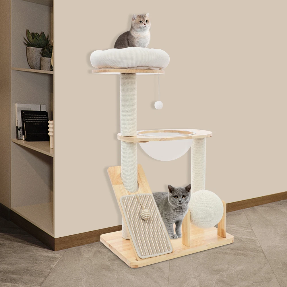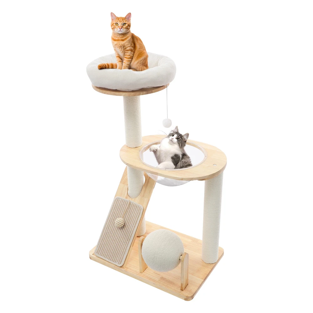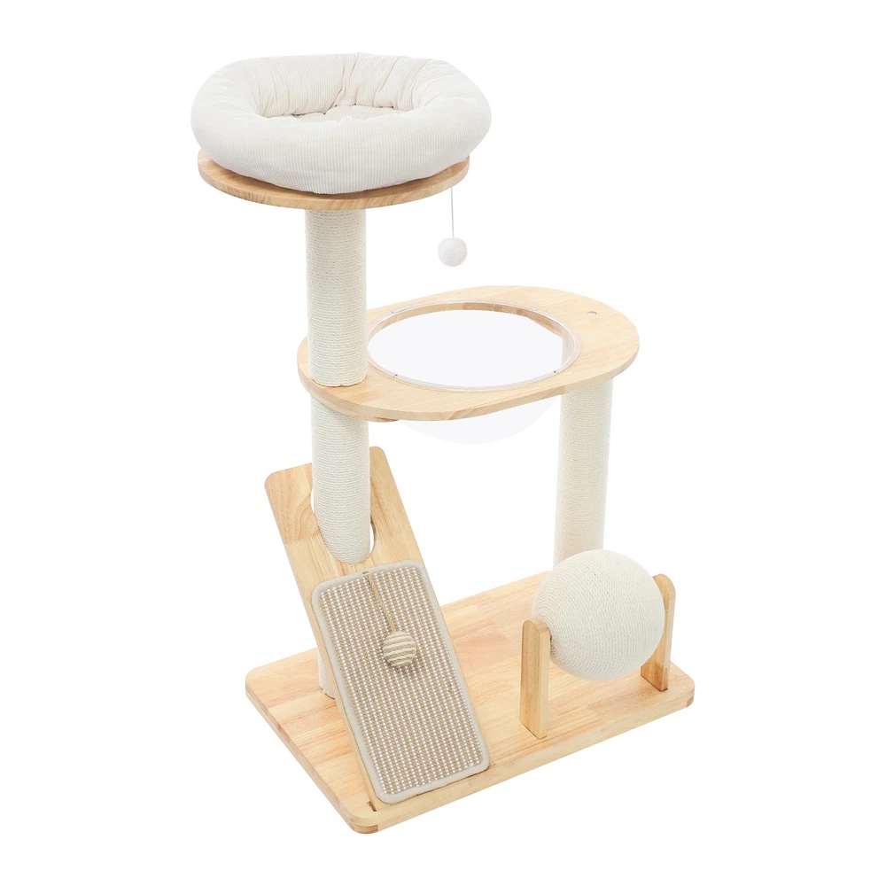 Specification Material: Rubber Wood, Sisal Hemp, Cotton Color: Wood Color, Beige White Process: Water-repellent Style: Modern Assembly Required: Yes Installation Type: Freestanding Max. Load Capacity: 10kg/22.05 lbs Scratching Pad Width: 20cm/7.9in Rolling Ball Support Distance: 24cm/9.4in Space Capsule Opening Size: 30cm/11.8in Cat Bed Support Diameter: 35cm/13.8in Cat Bed Size(D*H): 42.5*9cm/16.7*3.5in Tier Height: 30cm/11.8in, 50cm/19.7in Product Size: 60*40*96cm/23.6*15.7*37.8in Package Size: 63*44*28cm/24.8*17.32*11.02in Gross Weight: 9.75kg/21.5 lbs Net Weight: 8.61kg/18.98 lbs Package Included 1* Cat Tree 1* English Diagram Other Accessories for Assembly Multifunctional Cat Tree, Wooden Cat Tree, Modern Cat Tree Tower for Indoor Cats Description Our cat tree comes with a comfortable cat bed, space capsule, and scratching pad, providing a comfortable entertainment and resting space for your beloved pets. Its unique design not only meets the natural climbing needs of cats but also effectively protects furniture from scratching. This is an ideal choice for both lively and active cats, as well as cats who need a quiet corner. 【创意表达】 Looking for the ideal cat playground? Our cat tree is packed with a cozy cat bed, a space capsule, and a scratch-tastic pad! It's the ideal spot for your furry friends to play, rest, and let their natural climbing instincts run wild. Plus, it'll keep your furniture safe from those pesky scratches. Whether you've got a bouncy, energetic cat or a more mellow cat who just wants a quiet nook, this cat tree is an excellent choice! Key Features Premium Materials: Made of rubber wood, sisal hemp, and cotton materials with a water-repellent process, this product is hard-wearing, scratch-guarded, and not easy to deform, ensuring a long service life. 【创意表达】 Excellent Build : This product is crafted from rubber wood, sisal hemp, and cotton, treated with a water-repellent finish. Designed to withstand the test of time, it is hard-wearing, scratch-guarded, and shape -retaining , ensuring a long-lasting and elegant addition to your home. Good Load-bearing Capacity: The sturdy materials, reasonable structure, and stable base allow this product to support a weight of 22.05 lbs, ensuring stability and reliability during use. 【创意表达】 Strong & Reliable: Made from excellent rubber wood with a stable design, this product can easily support up to 22.05 lbs! Your feline friends will enjoy a sturdy and safe spot to play and relax. Cat's Paradise: This product comes with a cat bed, a space capsule, a rolling ball for scratching and playing, and a cat scratching pad. It not only provides a comfortable resting place for cats but also a paradise for them to sharpen their paws and play. 【创意表达】 Cat Heaven: This premium package includes a cozy cat bed, an enchanting space capsule, a rolling ball for scratching and play, and a scratching pad. Designed to provide comfort and entertainment, this product is the ideal solution for keeping your furry friend happy and active. Give your cat the joy of a playground where they can rest, sharpen their claws, and explore to their heart's content! Thoughtful Design: The cat scratching pad adopts a slope design with a reasonable inclination, which allows cats to grind their paws smoothly without damaging their spine. The sisal hemp is hard-wearing and will not shed debris, reducing your cleaning pressure. 【创意表达】 Elevate Cat's Comfort & Home's Cleanliness: Our uniquely designed cat scratching pad features a thoughtfully crafted sloped design, ensuring your feline friend can enjoy a smooth and comfortable paw-grinding experience without straining their spine. The scratchable areas are made from sisal hemp, which is hard-wearing and minimizes debris, making it easier for you to keep your home clean and tidy. Easy to Assemble: The simple structure, sufficient accessories, and pre-drilled holes can make your assembly simple, and you can enjoy the installation fun. 【创意表达】 Simple to Put Together: With its simple design, inclusive accessories, and pre-drilled holes, you'll have this set up quickly—having an enjoyable assembly with less effort! Details Stable Base: The 23.6 * 15.7in large base increases the force area between the product and the ground, making the product more stable. 【创意表达】 Firm Base: With a generous 23.6" x 15.7" base, our product maximizes the contact area with the ground, ensuring great stability and peace of mind. Round Corners: It adopts an arc design, which can effectively care for your cat's skin compared with the traditional square corners. 【创意表达】 Arcuate Corners: Designed with smooth, curved corners, this product offers a gentler touch on your cat's skin, providing a more comfortable and soothing experience compared to the harsh, traditional square corners. Application This product is suitable for living rooms, bedrooms, pet stores, etc. It is suitable for cats to engage in activities such as climbing, scratching, sleeping, and exercising. Specification Material: Rubber Wood, Sisal Hemp, Cotton Color: Wood Color, Beige White Process: Water-repellent Style: Modern Assembly Required: Yes Installation Type: Freestanding Max. Load Capacity: 10kg/22.05 lbs Scratching Pad Width: 20cm/7.9in Rolling Ball Support Distance: 24cm/9.4in Space Capsule Opening Size: 30cm/11.8in Cat Bed Support Diameter: 35cm/13.8in Cat Bed Size(D*H): 42.5*9cm/16.7*3.5in Tier Height: 30cm/11.8in, 50cm/19.7in Product Size: 60*40*96cm/23.6*15.7*37.8in Package Size: 63*44*28cm/24.8*17.32*11.02in Gross Weight: 9.75kg/21.5 lbs Net Weight: 8.61kg/18.98 lbs Package Included 1* Cat Tree 1* English Diagram Other Accessories for Assembly Notes Please check the product's style and size carefully before ordering. Please be informed that plush toy balls are equipped randomly. Please use the product within its weight capacity to avoid damage. Please allow the slight color difference