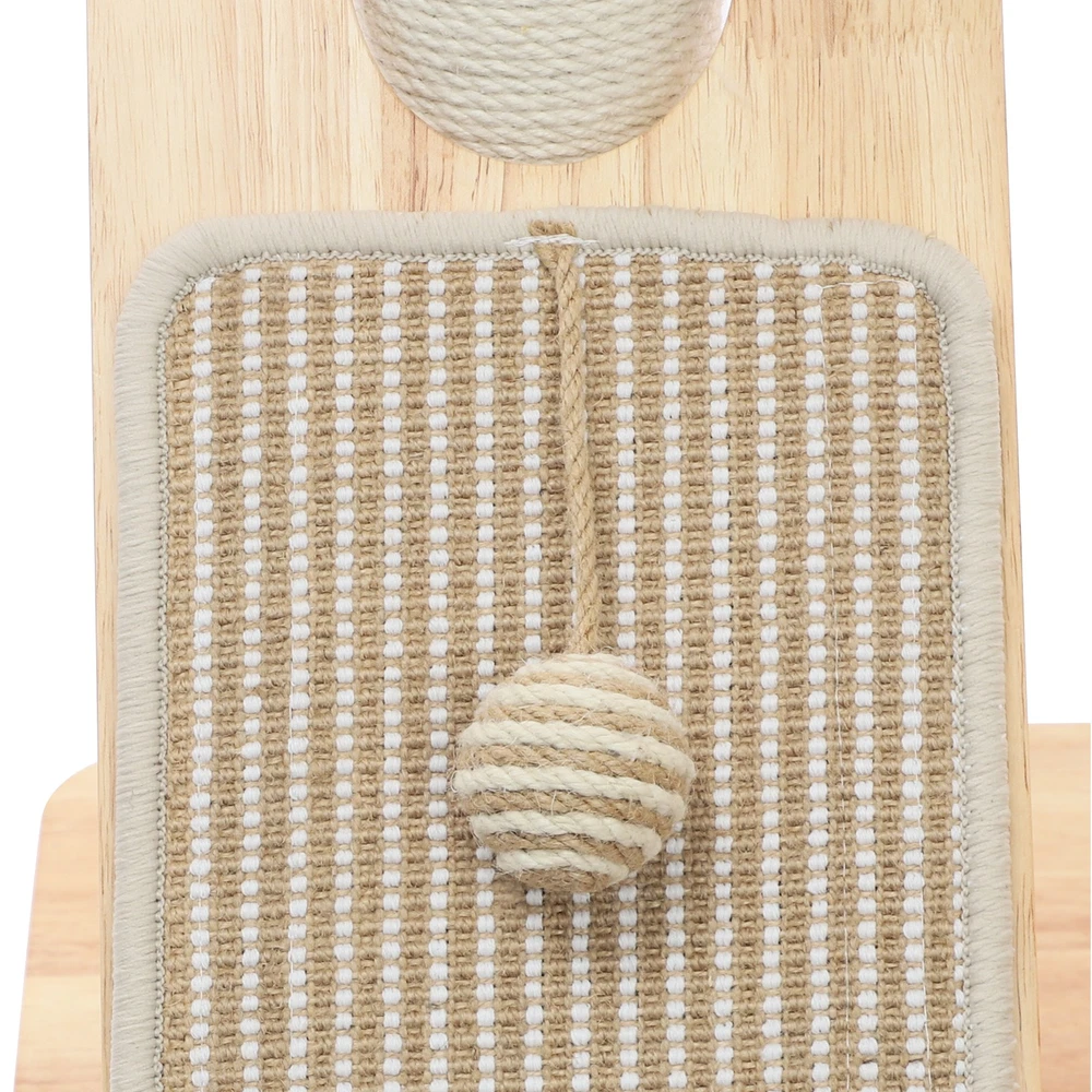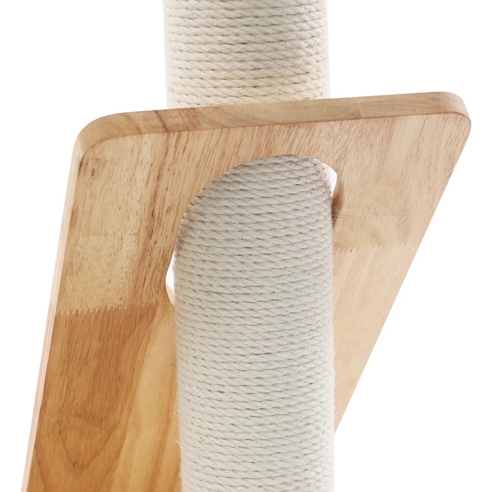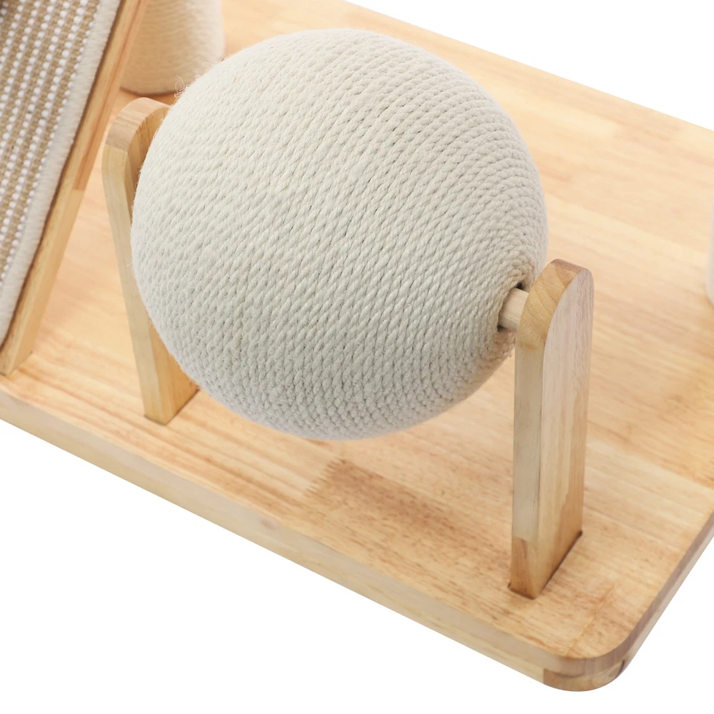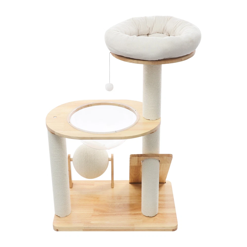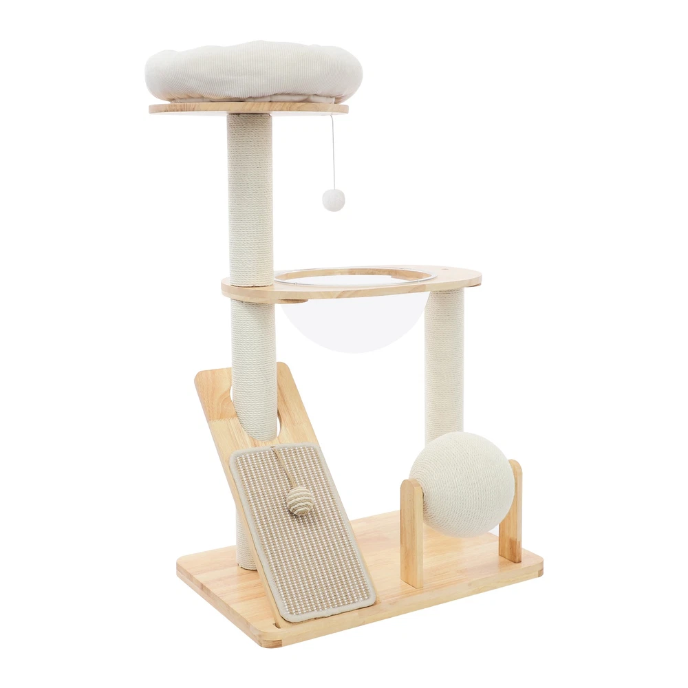 Specification Material: Rubber Wood, Sisal Hemp, Cotton Color: Wood Color, Beige White Process: Water-repellent Style: Modern Assembly Required: Yes Installation Type: Freestanding Max. Load Capacity: 10kg/22.05 lbs Scratching Pad Width: 20cm/7.9in Rolling Ball Support Distance: 24cm/9.4in Space Capsule Opening Size: 30cm/11.8in Cat Bed Support Diameter: 35cm/13.8in Cat Bed Size(D*H): 42.5*9cm/16.7*3.5in Tier Height: 30cm/11.8in, 50cm/19.7in Product Size: 60*40*96cm/23.6*15.7*37.8in Package Size: 63*44*28cm/24.8*17.32*11.02in Gross Weight: 9.75kg/21.5 lbs Net Weight: 8.61kg/18.98 lbs Package Included 1* Cat Tree 1* English Diagram Other Accessories for Assembly Multifunctional Cat Tree, Wooden Cat Tree, Modern Cat Tree Tower for Indoor Cats Description Our cat tree comes with a comfortable cat bed, space capsule, and scratching pad, providing a comfortable entertainment and resting space for your beloved pets. Its unique design not only meets the natural climbing needs of cats but also effectively protects furniture from scratching. This is an ideal choice for both lively and active cats, as well as cats who need a quiet corner. 【创意表达】 Looking for the ideal cat playground? Our cat tree is packed with a cozy cat bed, a space capsule, and a scratch-tastic pad! It's the ideal spot for your furry friends to play, rest, and let their natural climbing instincts run wild. Plus, it'll keep your furniture safe from those pesky scratches. Whether you've got a bouncy, energetic cat or a more mellow cat who just wants a quiet nook, this cat tree is an excellent choice! Key Features Premium Materials: Made of rubber wood, sisal hemp, and cotton materials with a water-repellent process, this product is hard-wearing, scratch-guarded, and not easy to deform, ensuring a long service life. 【创意表达】 Excellent Build : This product is crafted from rubber wood, sisal hemp, and cotton, treated with a water-repellent finish. Designed to withstand the test of time, it is hard-wearing, scratch-guarded, and shape -retaining , ensuring a long-lasting and elegant addition to your home. Good Load-bearing Capacity: The sturdy materials, reasonable structure, and stable base allow this product to support a weight of 22.05 lbs, ensuring stability and reliability during use. 【创意表达】 Strong & Reliable: Made from excellent rubber wood with a stable design, this product can easily support up to 22.05 lbs! Your feline friends will enjoy a sturdy and safe spot to play and relax. Cat's Paradise: This product comes with a cat bed, a space capsule, a rolling ball for scratching and playing, and a cat scratching pad. It not only provides a comfortable resting place for cats but also a paradise for them to sharpen their paws and play. 【创意表达】 Cat Heaven: This premium package includes a cozy cat bed, an enchanting space capsule, a rolling ball for scratching and play, and a scratching pad. Designed to provide comfort and entertainment, this product is the ideal solution for keeping your furry friend happy and active. Give your cat the joy of a playground where they can rest, sharpen their claws, and explore to their heart's content! Thoughtful Design: The cat scratching pad adopts a slope design with a reasonable inclination, which allows cats to grind their paws smoothly without damaging their spine. The sisal hemp is hard-wearing and will not shed debris, reducing your cleaning pressure. 【创意表达】 Elevate Cat's Comfort & Home's Cleanliness: Our uniquely designed cat scratching pad features a thoughtfully crafted sloped design, ensuring your feline friend can enjoy a smooth and comfortable paw-grinding experience without straining their spine. The scratchable areas are made from sisal hemp, which is hard-wearing and minimizes debris, making it easier for you to keep your home clean and tidy. Easy to Assemble: The simple structure, sufficient accessories, and pre-drilled holes can make your assembly simple, and you can enjoy the installation fun. 【创意表达】 Simple to Put Together: With its simple design, inclusive accessories, and pre-drilled holes, you'll have this set up quickly—having an enjoyable assembly with less effort! Details Stable Base: The 23.6 * 15.7in large base increases the force area between the product and the ground, making the product more stable. 【创意表达】 Firm Base: With a generous 23.6" x 15.7" base, our product maximizes the contact area with the ground, ensuring great stability and peace of mind. Round Corners: It adopts an arc design, which can effectively care for your cat's skin compared with the traditional square corners. 【创意表达】 Arcuate Corners: Designed with smooth, curved corners, this product offers a gentler touch on your cat's skin, providing a more comfortable and soothing experience compared to the harsh, traditional square corners. Application This product is suitable for living rooms, bedrooms, pet stores, etc. It is suitable for cats to engage in activities such as climbing, scratching, sleeping, and exercising. Specification Material: Rubber Wood, Sisal Hemp, Cotton Color: Wood Color, Beige White Process: Water-repellent Style: Modern Assembly Required: Yes Installation Type: Freestanding Max. Load Capacity: 10kg/22.05 lbs Scratching Pad Width: 20cm/7.9in Rolling Ball Support Distance: 24cm/9.4in Space Capsule Opening Size: 30cm/11.8in Cat Bed Support Diameter: 35cm/13.8in Cat Bed Size(D*H): 42.5*9cm/16.7*3.5in Tier Height: 30cm/11.8in, 50cm/19.7in Product Size: 60*40*96cm/23.6*15.7*37.8in Package Size: 63*44*28cm/24.8*17.32*11.02in Gross Weight: 9.75kg/21.5 lbs Net Weight: 8.61kg/18.98 lbs Package Included 1* Cat Tree 1* English Diagram Other Accessories for Assembly Notes Please check the product's style and size carefully before ordering. Please be informed that plush toy balls are equipped randomly. Please use the product within its weight capacity to avoid damage. Please allow the slight color difference