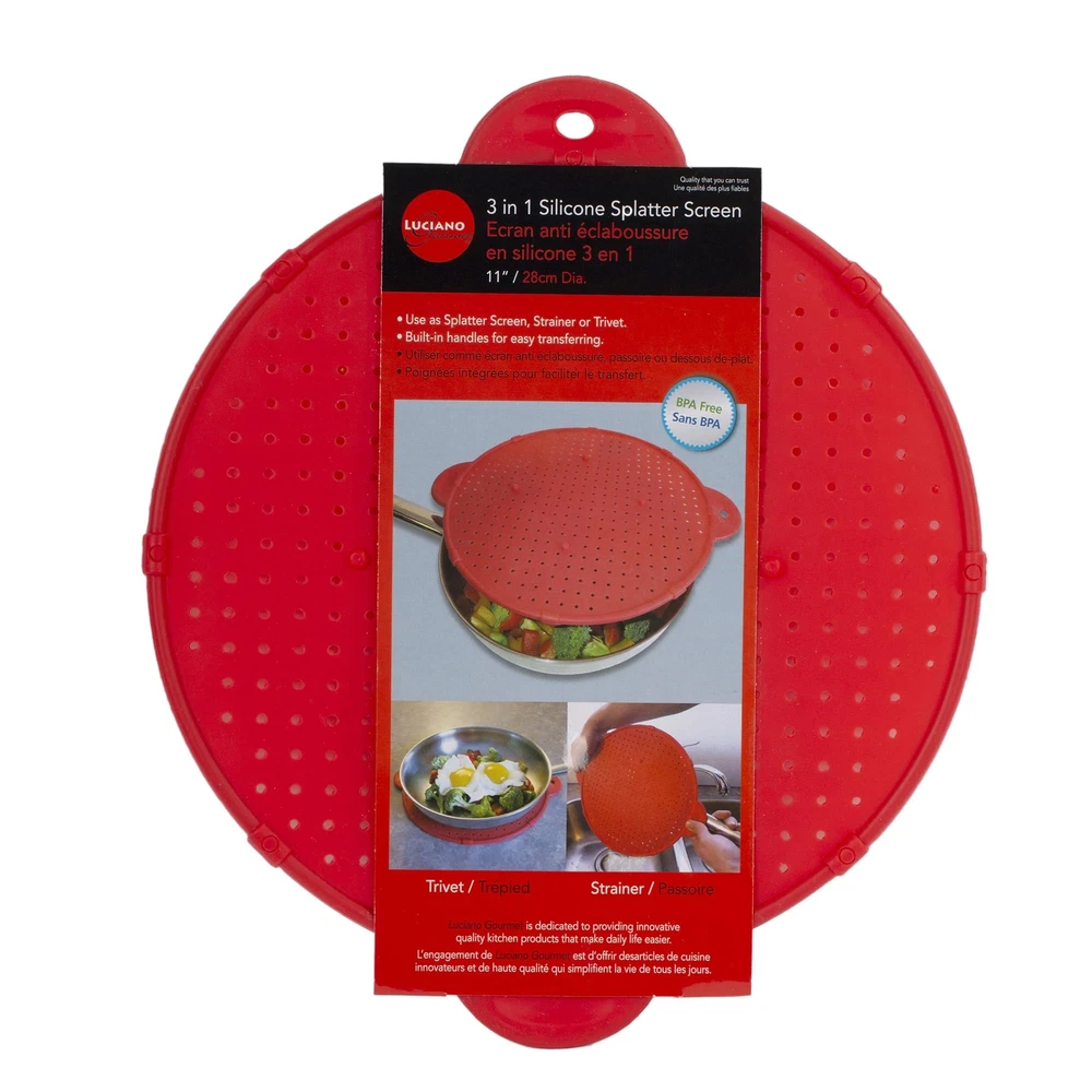 You can totally avoid the mess when frying chicken breast or making a schnitzel with Luciano Houseware’s silicone splatter screen. It can be used to solve three different problems: keeping oil from splashing onto the counter, cover your cooking pot while still releasing some air and steam, or using it as a strainer for rinsing food. The splatter screen is made of high-quality, durable and natural silicone material that withstands high temperatures and is dishwasher safe. It comes with two handles on both sides to makes sure you do not burn your hands when dealing with boiling water. This kitchen accessory is a must-have when you are cooking breakfast, lunch or dinner. MEASUREMENT: The splatter screen measures 11" in diameter, will perfectly cover any medium-sized pan MATERIAL: Made of high-quality, durable BPA-free silicone and a reinforced stainless-steel frame that promises durability and a long lifecycle DESIGN: The fry pan splatter screen has been developed with a smart design that will make sure you cook safely protecting from the dangers of hot oil and avoid any mess on your counters FEATURE: Comes with ergonomically designed silicone handles on both sides to make sure you can easily lift the splatter from a hot pan without burning yourself VERSATILE: The non-stick and heat-resistant cooking splatter screen is great to use while simmering food to maintain a stable heat level, it can be used as a drainer or trivet for hot pans, pots and plates