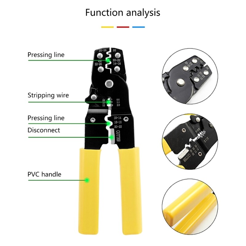 Features: High quality carbon steel material, suitable for multiple cable wire. Light weight, compact, and easy to operate. Good crimping effect, time-saving and effort-saving. handle portable suitable for various purposes. Multi-functionl:cut wire, strip wire, clamp, crimp the terminal with plier Specifications: Length:approx 18.5cm/7.28in Material:High Carbon Steel+PVC/TPR Weight:230g Color: Yellow Handle Insulating Terminals: AWG10-14/16-18/20-22 Non-Insulated Terminals:AWG14-18/20-22/22-26/ 26-28 Stripping AWG 22 16 12/ MM:0.6 1.3 2.0 Package Includes: x Wire note: Due to the problems of lighting effects and shooting angles, there will tolerances in the product, please understand. Please allow 0-1cm error due to the manual measurment.