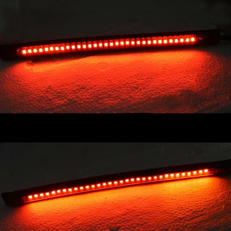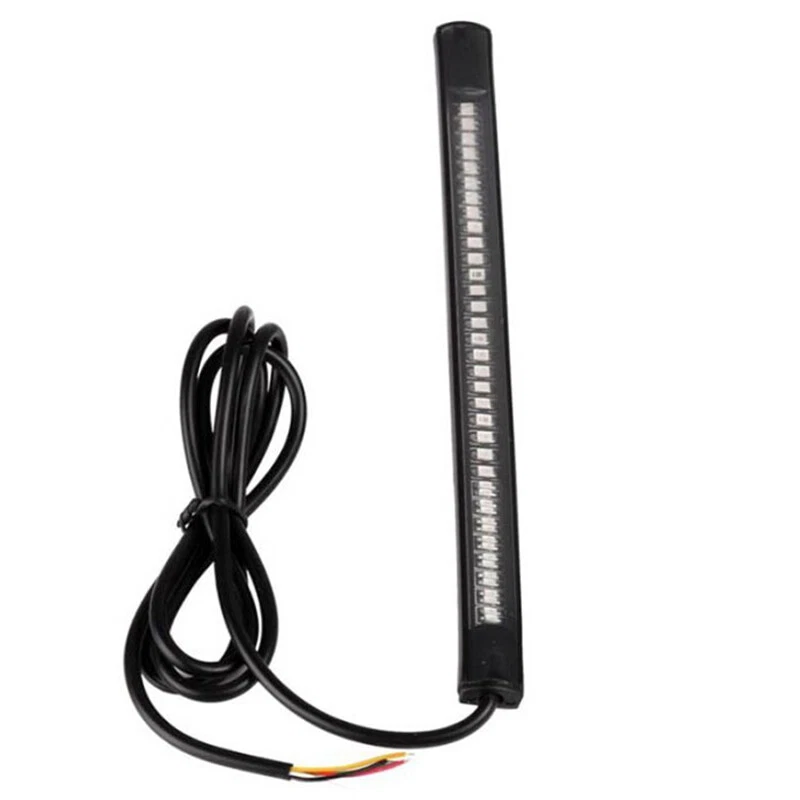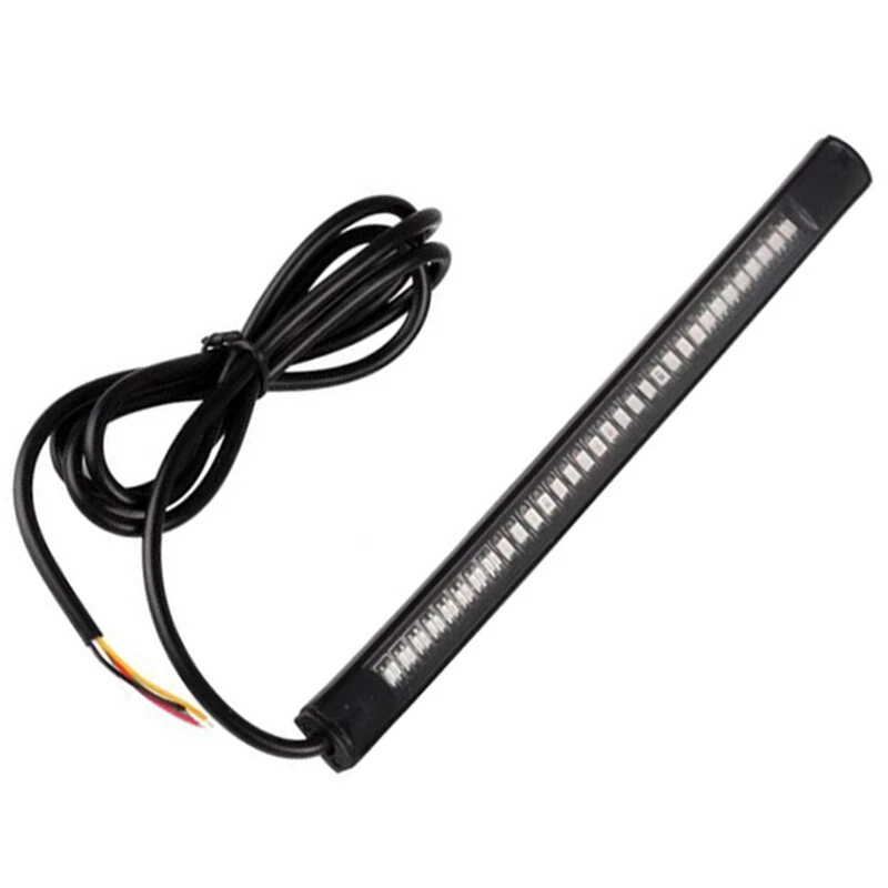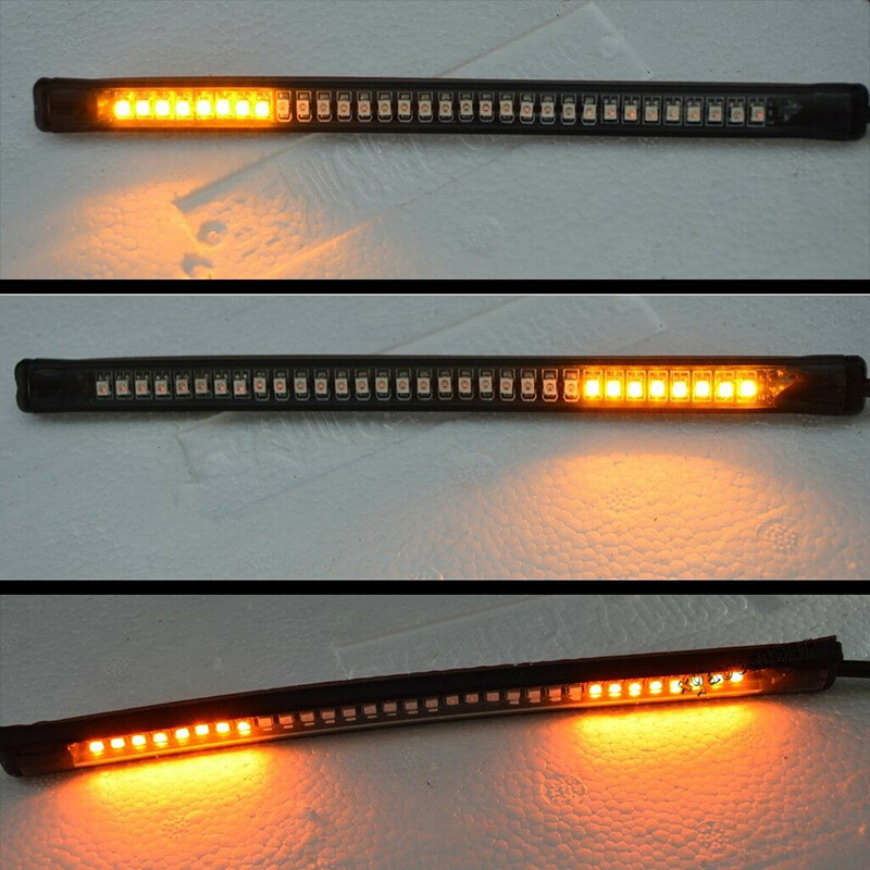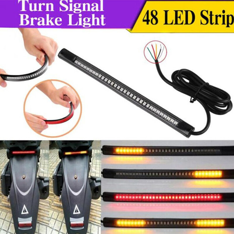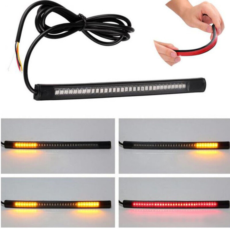 Multifunctions LED Motorcycle Strip Light Brake Tail Turn Signal License Plate Product Description This listing features for new intergrated led strip. With functions Turn Signal Stop Brake Light and Running Tail Light. Universal for Motorcycle License Plate Lights, Car License Plate Lights, Trailer lights etc. It also has many other common use. With tapes on backside of the strip, you can mount it anywhere ,for example , the curved fenders ,or some other places that hard to mount on. *add style and light up your cars / motorcycles / bikes etc. Feature: -Installs easily, Mount almost anywhere with 3M tape. -Low temperature, Low power consumption, lasts up to 50k hours. -Integrated LED light strip with turn signal. -Great product to Add-on brake light, running light and turn signal. -Super bright, high performance LED. -Silica gel manufactured housing, flexible and durable, waterproof and dust proof. -Different lighting colors and positions indicates your brake, running or turning left/right. -Universally fits for all motorcycles of DC 12~15V. Package Included: 1Pcs Multifunction LED Strip Specifics: Length : 20.5 CM Voltage : 12V Led Numbers : 48SMD Color : red / Amber Multi-functions : White wire -- low brightness Red (tail light ) Red wire -- high brightness Red ( brake light); Green wire -- left turn signal light Amber / Yellow Yellow wire -- right turn signal light Amber / Yellow Preview: