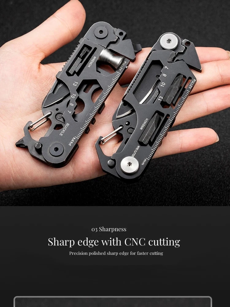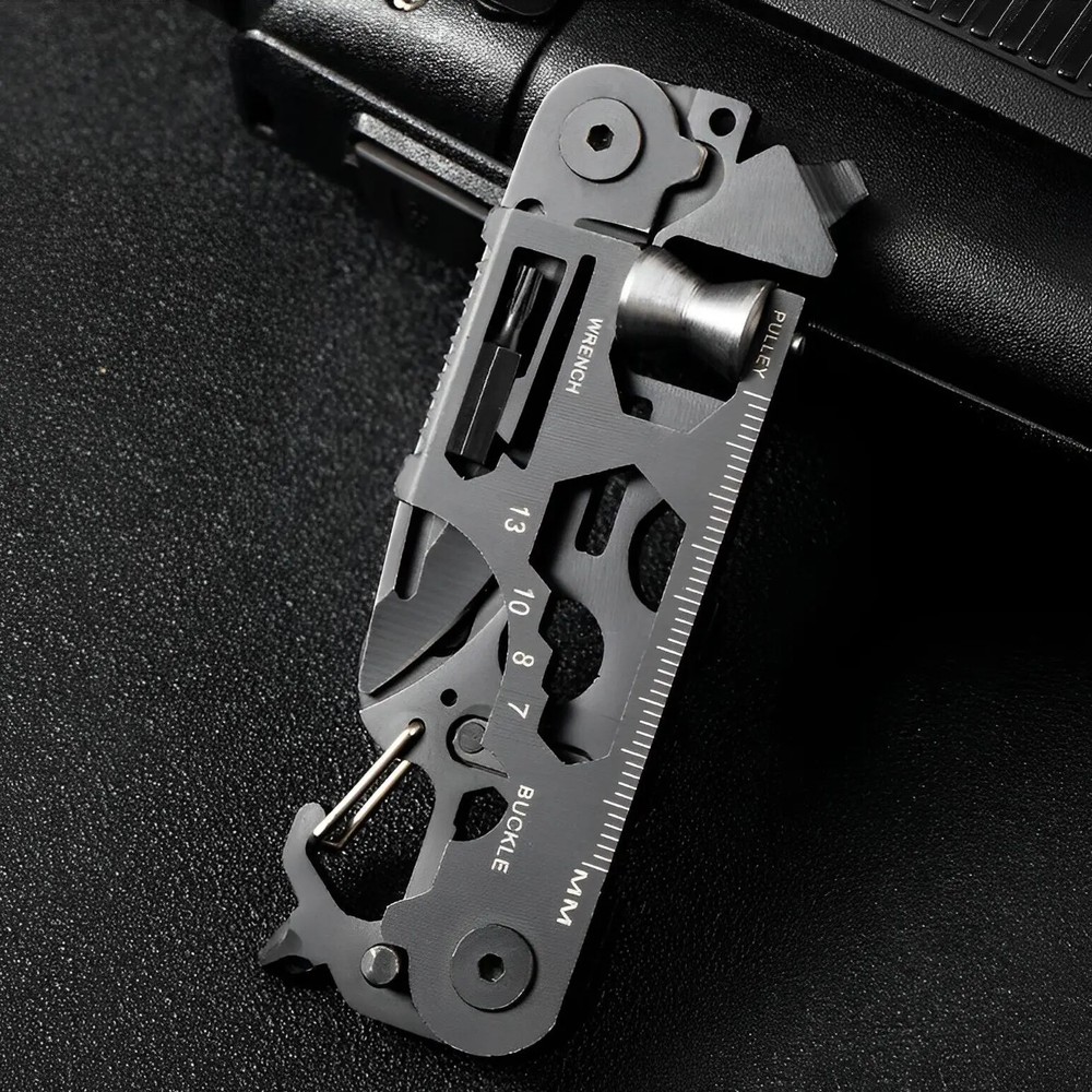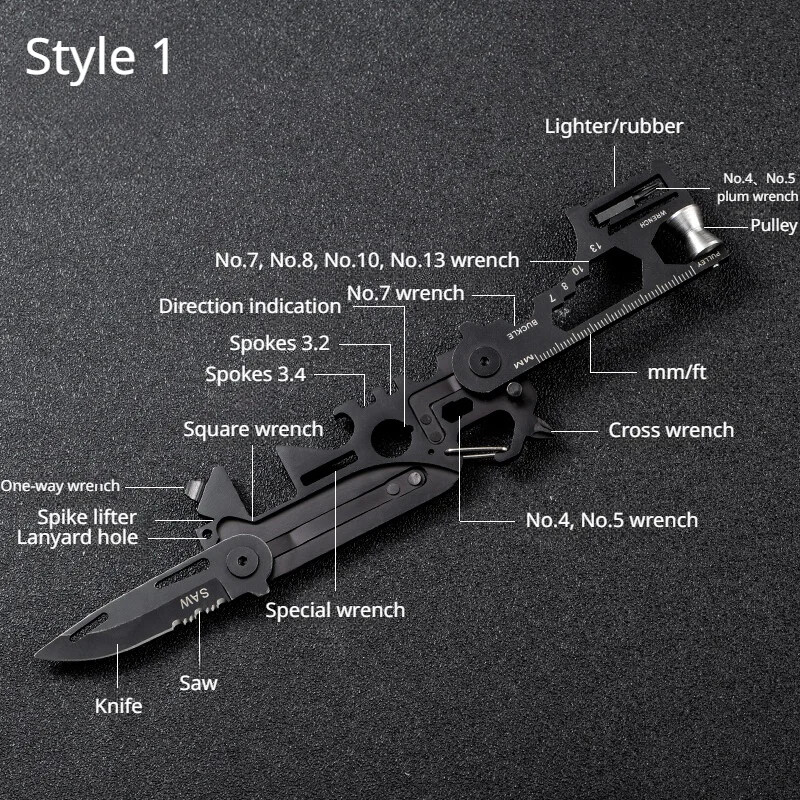 Product Description Name: Multifunctional Outdoor Tool Card Main Materials:Stainless Steel Product Weight:Approx. 87g/ 3.07oz Style: Outdoor、Tourism、Hiking、Camp Type: Camping Equipment、Camping Supplies Package List:1*Multifunctional Outdoor Tool Card Product Size Note : Since the product is an irregular object, this size is for reference only. Product Features Style 1 ①Knife ②Saw ③Special wrench ④No.4, No.5 wrench ⑤Cross wrench⑥mm/ft ⑦Pulley ⑧No.4、No.5 plum wrench ⑨Lighter/rubber ⑩No.7, No.8, No.10, No.13 wrench ⑪No.7 wrench ⑫Direction indication ⑬Spokes 3.2 ⑭Spokes 3.4 ⑮Square wrench ⑯One-way wrench ⑰Spike lifter ⑱Lanyard hole Style 2 ①Knife ②Saw ③Special wrench ④Direction indication ⑤Hexagonal wrench ⑥mm/ft ⑦Phillips screwdriver ⑧Rope cutter ⑨Lighter/rubber ⑩No. 7, No. 8, No. 10, No. 13 wrench ⑪One-way screwdriver ⑫4/5 angle wrench ⑬Spoke 3.2 ⑭Bottle opener ⑮Square wrench ⑯Lanyard hole