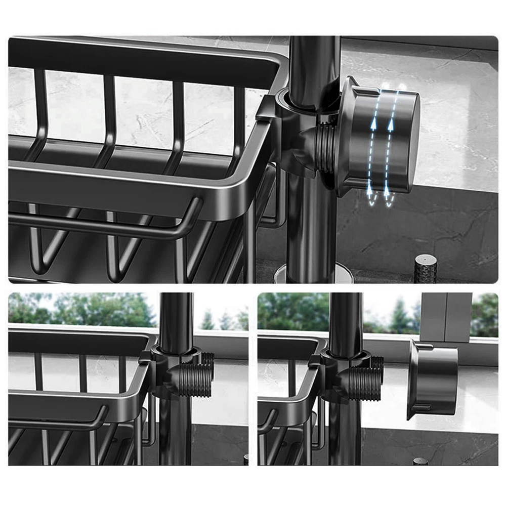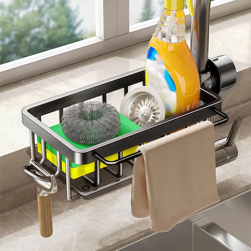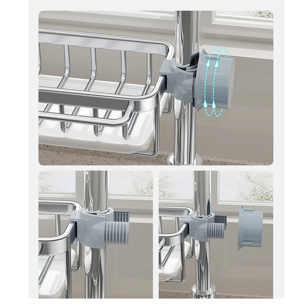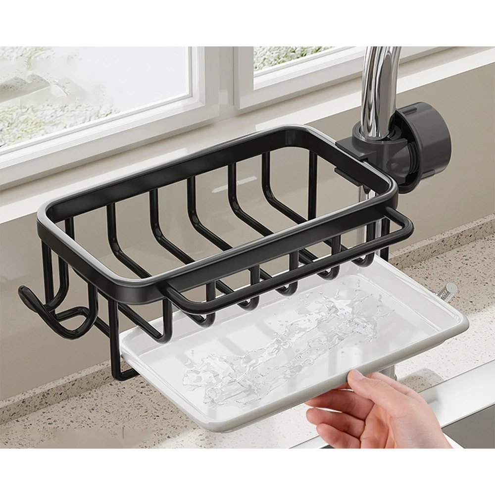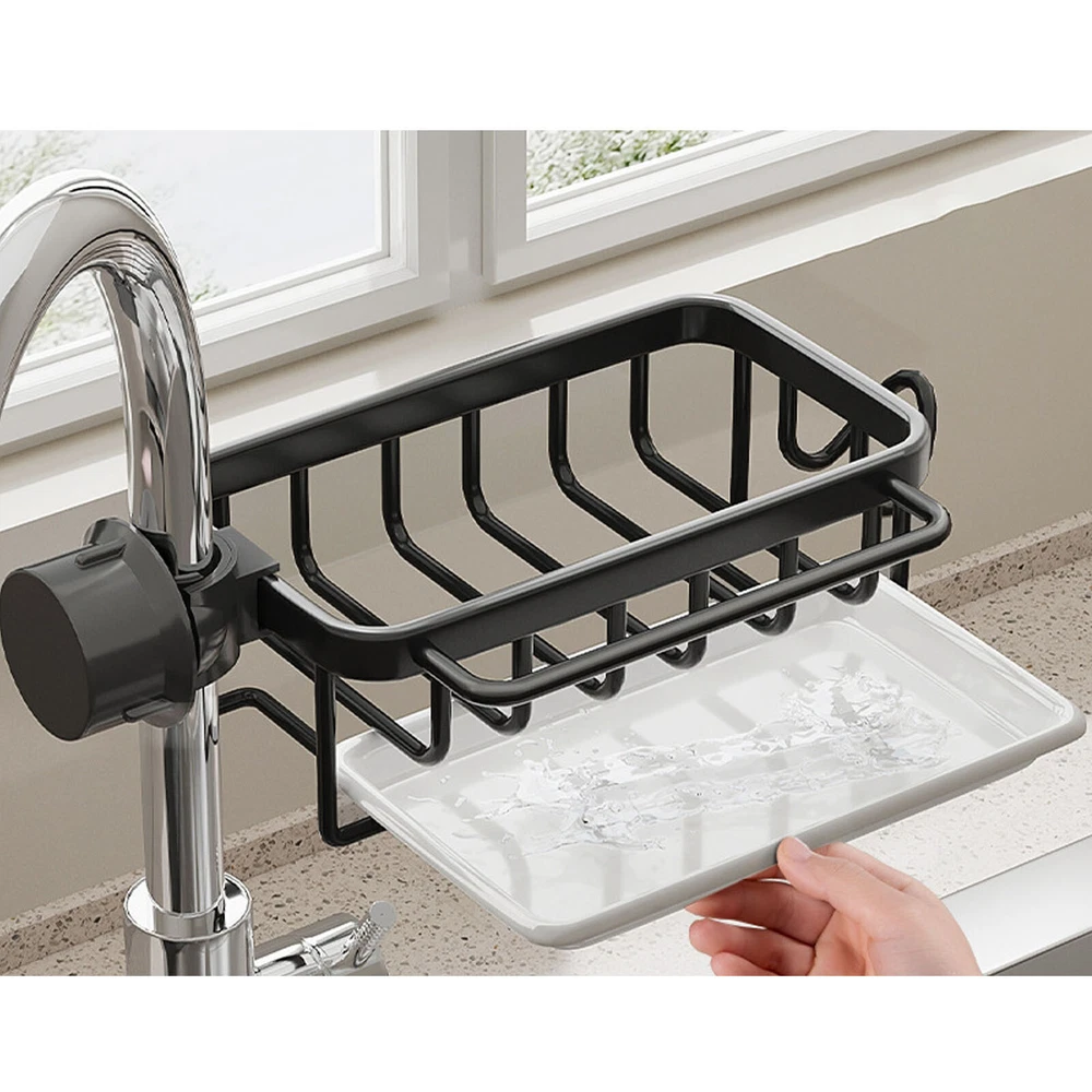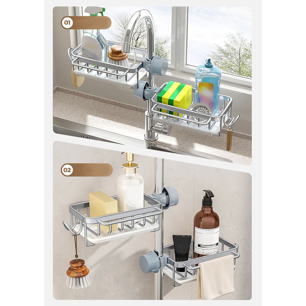 Feature: 1. All in One: Faucet drain rack provides a convenient organizer for your kitchen sink area, keeping everything you need within , practical and beautiful. 2. Space Saving: The compact size of this shelf maximizes your sink space, providing ample room for dishwashing sponges, brushes, cleaning cloth and more. 3. Smart Drainage: With a hollow design and a drip tray, which helps drain water from sponges and brushes to avoid dripping onto the ground. 4. Rustproof: Made of space aluminum and plastic, this drainrack is waterproof and resistant to rust, ensuring long lasting performance in a humid environment. 5. Easy Installation: Simply attach the shelf next to the faucet, no complixed tools required, easy to install and remove, stable and reliable. Specification: Item Type: Kitchen Faucet Organizer Material: Space aluminum + plastic Package List: 1 x Kitchen Faucet Organizer