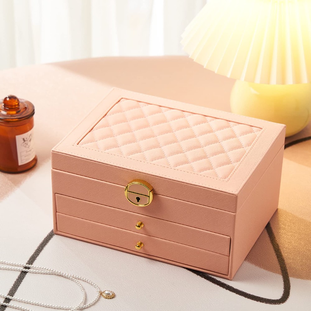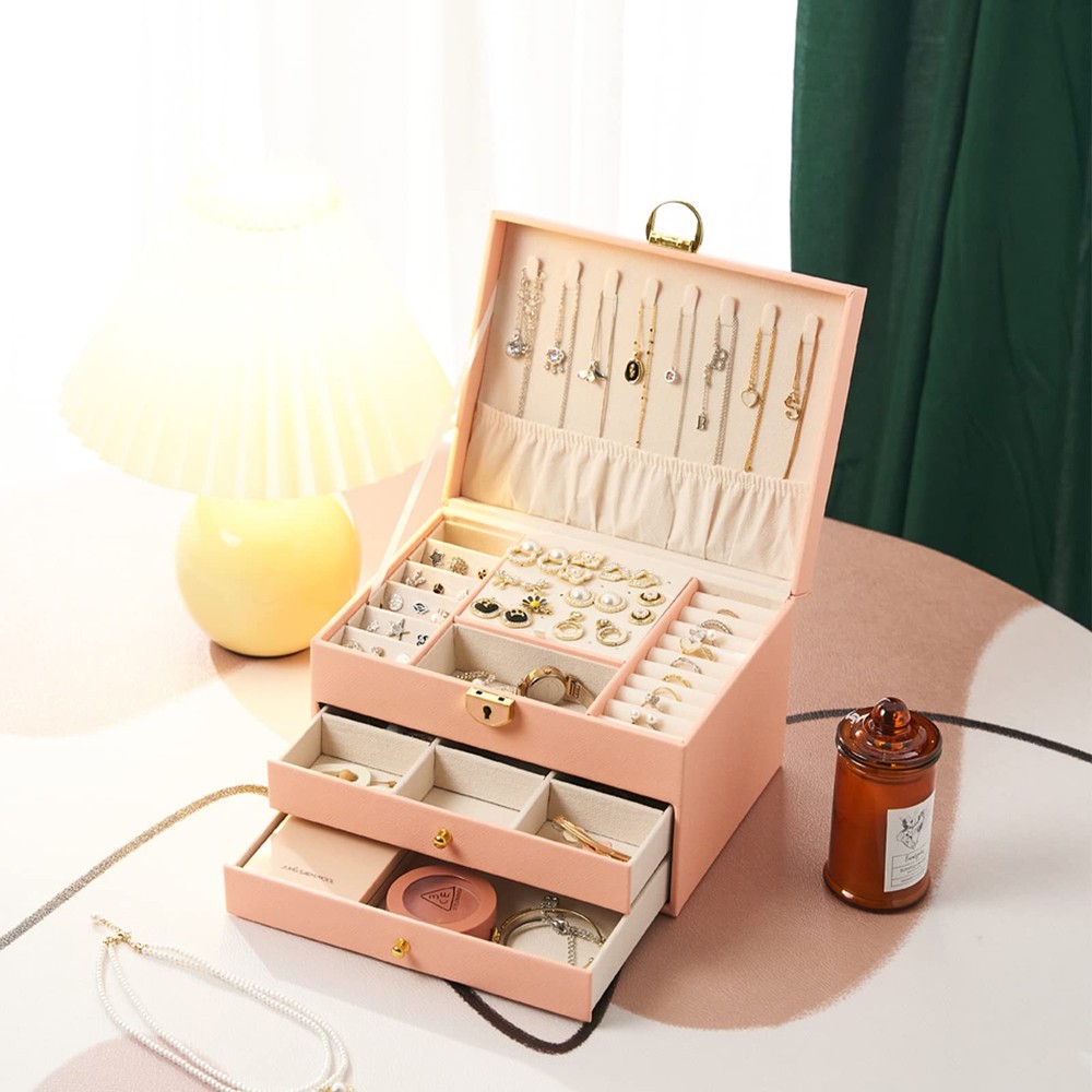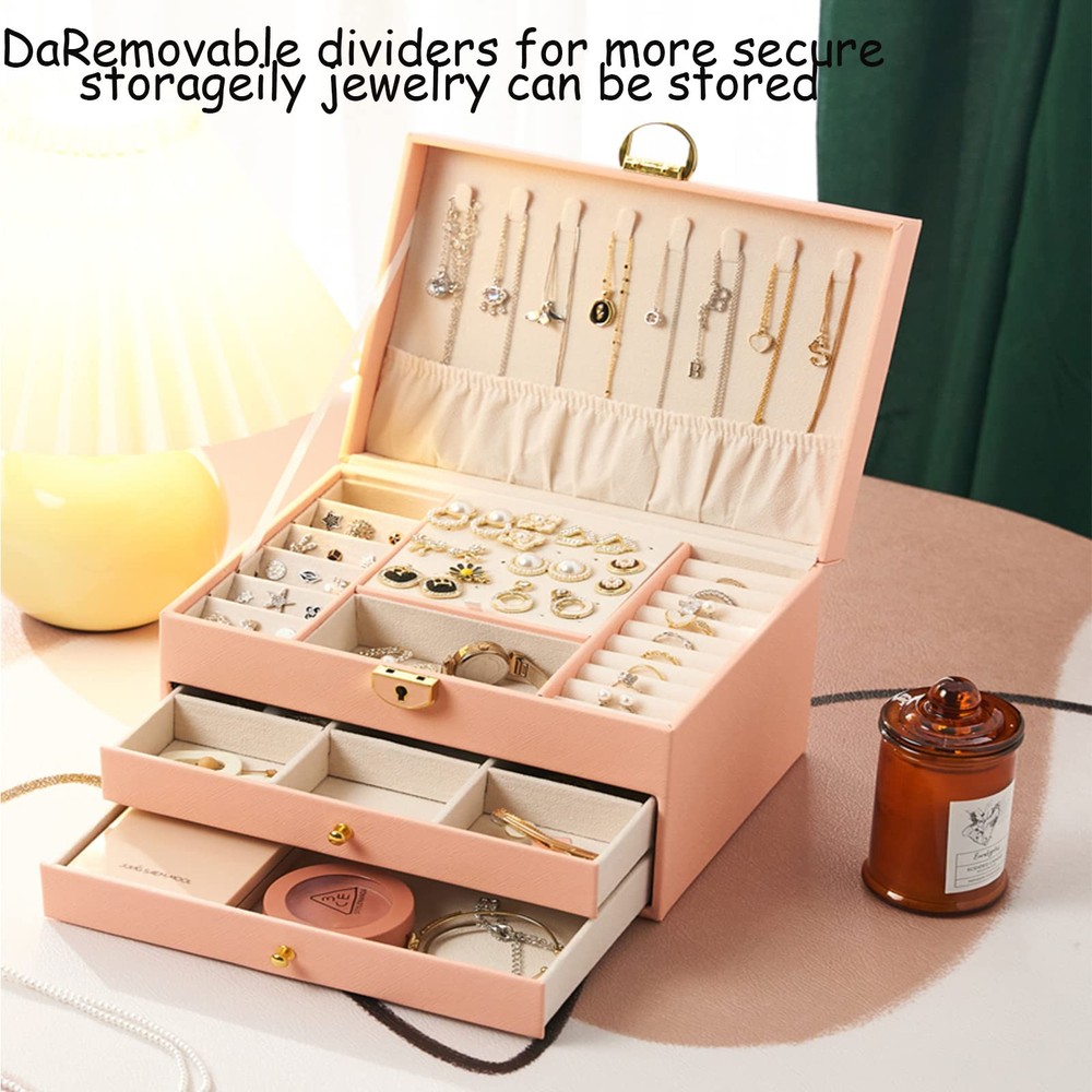MULTI-FUNCTIONAL STORAGE: The three-drawer jewelry organizer provides ample space to organize and store different types of jewelry, including necklaces, rings, earrings and more. It helps you keep your jewelry organized and easy to find the accessories you need. SECURITY PROTECTION: The storage box is equipped with a lockable design to keep your jewelry safe and protected. You can lock the box with a special key to avoid losing your jewelry or having it touched by others EXQUISITE DESIGN: The jewelry organizer is made of high quality materials and has a beautiful and elegant appearance. The inside of the box is meticulously designed with dividers and compartments so that each jewelry can have its own space to avoid collision and entanglement with each other. PORTABLE DESIGN: The organizer is of moderate size, easy to carry and travel with. Whether for home use or for travel, you can always take your jewelry with you and show your style. Exquisite details: every detail of the jewelry organizer has been carefully examined. The drawer is designed with a smooth slide for easy opening and closing; the interior is filled with soft velvet material to provide gentle protection for jewelry EXQUISITE APPEARANCE: The jewelry organizer is designed with a simple and stylish appearance, which adds a sense of style and elegance whether you place it at home or take it out with you. It is also a great gift option for family, friends or jewelry lovers.