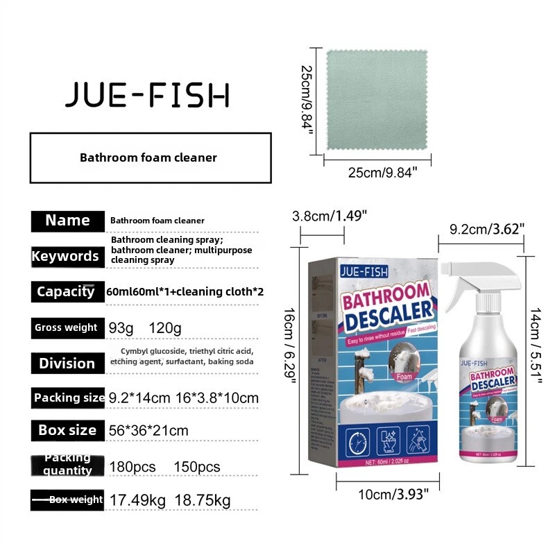 Capacity: One bottle of 60ml Color: As shown in the picture 1. Strong stain removal: Bathroom cleaner can quickly and effectively remove stains on places such as stainless steel washbasins, bathtubs, shower glass, etc., making your bathroom look brand new. 2. Effective sterilization: The bathroom is a breeding ground for bad thing, and bathroom cleaners can thoroughly kill bad thing, ensuring the health of you and your family. 3. Non damaging materials: The bathroom cleaner uses a mild formula that will not cause damage to materials such as stainless steel and glass, protecting your furniture. 4. Easy to clean and wipe: Using bathroom cleaner can easily remove stains without leaving any traces, making your cleaning work more efficient. 5. Restoring Brightness: Bathroom cleaners effectively remove stains, restore the original luster of the place, and make your bathroom and home environment more refreshing and bright. The package includes: 1 cleaning agent/set of cleaning agents (including 1 cleaning agents+2 cleaning cloths)
