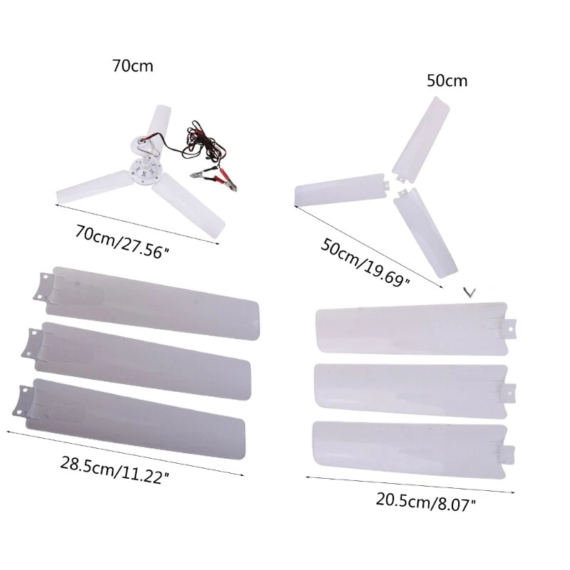 Features: Great travel fan for cooling or beauty in hot weather activities such as sunbathing and camping,Picnics,Barbecue and more Small ceiling fan great for hot summer and windless day, also for bed or outdoor camping tents. Power source: 12V Storage Battery or 12V 3A or higher-power adapter,without speed control function. The mini fan with strong wind, brings you a comfortable and cool summer. Hanging- fans are Compact- and lightweight, Soft wind with little noise, Safe to use and energy saving. Specifications: Material:ABS Diameter:70cm/27.5'',50cm/19.7'' Power Cable Length:Approx. 2.8meters/110'' 50cm Diameter Fan Leaf Length:Approx.20.5cm/8'' 70cm Diameter Fan Leaf Length:Approx.28.5cm/11.2'' Power:18W(50cm Diameter Fan),20W(70cm Diameter Fan), Package Includes: 1Set 12V Ceiling Fan note: Please allow 1mm errors due to manual measurement. Due to the difference between different monitors, the picture may not reflect the actual color of the item.