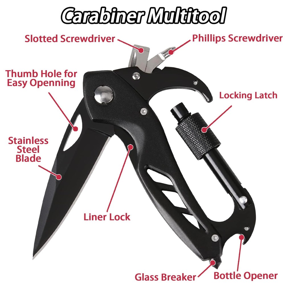 Carabiner with Knife, Multitool Carabiner Pocket Knife, Folding Sharp Knives, Sturdy Handy Tool, Belt Cutter, Bottle Opener, Window Breaker, Screwdriver, for Safety in Car, Camping, Hiking 7-IN-1: Carabiner multitool compacts 7 functions in 1, essential for outdoor and everyday tasks. Includes folding knife with sharp blade, bottle opener, glass breaker, screwdrivers, keychain clip. Carabiner pocket knife is extremely handy and gets lots of usage, for safety in the car, Camping, Hiking and outdoors adventures. RELIABLE: Multitool carabiner with knife is made of aluminum alloy and high-quality stainless steel. Carabiner multi tools is foldable, sturdy and safety, which is one of your handy reliable essential. Knife multitool carabiner meets demands of outdoor tasks and emergencies, like hanging hammock or cutting belt. SMART SIZE: Carabiner with handy tools comes in a smart size 4.5x2.4" (unfold size 7.3x2.4"), lightweight 3.5oz. The self defense multitool can be easily hooked it onto a belt loop or attached to backpack strap, keychain and more. You can just keep it in your pocket. SAFE: Pocket knife carabiner is designed with locking latch for safe, thumb hole for easy open and close. Ergonomic design makes it comfort holding. It is not recommended to support human weight when climbing. UNIQUE GIFT: Multitool carabiner with pocket knife combines practicality and convenience. As must-have handy comfortable tools for Safety in Car, Camping, Hiking or outdoor adventures, it is a great unique gift thought. If any question, please feel free to contact us directly. 【Multitool Carabiner】Our carabiner multi-tool is compactly offering 7 functions in 1, as an essential companion for outdoor survival and everyday tasks. This survival multitool includes folding pocket knife, bottle opener, glass breaker, phillips screwdriver, slot screwdriver, carabiner keychain clip. A great tactical carabiner and survival gear that can meet various outdoor tasks camping hiking. 【Best Outdoor Gift】This multitool carabiner is combines practicality and convenience. It is a must-have survival keychain for camping, backpacking, hiking, hunting and other outdoor activities. This is a great gift for friends and family who loves outdoor activities. If any questions about the multitool, please feel free to contact us directly. We will give you a satisfactory solution. Shipping We offer FREE shipping on all orders! We ship within Three business days of payment, usually sooner. We use a selection of shipping services such as UPS, FedEx, USPS etc. We only ship to the lower 48 states, no APO/FPO addresses or PO Boxes allowed. Local pickups and combined shipping options are not provided at this time. Return You can return a product for up to 30 days from the date you purchased it. Any product you return must be in the same condition you received it and in the original packaging. Please keep the receipt. Payment We accept payment by any of the following methods: PayPal Please pay as soon as possible after winning an auction, as that will allow us to post your item to you sooner! Feedback Customer satisfaction is very important to us. If you have any problem with your order, please contact us and we will do our best to make you satisfied. Contact Us If you have any queries, please contact us via ebay. We usually respond within 24 hours on weekdays. Please visit our eBay store to check out other items for sale! Thank you for shopping at our store.