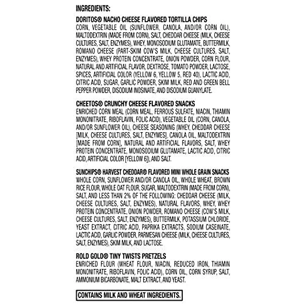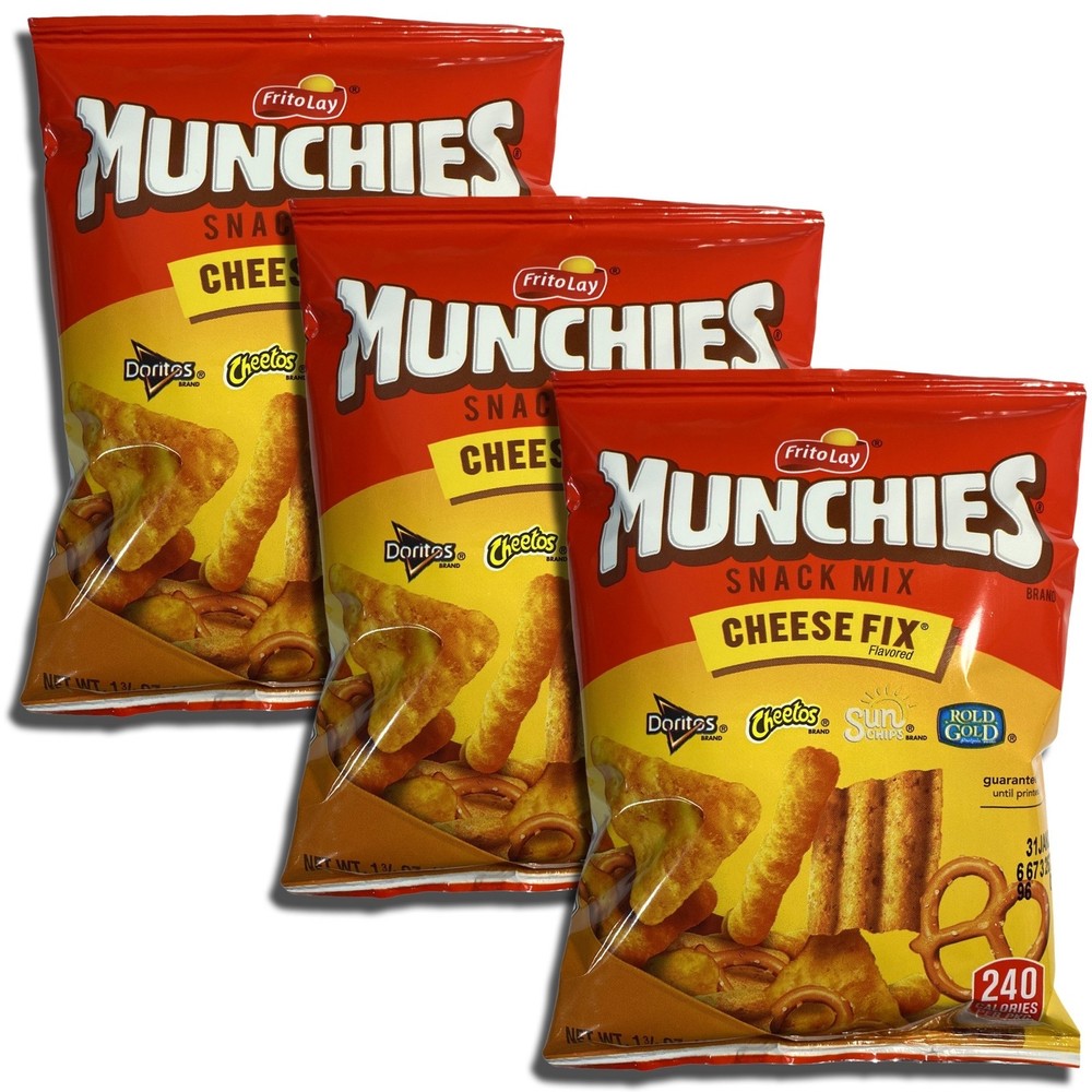 << The item is a Size >> Contains 16 Bags Of 1.75 Oz Munchies Cheese Fix Snack Mix Munchies Cheese Fix Snack Mix – The Ultimate Cheesy Combo! Munchies Cheese Fix is your dream team of crunchy favorites – Doritos, Cheetos, Sun Chips, and Pretzels – all seasoned with cheesy goodness. A balanced bite of bold flavor and fun texture in every handful! Weight: 1.75 oz per bag, 16 bags Nutrition facts: ~140 calories per bag, cheesy flavor, contains wheat and dairy Main ingredients: Cornmeal, cheese blend, oils, wheat flour, spices Ideal for cheese lovers, party bowls, and snack stash essentials! #CheeseFix #MunchiesMix #SnackLife #CrunchyCombo #SnackTok Contains 16 Bags Of 1.75 Oz Munchies Cheese Fix Snack Mix 16 Bags Of 1.75 Oz Munchies Cheese Fix Snack Mix||A Combination Of Doritos Nacho Cheese Tortilla Chips, Cheetos Crunchy Cheese Flavored Snacks, Sunchips Harvest Cheddar Multigrain Snacks And Rold Gold Pretzels||Munchies Cheese Fix Snack Mix Delivers All Of Your Favorites In One Bag||Great For School, Work, Home, And Snacking On The Go||Why Spend Tons Of Money On Cases When You Can Get The Perfect Amount In A Convenient Package