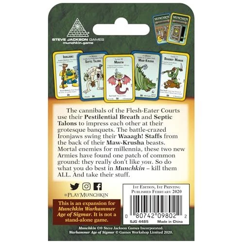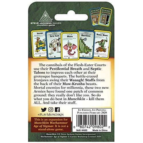 The cannibals of the Flesh-Eater Courts use their Pestilential Breath and Septic Talons to impress each other at their grotesque banquets. The battle crazed Ironjaws swing their Waaagh! Staffs from the back of their Maw-Krusha beasts. Mortal enemies for millennia, these two new Armies have found one patch of common ground: they really don't like you. So, do what you do best in Munchkin – kill them ALL and take their stuff. This is a 112-card EXPANSION for Munchkin Warhammer Age of Sigmar but can be added to any Munchkin game! Adds two new armies to your Munchkin Warhammer Age of Sigmar game: Flesh-Eater Courts and Ironjaws! 3-6 players 1-2 hours average play time Recommended for ages 10 and up