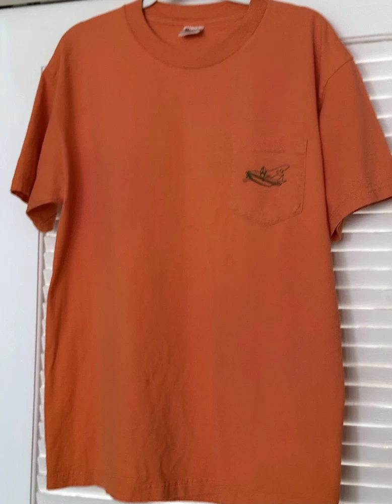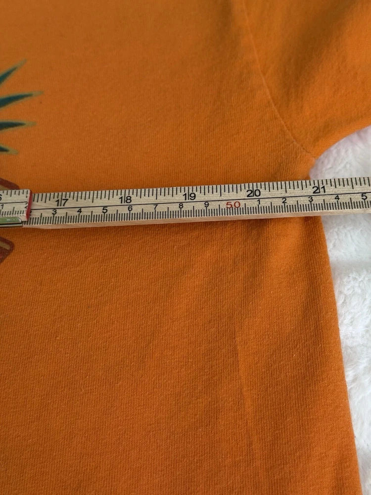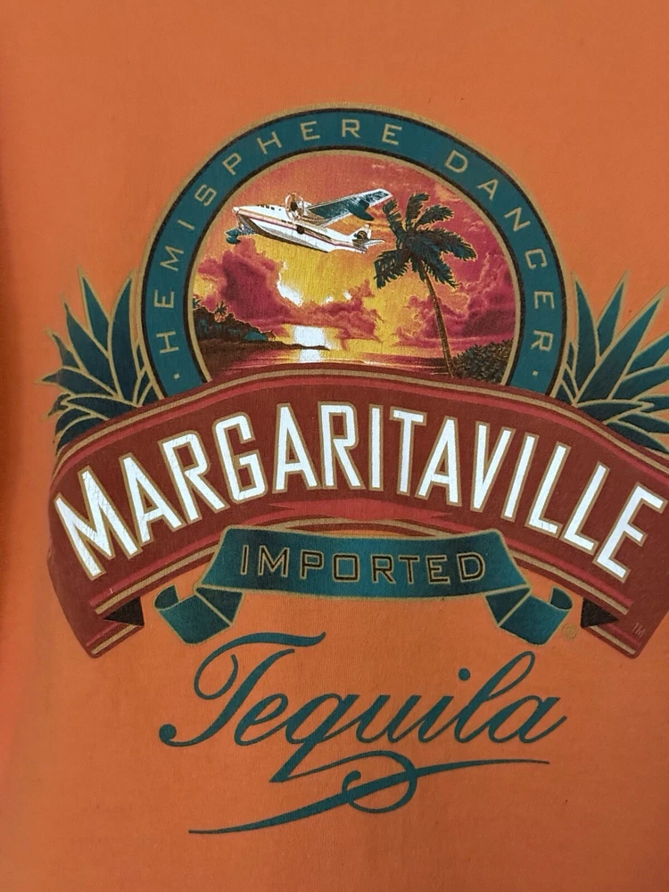 Get ready for a tropical escape with this colorful Marina-Jimmy Buffet Margaritaville T-Shirt. Made with comfortable cotton jersey fabric, this short sleeve shirt features a crew neck and a regular fit for a casual look. The orange shirt is adorned with a graphic print on the back, showcasing the iconic Margaritaville logo and the American flag. Perfect for a day at the beach or a casual outing, this T-shirt is machine washable and easy to maintain. The shirt is ideal for those who love art, music, and nautical themes, as well as those who enjoy colorful and unique clothing. With a pocket for added convenience, this T-shirt is a great addition to any wardrobe. See photos for preowned condition snd sizing.