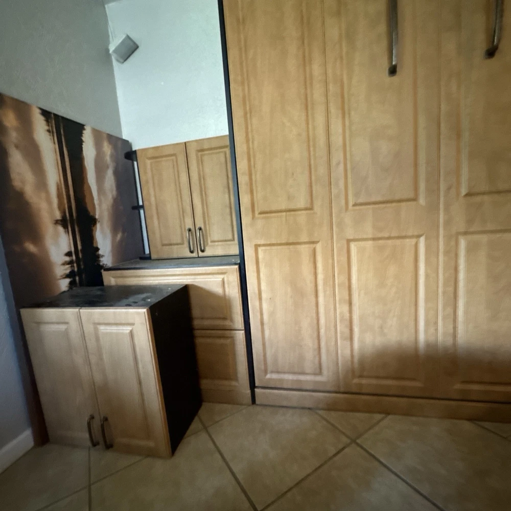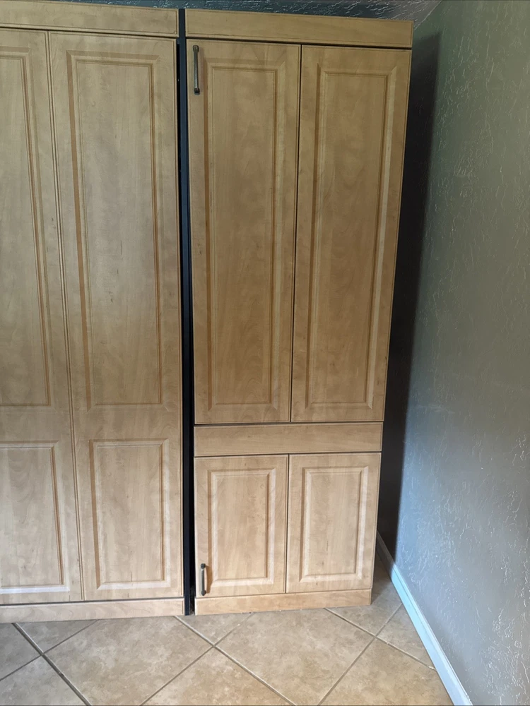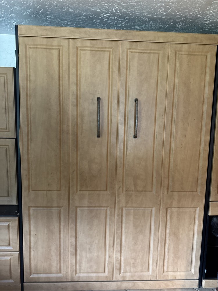 The Murphy Wall Bed Springs Hinges Mechanism Hardware Desk with Four Shelf Drawers is a functional and stylish addition to any bedroom. Made with a wood and metal frame, this Queen-sized wall bed is easy to care for and assemble. It comes in a classic brown color. This piece offers a convenient desk area with four shelf drawers for added storage, making it a versatile and practical choice for adults looking to maximize their space in their bedroom.