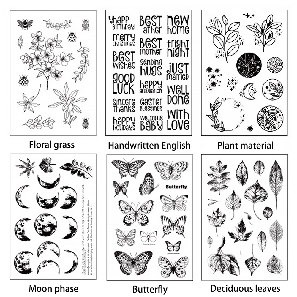 Festival thematic patterns- These clear stamp cards feature various festival animals and plants elements, including greeting words, flowers, leaves, butterflies, and moons, etc. printed on the back of these cards, easy for you to express your love to friends, lover, families and classmates. Quality Material- These silicone clear stamps are made of durable silicone material, which is safe and lightweight, not easy to break or deform, allows you to apply for a long time, just press on the paper or card gently, it will appear a variety of patterns. Easy to Use - Simply place the stamp on an acrylic block (not included), and press it onto paper or cards. Let them air-dry, and your exquisite work is complete. Please note that you should clean them with water after use for more convenient use next time. Creative Ornaments- Once you've stamped a design onto a piece of paper or card, you can use a craft ink pad to add color and create an exquisite embellishment for holiday cards, scrapbook pages, journaling, or any other paper craft projects. These stamps are also perfect for creating unique and creative gifts for your friends. Quantity & Size- You will receive 6 sheets of festival-themed clear stamps in 6 different styles, with each sheet measuring 4.3 x 6.2 inches (11 x 16cm).