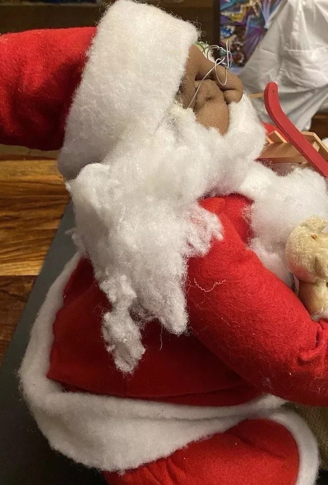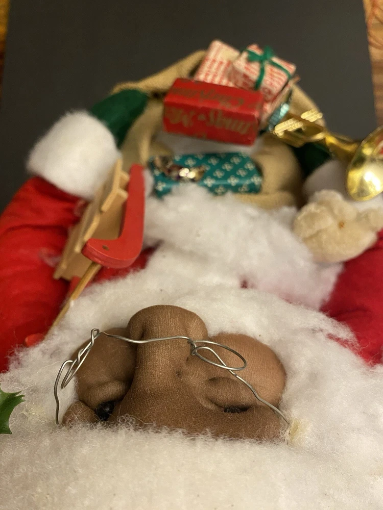 This item has been in my family’s collection since the 90s, with only one owner. We hadn’t planned to part with it, but hard times force the sale. This is my best price, and I hope it finds a home where it’s valued. This handmade Santa Claus doll is a delightful, one-of-a-kind piece crafted entirely from soft fabric, down to its intricate facial features. He is sitting on a wooden like circle unseen. Santa holds a sack filled with gifts, including a trumpet, sled, and presents. Please note, this item does not include any packaging or certificates, and it’s unclear if it originally came with any. However, the doll is in perfect, like-new condition (used as a display in a store) and would be a charming addition to any Christmas décor or doll collection. You will be the only one to have THIS SANTA