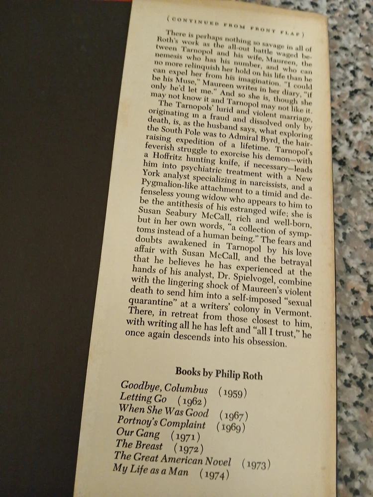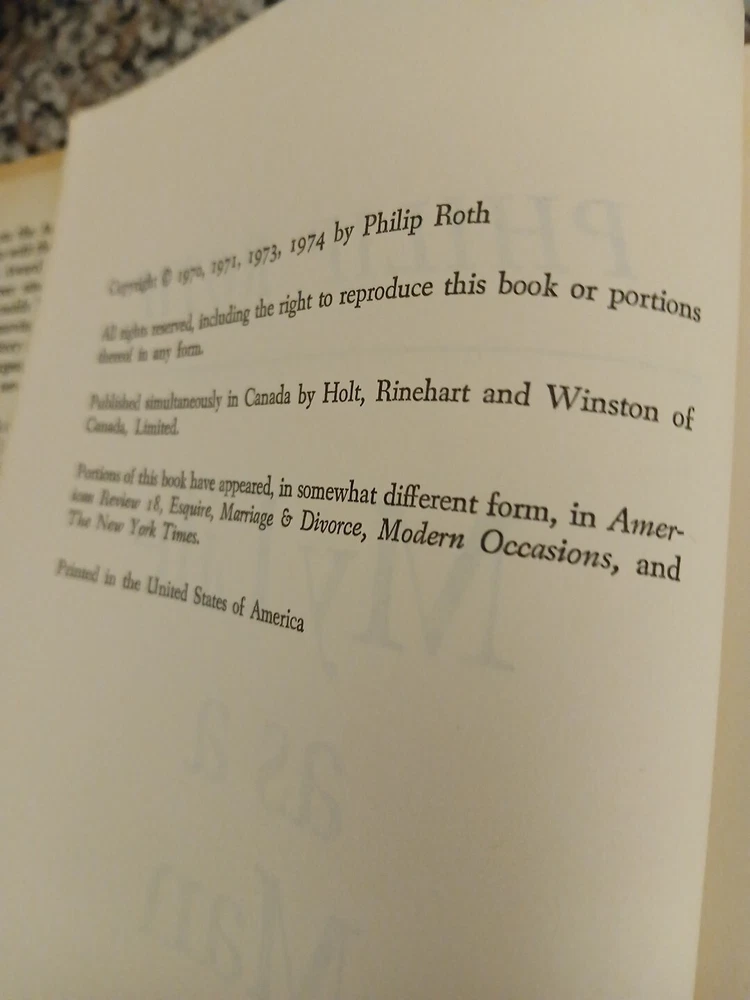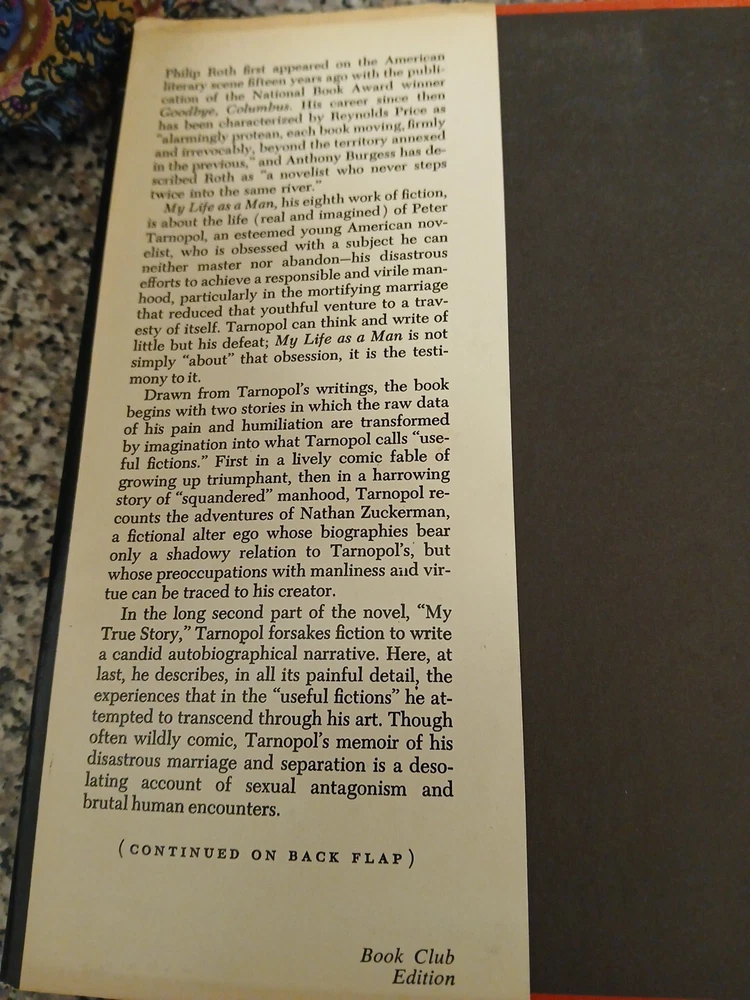 This hardcover book club edition of "My Life as a Man" by Philip Roth is a must-have for any book collection. The book explores a range of topics including divorce, relationships, life crisis, personal development, family life, social situations, death, relations, marriage, and emotional intelligence. The publication year of the book is 1974 and it is written in English. The publisher is Holt, Rinehart and Winston. This book is perfect for those interested in exploring the complexities of human life and the intricacies of personal relationship as well and over-abundance of problems with self with no seemingly way out of the self-image so suppressed if not depressed.