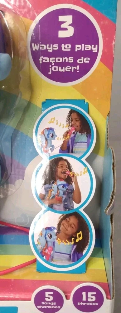 My Little Pony Friendship Magic Singing Rainbow Dash BNIB is a colourful action figure featuring everyone's favourite character, Rainbow Dash, from the beloved TV show My Little Pony. This multicolored figure comes with a microphone for added playtime fun. Made of vinyl and plastic, this 2016 manufactured toy is suitable for children aged 3-4 years. With the ability to sing, this original Hasbro product is a must-have for any My Little Pony fan.
