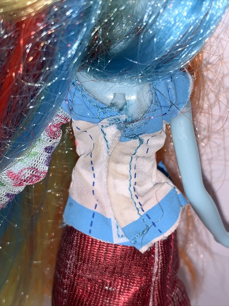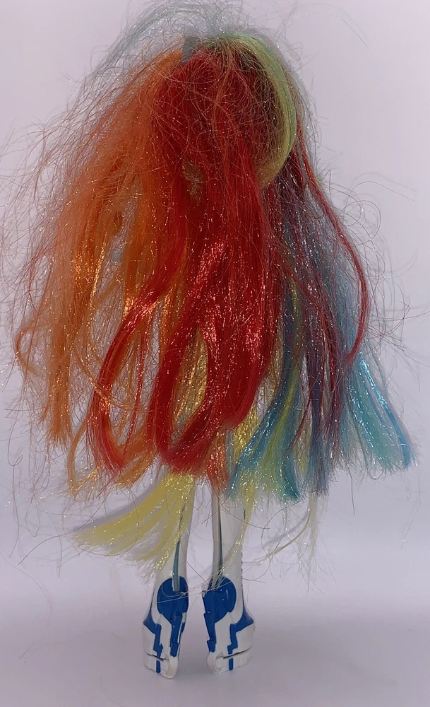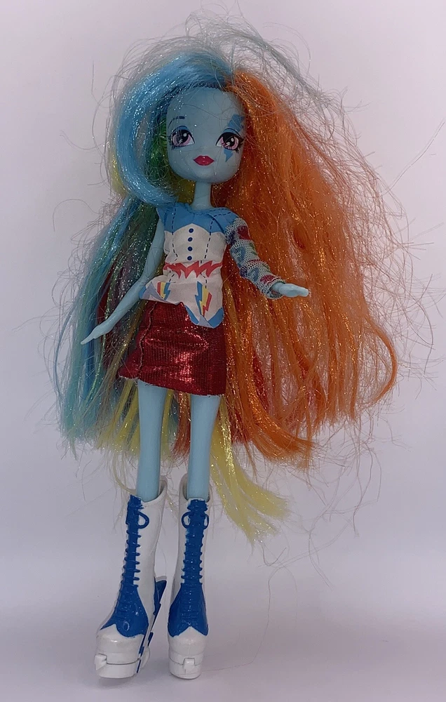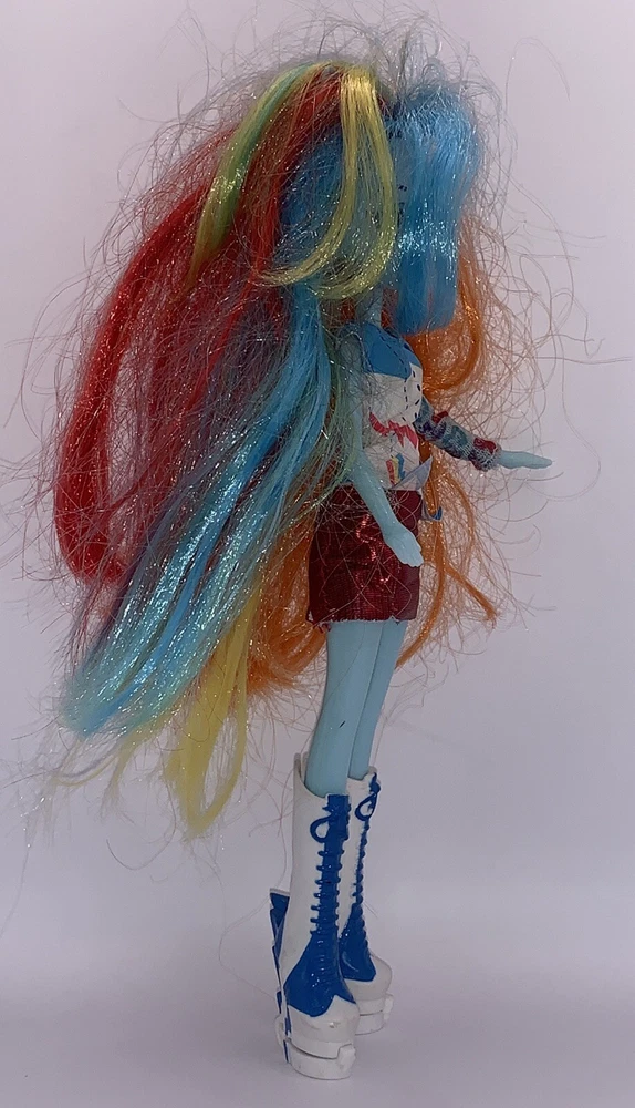 My Little Pony Equestria Girls Rainbow Dash Doll is missing her guitar but she is still fabulous! This 9-inch fashion doll comes with her multicolored outfit, shoes, and a blue complexion. Her hair color is a mix of colors and her eyes are pink. The doll is perfect for fans of the Music theme and Hasbro brand. Missing guitar. Dolls hair is a bit outta wack but can be fixed.