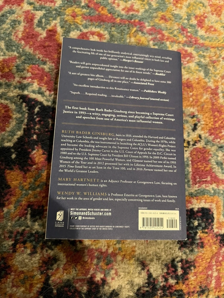 This book, titled "My Own Words" by Ruth Bader Ginsburg, is a must-have for anyone interested in women's rights, American government, and the law. With a publication year of 2018 and a length of 8.4 inches, this trade paperback is easy to carry and read. The book has 400 pages and is written in English. The author, Ruth Bader Ginsburg, is a well-known lawyer and judge, and this book is a collection of her personal experiences and reflections on the law. It includes topics such as gender and the law, lawyers and judges, and the American judicial branch. This book is perfect for anyone interested in biography, autobiography, and political science.