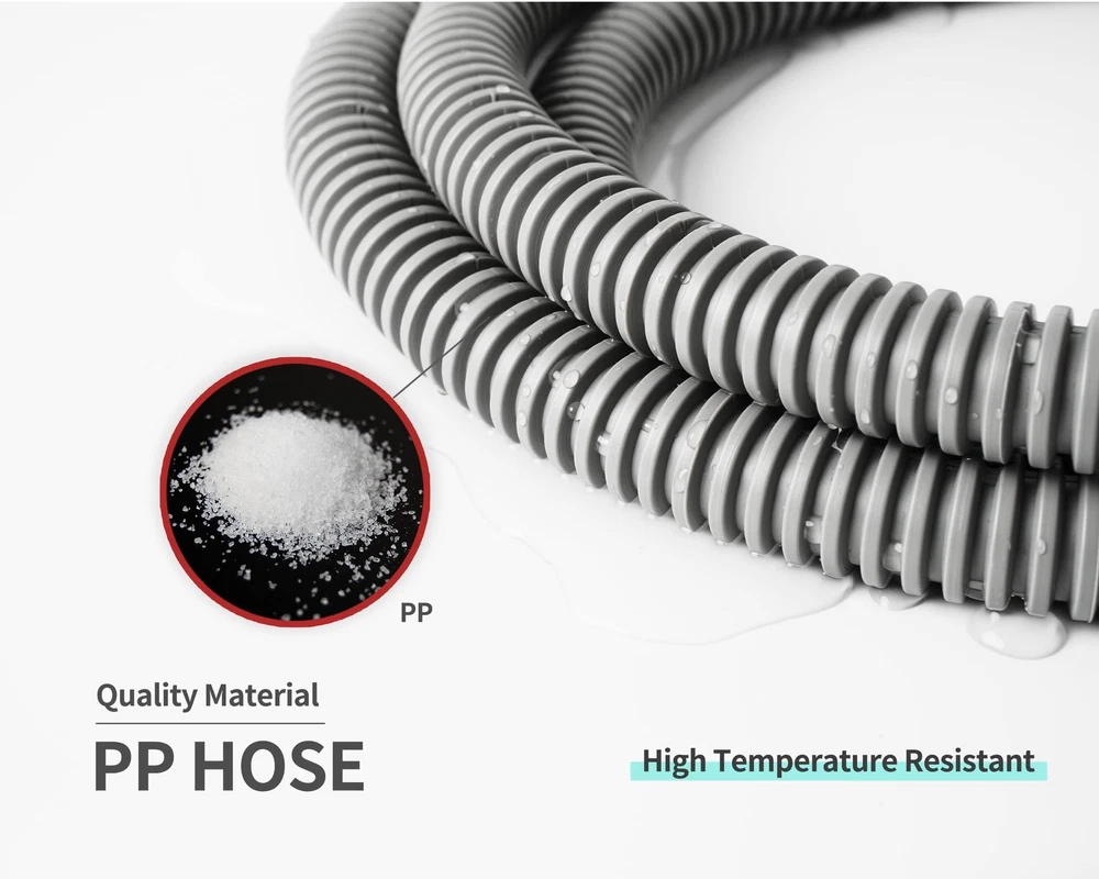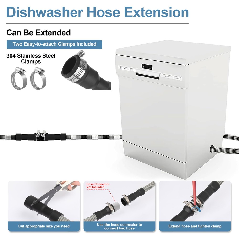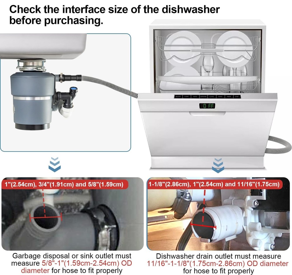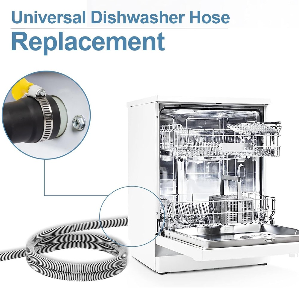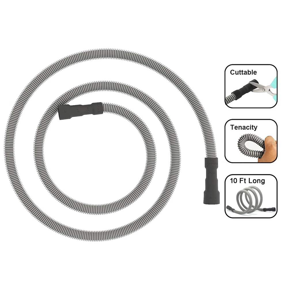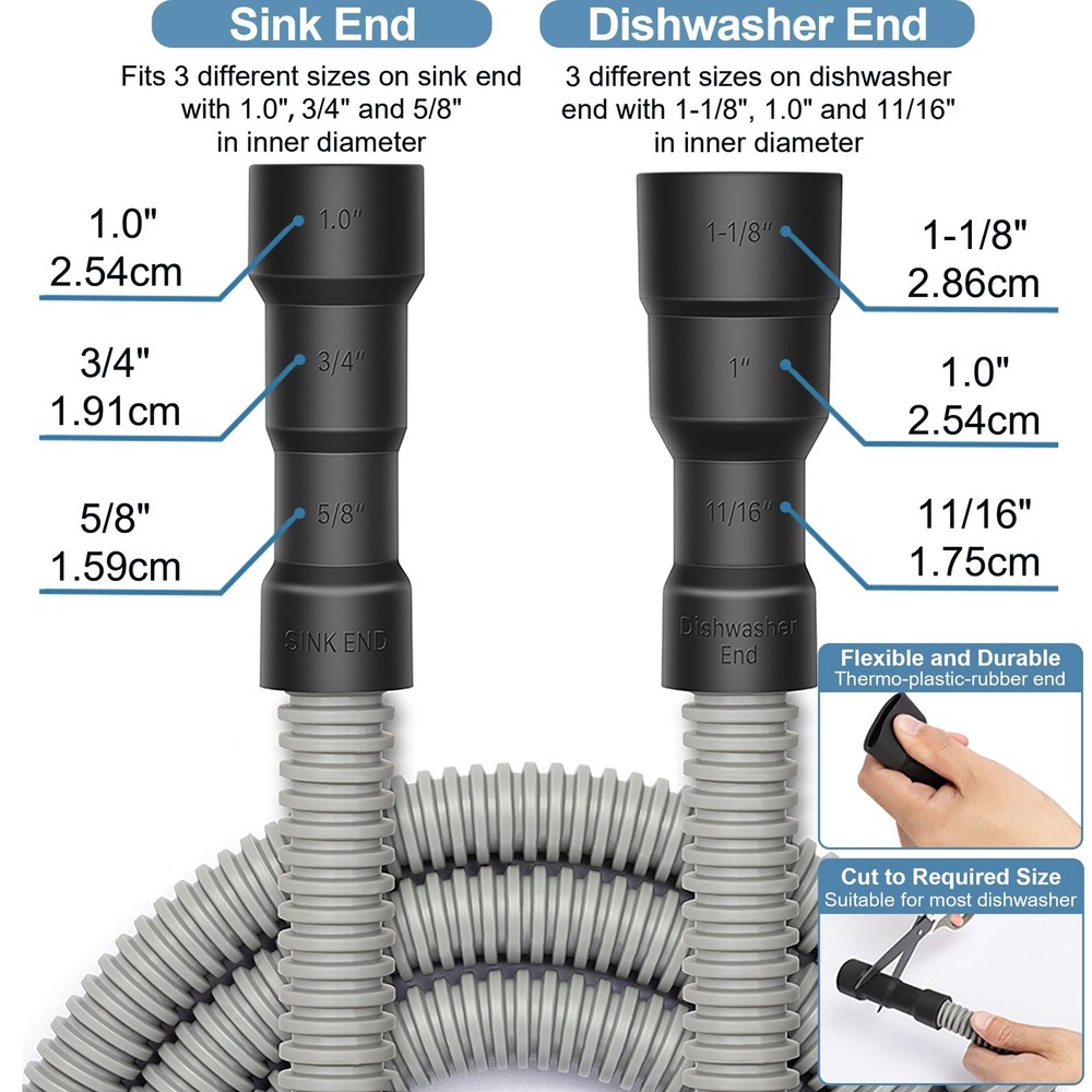 This dishwasher drain hose is made of premium material, it is durable, odorless and anti-aging, with the features of high pressure resistant, ultra-flexible and not easily deformed It is a good dishwasher replacement hose or a hose extension. Size Details: Dishwasher drain hose comes with three sizes of connectors for the 10 ft dishwasher 1-1/8"(2.86cm), 1"(2.54cm) and 11/16"(1.75cm), and three sizes for the sink 1"(2.54cm), 3/4"(1.91cm) and 5/8"(1.59cm). Dishwasher hose kit can be cut to your desired length. Notice: Please check that this drain hose will fit your dishwasher before purchasing Universal Dishwasher Hose Replacement Kit or Extension: This hose can extend or replace the dishwasher drain hose and connect to the garbage disposal under the sink Sturdy Material: Corrugated dishwasher discharge hose made of industrial-grade polypropylene, more flexible and no kinking, no twisting. Uniform and smooth inner pipe wall, will be small flow resistance and no scaling High Temperature Resistance: Dishwasher hose features a 90 degree thermo-plastic-rubber hose end, high temperature resistance and wear resistance, can fit in tight spaces with ease Cuttable Radius Connection Hose End & Fits Snugly: Connected hose formed end can be cut to fit the size of your dishwasher drain outlet and sink outlet Easy Installation: Measure diameter. Simply trim the formed end of the dishwasher drain hose to the desired size.Then screw the hose clamp as tight as possible with your dishwasher to preventing leaks (Easy-to-attach steel clamps included) Mitigating vibration and noise: PP tube has excellent sound insulation performance, which can significantly reduce vibration and noise caused by liquid flow