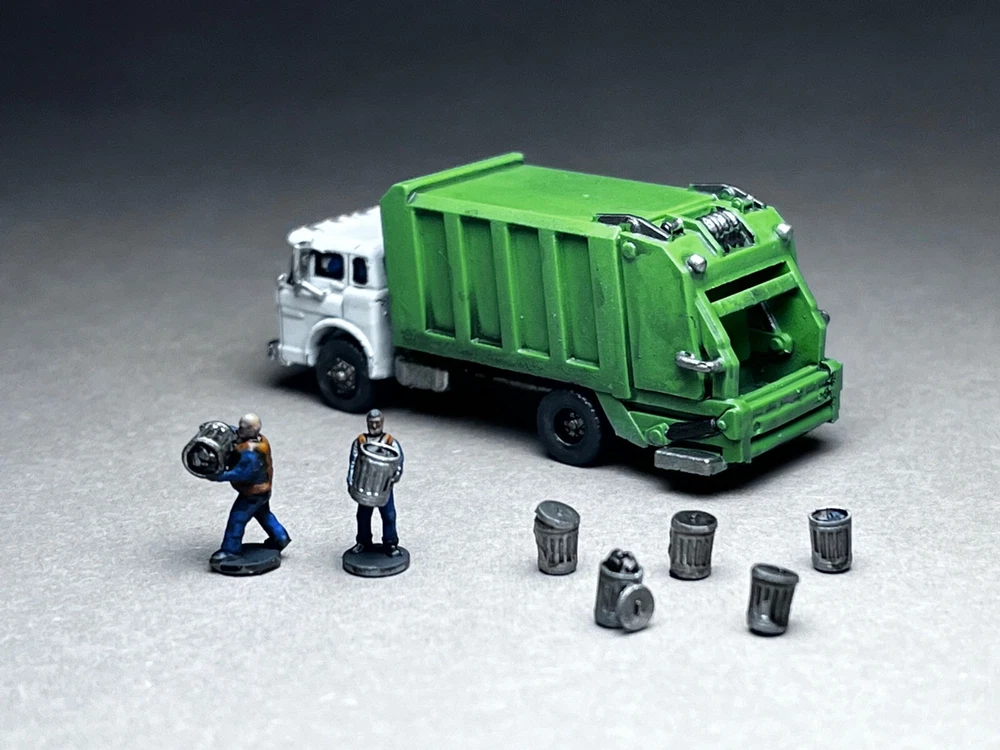This is NOT a toy and it is NOT appropriate for children. This is a model for adult train enthusiasts, collectors and modellers. Please note this is N Scale (1:160 or about 12mm human figure) model and is slightly larger than my average wargaming models. Ford C600 COE (Cab Over Engine) Garbage Truck. The set includes 2 crew members with integrated bases (great for temporary layouts or if you simply do not wish to glue down figures on your layout or like to rearrange things often) and 5 unique trash cans (as seen in photos). These trucks were very common across wide range of industries. Manufactured from 1957-1990. This is the unsung hero of bygone era! Other figures seen in photos are NOT included. NOTE to train guys - This model was designed specifically to be printed at N scale. The small detail has been beefed up to allow for safe handling and easy painting. What you see in photo is the real model, not high-definition computer rendition that is IMPOSSIBLE to print. When shopping for N scale vehicles (at igMakes or other sellers), always look for photographs of printed models. Unscrupulous sellers will show off high-detail models that simply cannot be reproduced on small N scale print regardless how good printer or resin they use. The big red flag is lack of actual model photos, instead you are presented with gray computer CAD rendition of what model looks like. If a model was not designed for N scale, scaling down will result in small detail dissolving, or if they do print successfully, the fragility will not allow for safe handling or will break during shipment! i.e. an inch diameter antenna on large model shrunk to N scale will be sub-milimeter and will break of the moment you touch it - assuming it survives the shipping igMakes N scale model difference: 1. built from ground up for N scale, all detail will print flawlessly and allow for safe handling 2. I DO NOT hollow my models EVER! You will love the solid hefty chunk of resin feel in your hand! There is ZERO chance of uncured resin pouring out. Beware of "clear resin" scam where sellers claim the purpose was insertion of lights. They are hollowing models to save on resin and result is often raw resin dripping out of the model. 3. Our flawed prints go to trash and are NEVER sold to customers! 4. Our models comes with REMOVED SUPPORTS. Remaining micro supports can be scrubbed off with wooden toothpick. NO MORE WIRE CUTTERS nightmares and broken models!! 5. Our prints are thoroughly washed and ready to be primed and painted 6. I personally printed and painted all models you see in photos - what you see is exactly what you will get UNPAINTED 7. 14 days warranty - not happy with my model for ANY reason, send them back (you cover return shipping) for full refund of purchase price (shipping excluded) 8. Most models are already printed, in-stock and ship same or next day! No more waiting for weeks and wondering if you will ever receive your order. We make NO EXCUSES, we make models instead. 9. 100% NO-BS customer service!! We will work with you! We are a passionate small family business and we value your time and the fact you chose to spend your money on our models! 10. ig (the designer and the store owner) is big tabletop wargamer and N scale train enthusiast (C&O, Virginia, Southern). I know what works and how to make models right! My PROMISE is never to sell anyone inferior junk just in order to make few bucks. Because we make our own models, when there is a problem, we go back to CAD and fix it! One (1) truck included. Included figures are UNPAINTED. NO other figures in photo background are included. If you are interested in painted figures, please contact me for more info. This is an unique in-house design and print. 100% Made in USA! THANK YOU for your consideration! ig